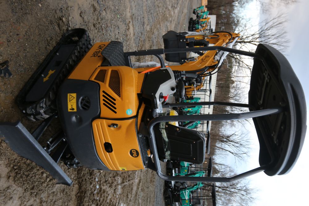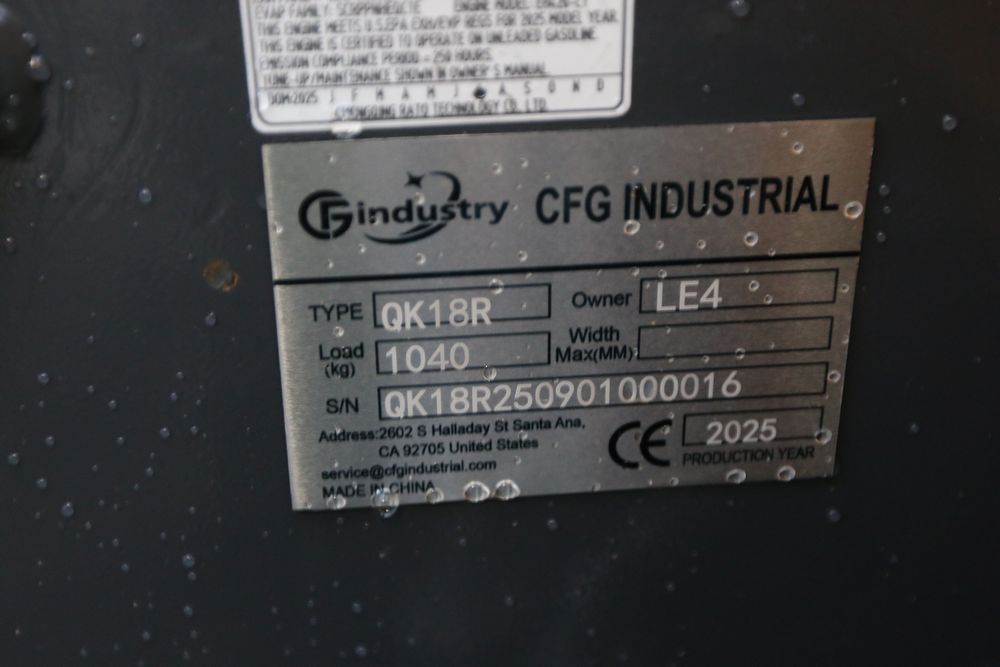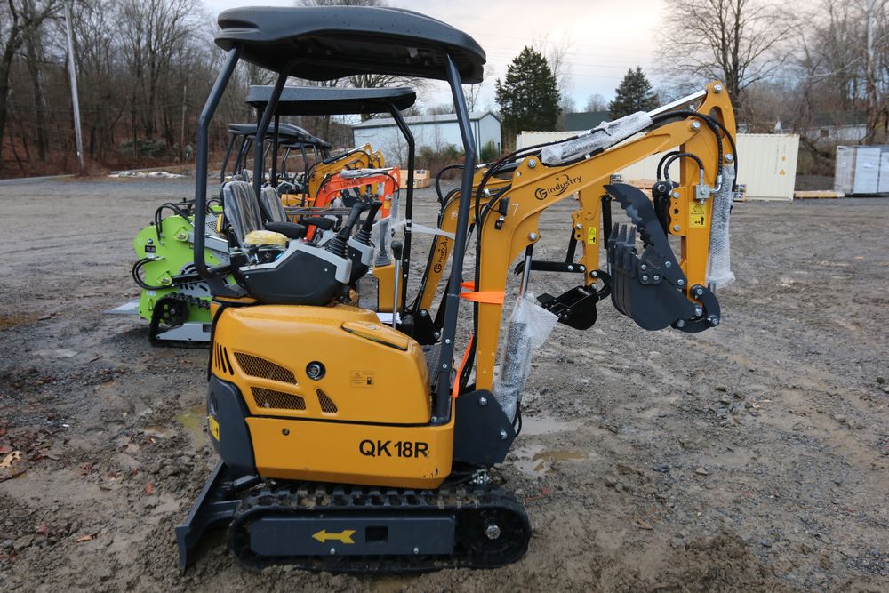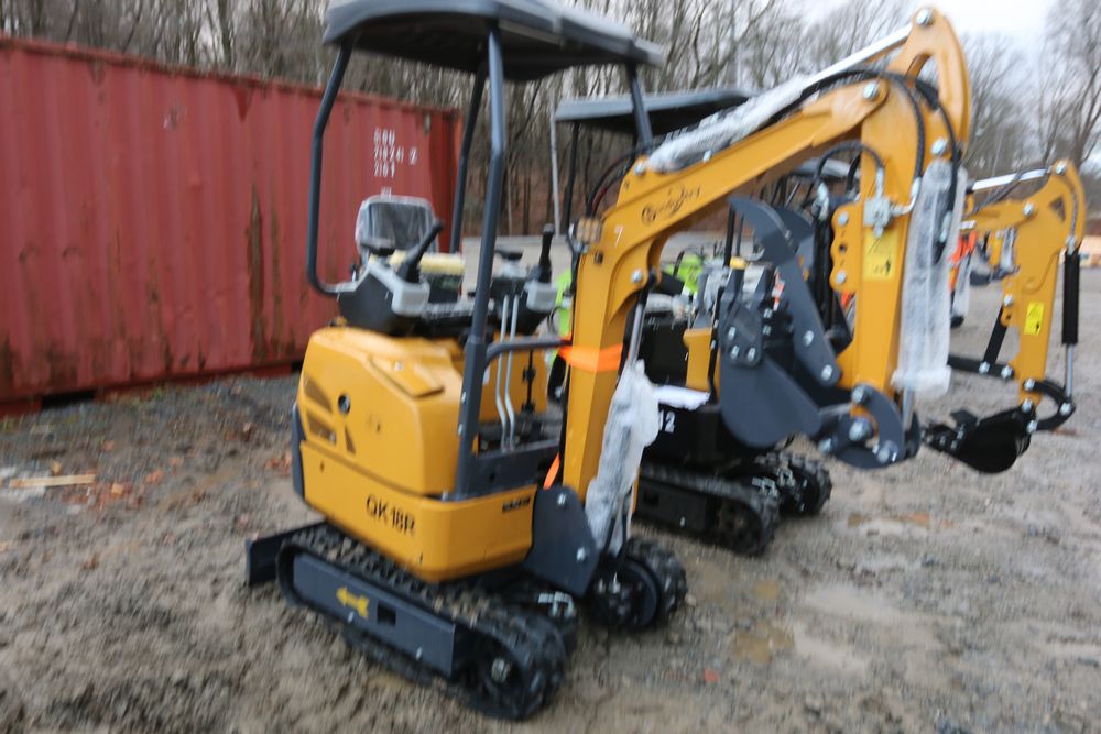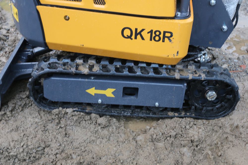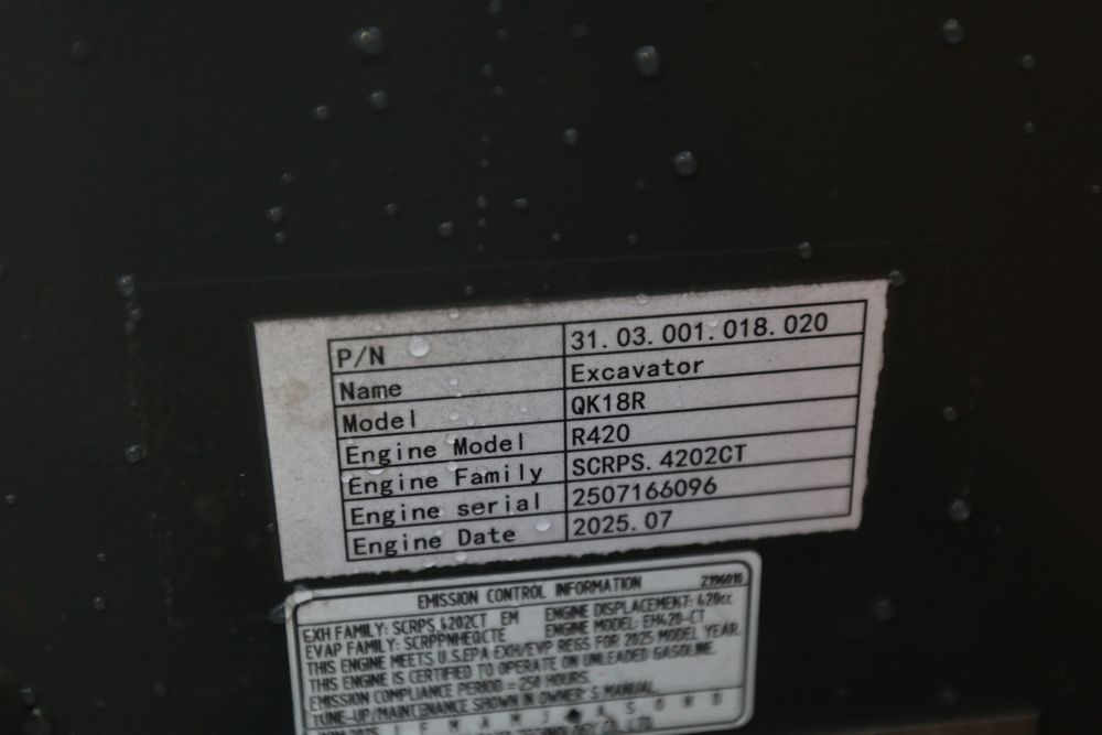 New 2025 CFG mini excavator, model QK18R, RATO, 13.5HP, 8.6KW, with pilot system, hydraulic thumb, rubber tracks, dozer blade, and gasoline engine. Hours reading less than one hour.