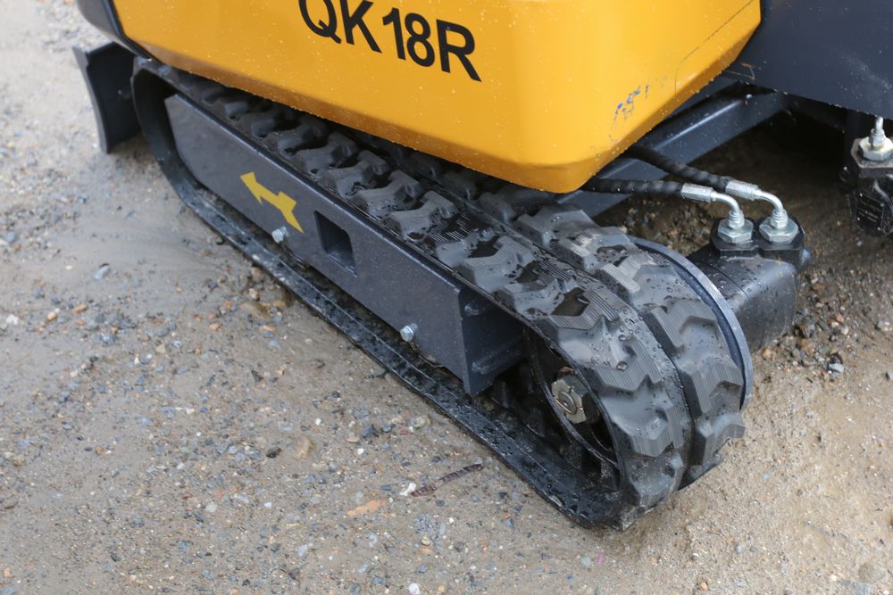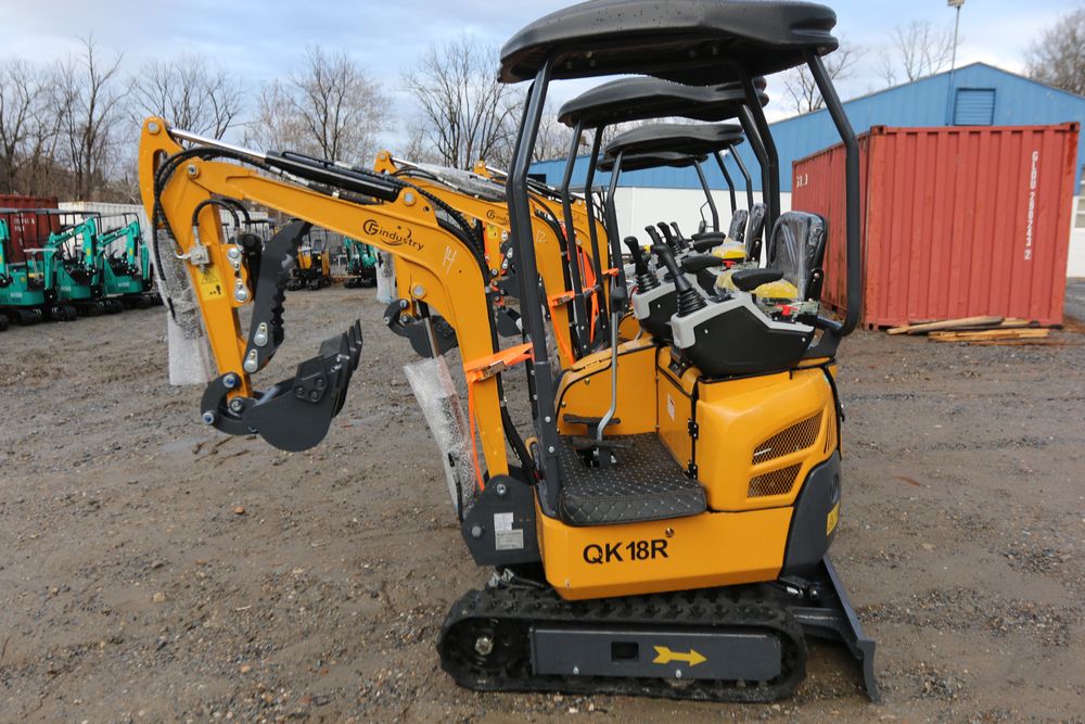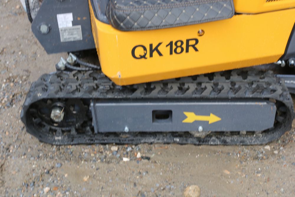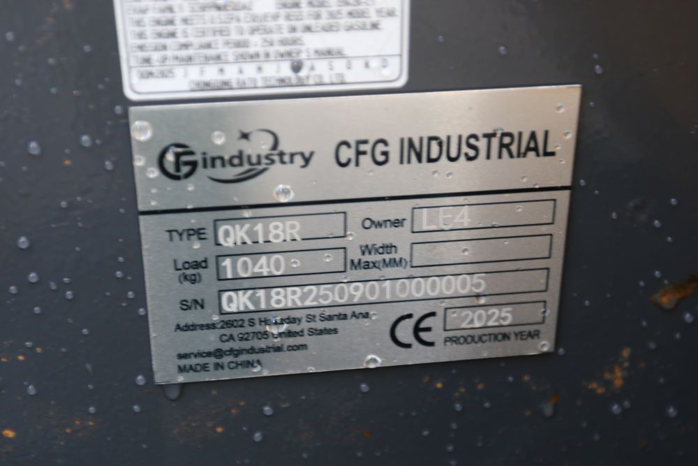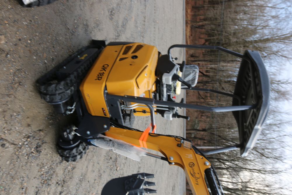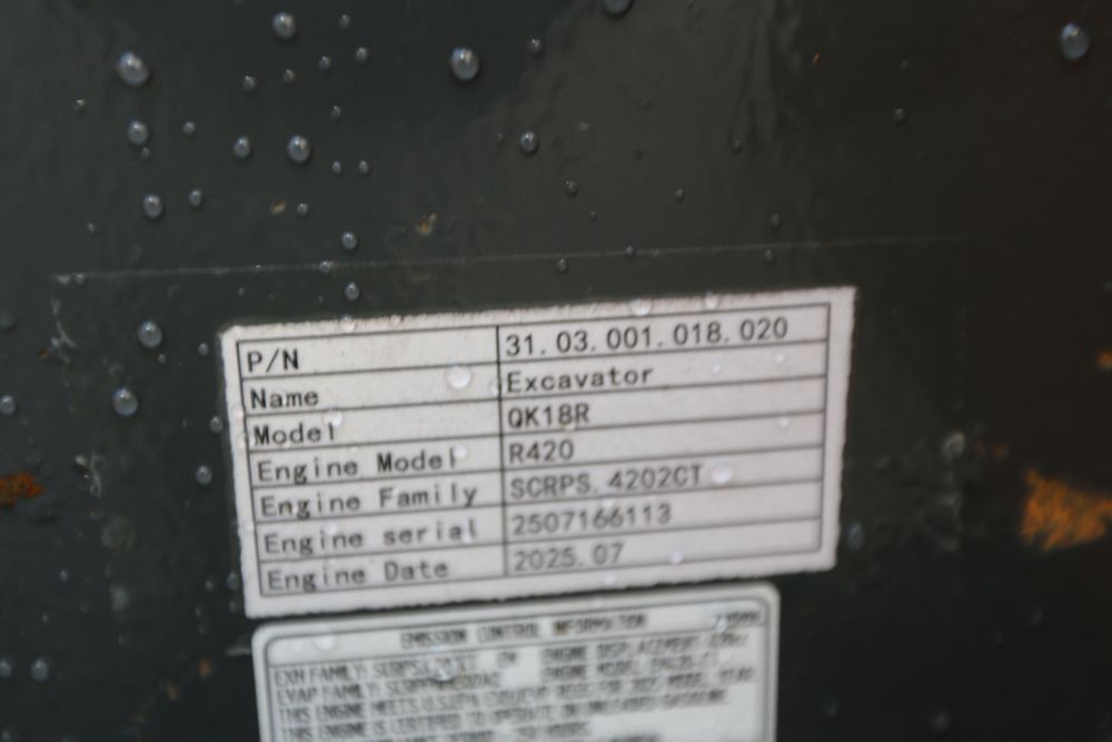 New 2025 CFG mini excavator, model QK18R, RATO, 13.5HP, 8.6KW, with pilot system, hydraulic thumb, rubber tracks, dozer blade, and gasoline engine. Hours reading less than one hour.