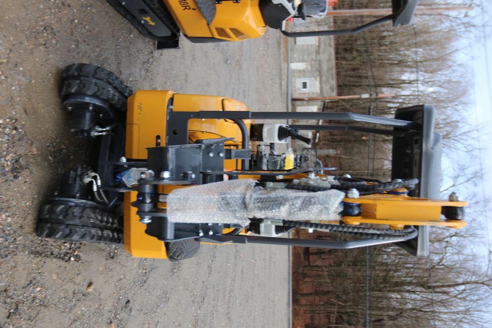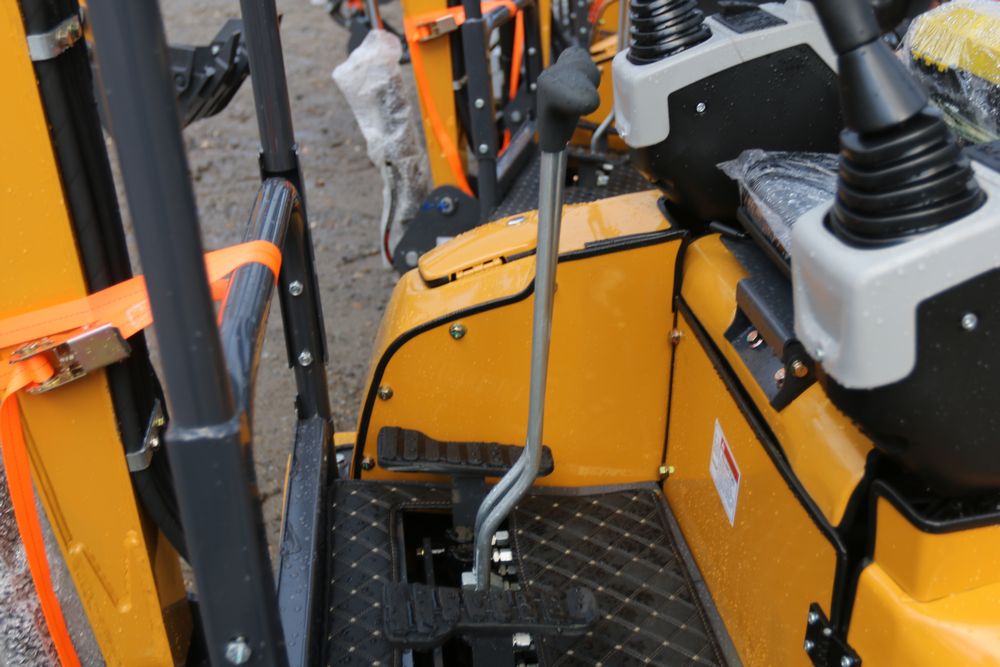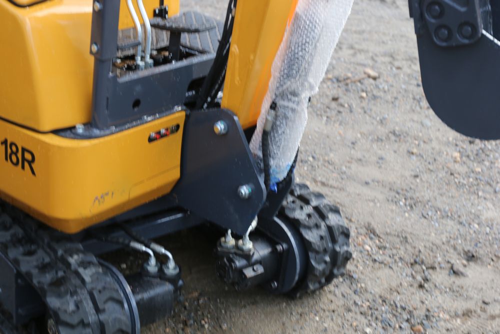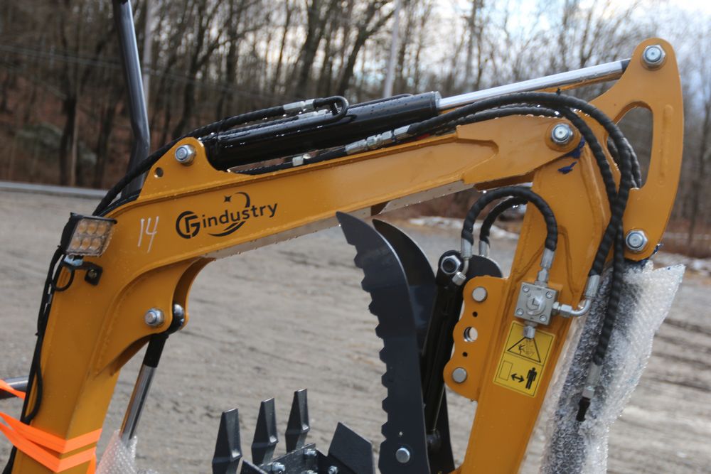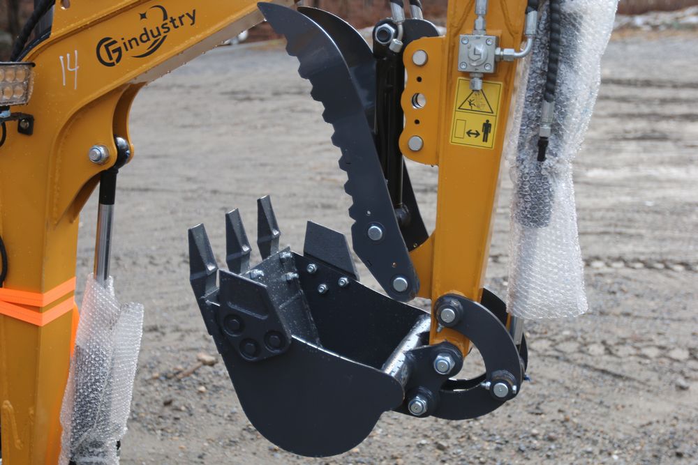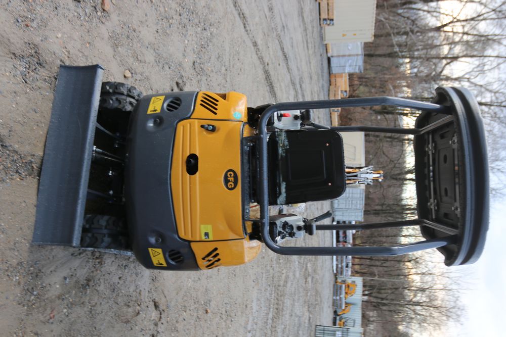 New 2025 CFG mini excavator, model QK18R, RATO, 13.5HP, 8.6KW, with pilot system, hydraulic thumb, rubber tracks, dozer blade, and gasoline engine. Hours reading less than one hour.