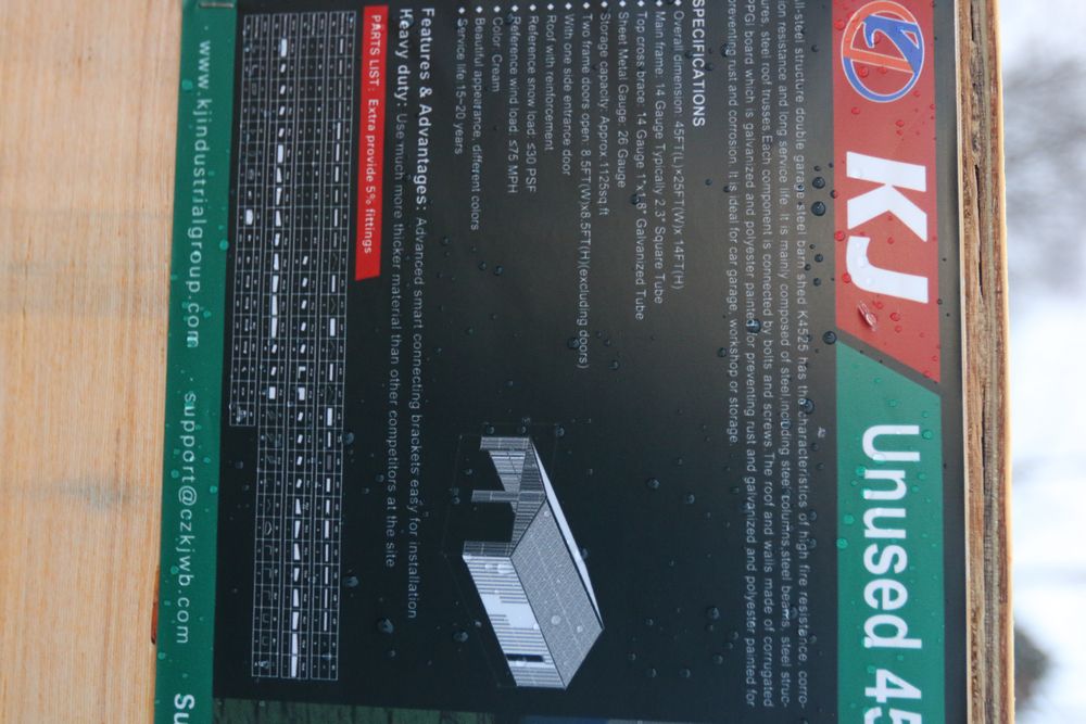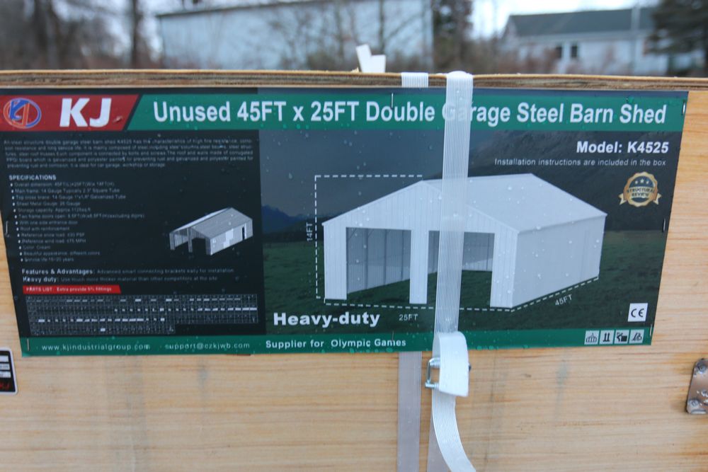 New KJ unused 45ft. x 25ft. double garage steel barn shed model K4525, in wood crate.