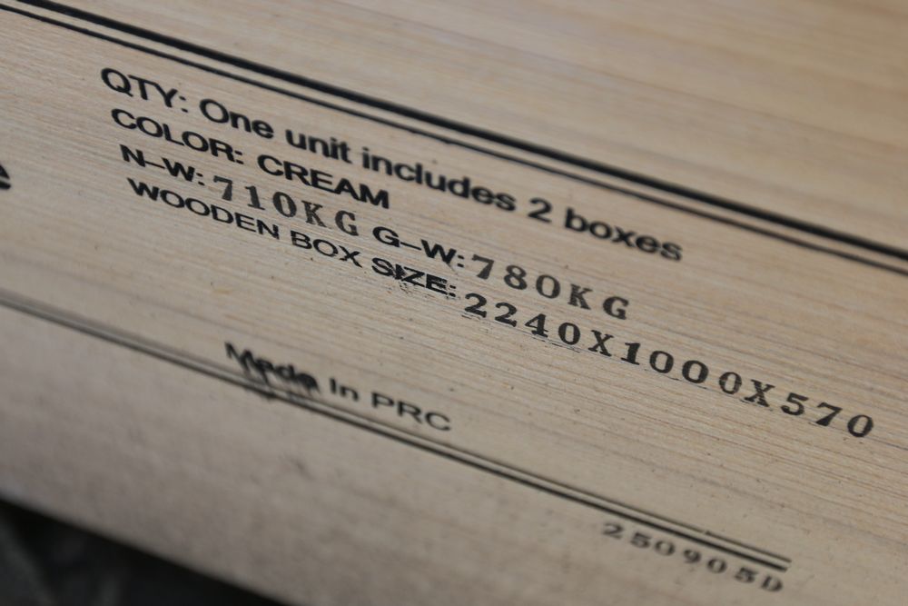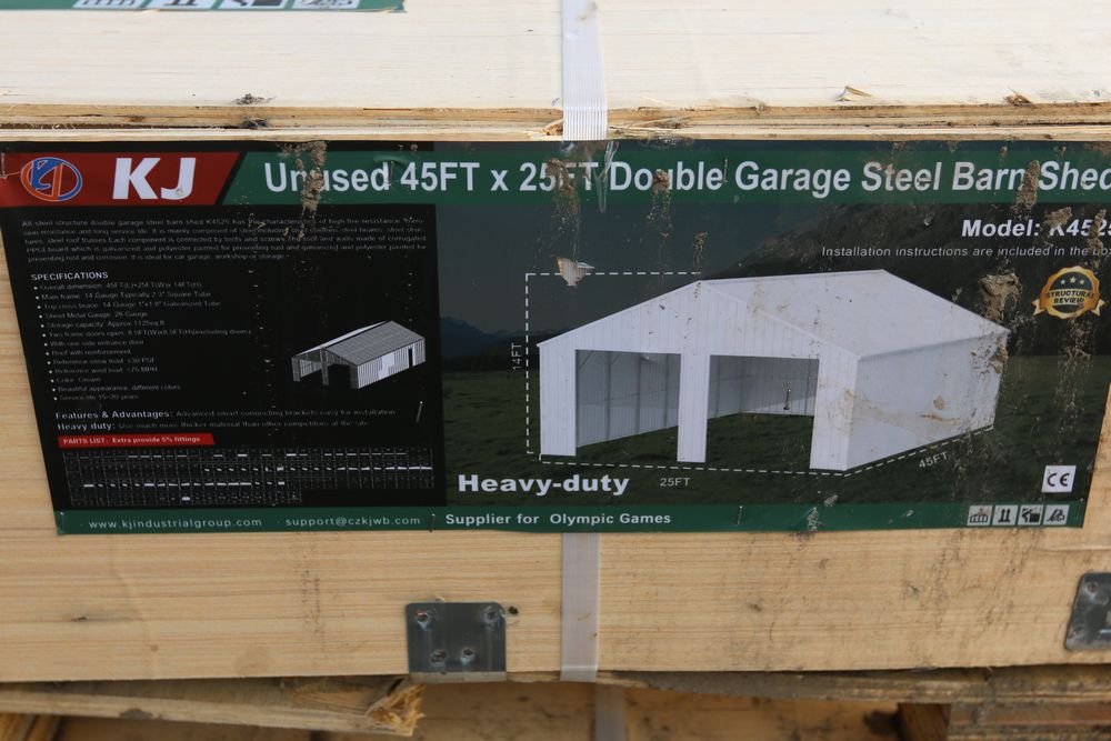 New KJ unused 45ft. x 25ft. double garage steel barn shed model K4525, in wood crate.