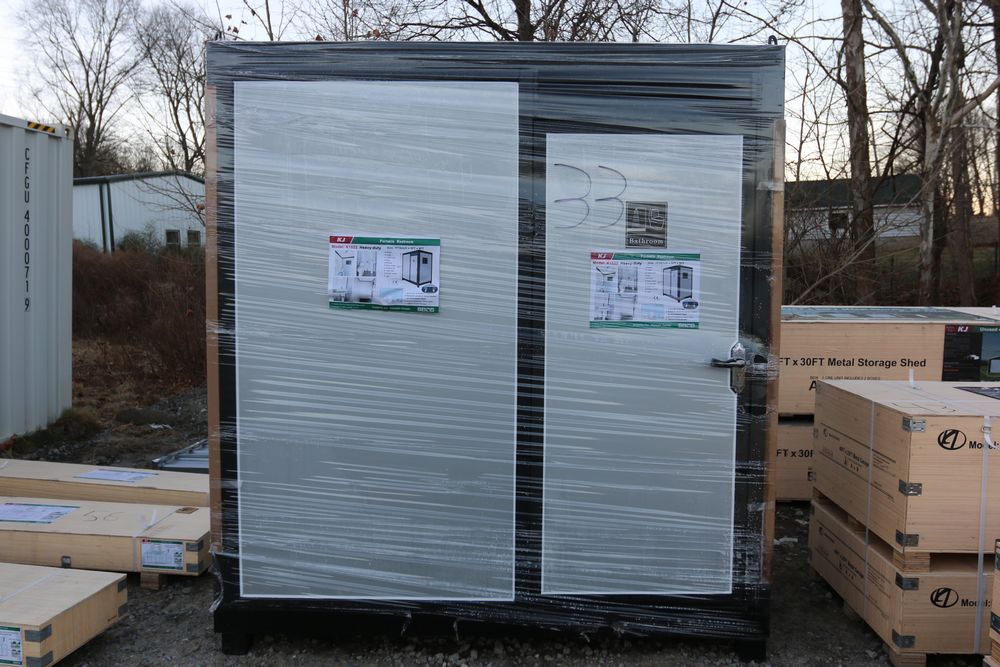 New 2025 KJ portable restroom 7'4" X 5' X 8', includes shower, toilet, toilet brush, sink, window, paper holder, exhaust fan, towel rack, shower curtain, light, model K1522.