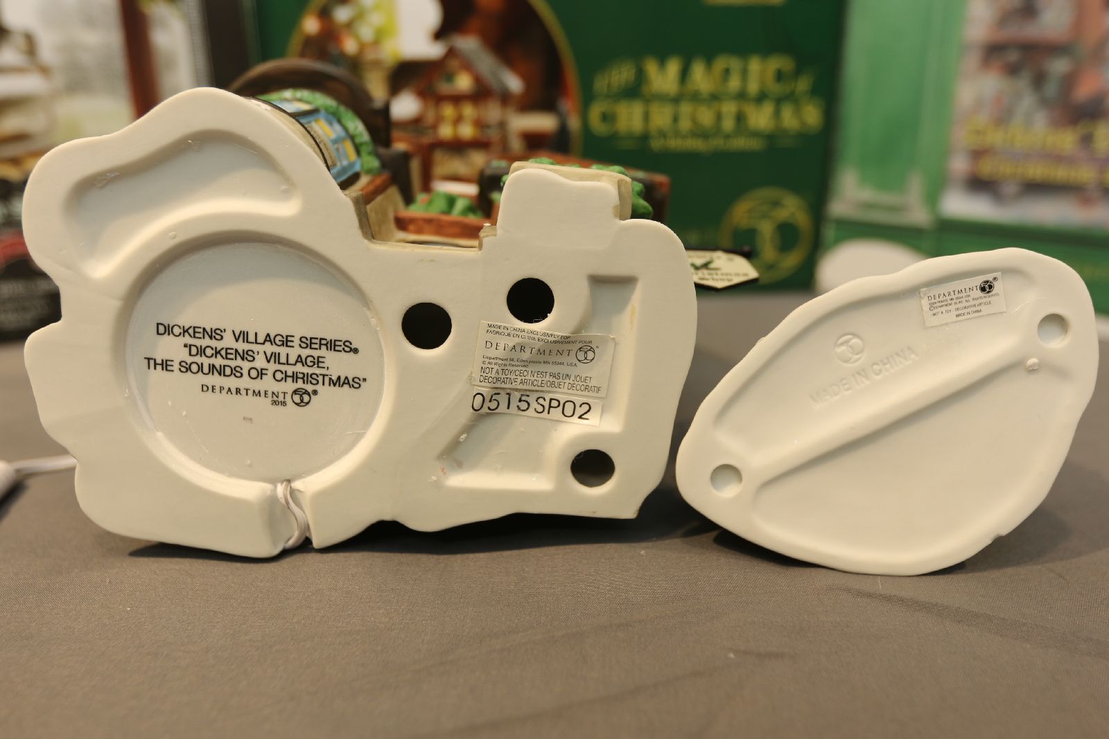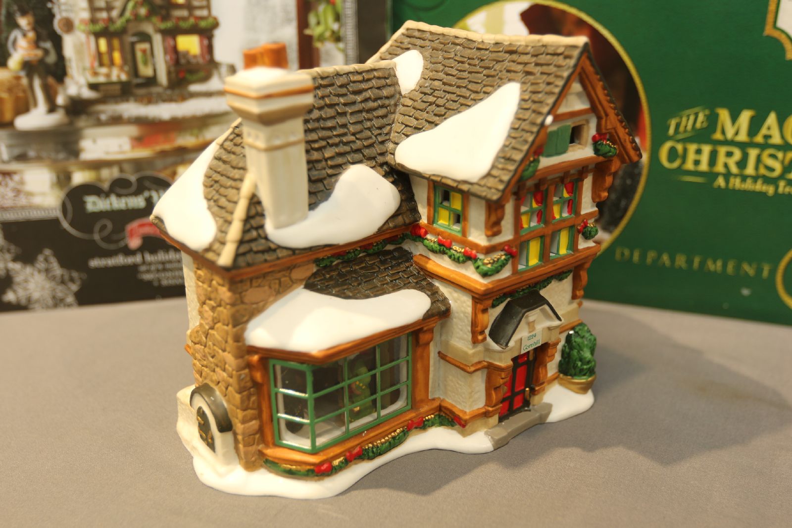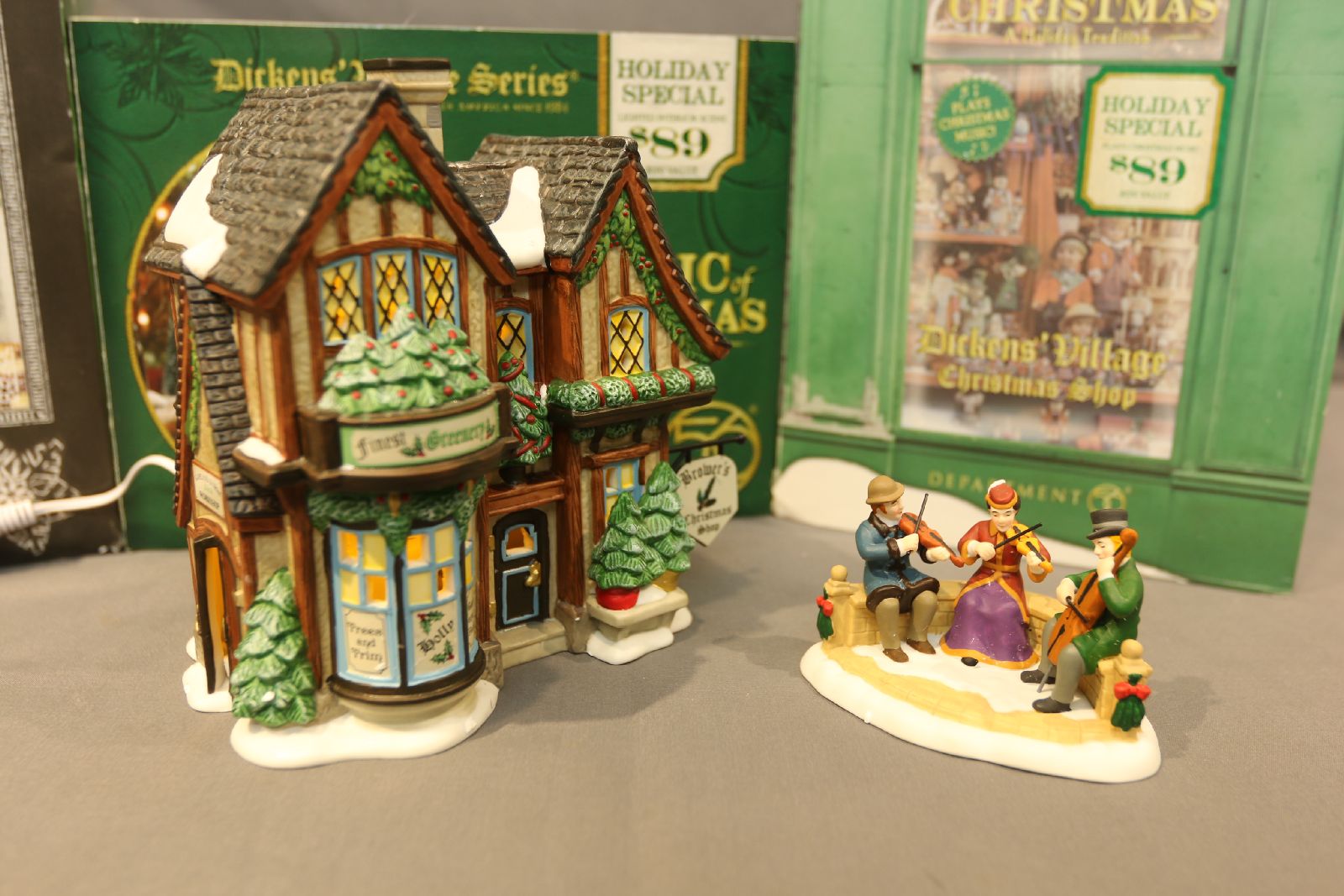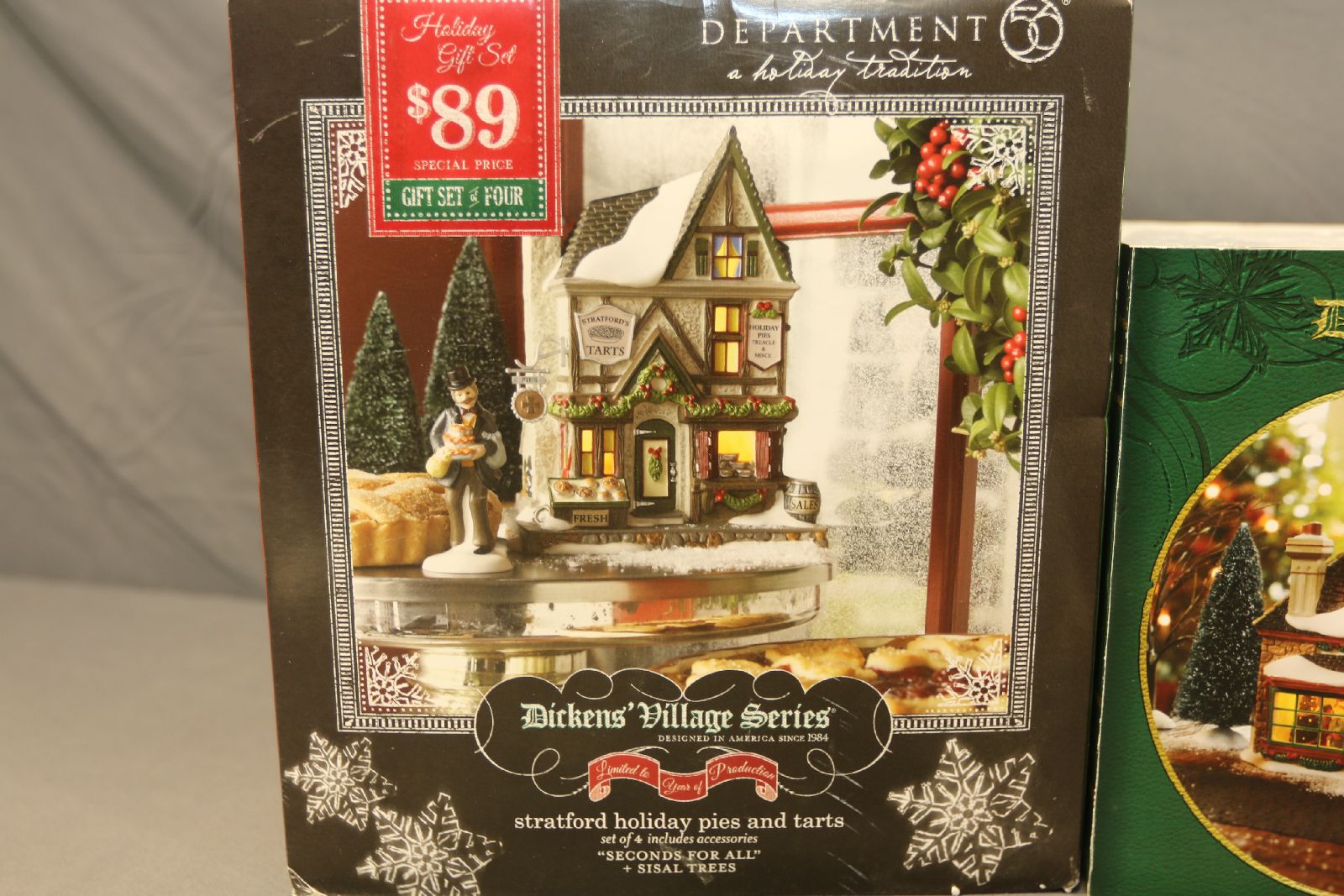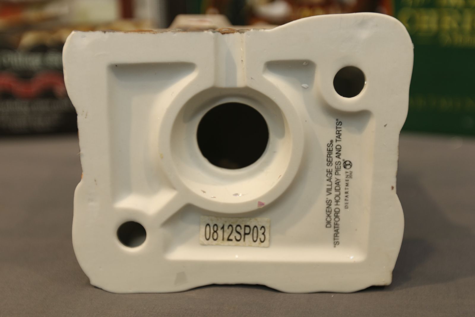 Department 56 Dickens Village Series Buildings and Accessories. Includes "Stratford Holiday Pies and Tarts", "Dickens' Village, The Magic of Christmas", and "Dickens' Village, The Sounds of Christmas" with original boxes. Conditions may vary.