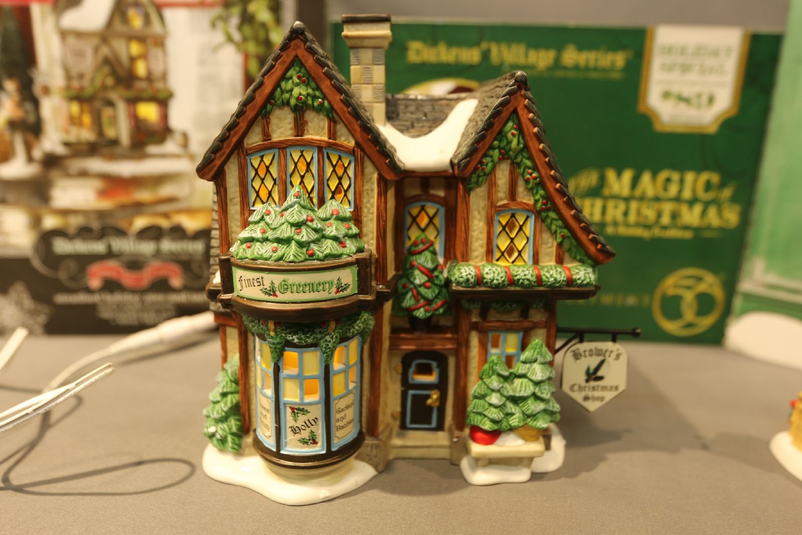 Items are Department 56 Dickens Village Series Buildings & Accessories from one collector. Items include "Stratford Holiday Pies and Tarts"; "Tegan's Toy Shoppe," "Burwickglen Golf Clubhouse," illuminated buildings: Brandon Mill, Devonshire Creamery," "Boar's Bacon & Candied Hams"; Porcelain Buildings & Accessories. Includes "A Christmas Carol" series: "M Fezziwig Warehouse," "Scrooge & Marley," Heritage Village Figurines & Accessories. Includes various figurines like "Not too Fast, Please," "Town Blacksmith," "To the Manor Born"; Village Series and Village Accessories Figurines. Includes "Buyer one for Prosperity," "Backyard Bird Houses,"; holiday decorations: snowmen figurines, holiday-themed trees, Christmas lights & more. Items are located in Pleasant Valley, NY.