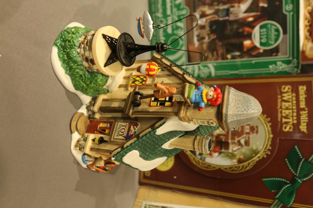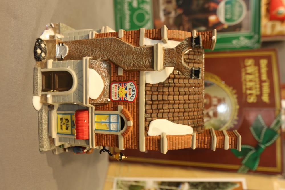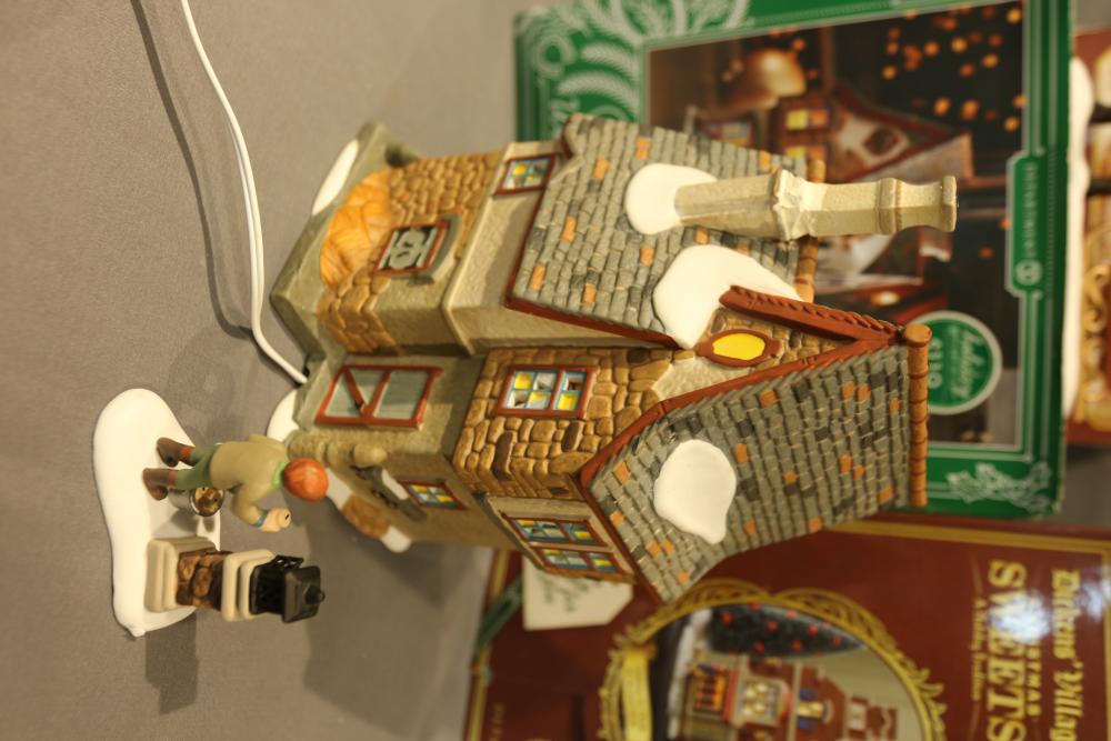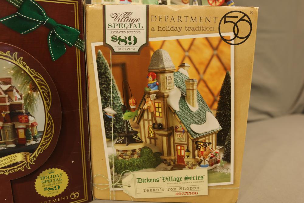 Items are Department 56 Dickens Village Series Buildings & Accessories from one collector. Items include "Stratford Holiday Pies and Tarts"; "Tegan's Toy Shoppe," "Burwickglen Golf Clubhouse," illuminated buildings: Brandon Mill, Devonshire Creamery," "Boar's Bacon & Candied Hams"; Porcelain Buildings & Accessories. Includes "A Christmas Carol" series: "M Fezziwig Warehouse," "Scrooge & Marley," Heritage Village Figurines & Accessories. Includes various figurines like "Not too Fast, Please," "Town Blacksmith," "To the Manor Born"; Village Series and Village Accessories Figurines. Includes "Buyer one for Prosperity," "Backyard Bird Houses,"; holiday decorations: snowmen figurines, holiday-themed trees, Christmas lights & more. Items are located in Pleasant Valley, NY.