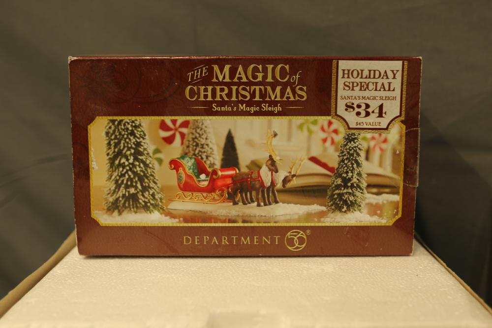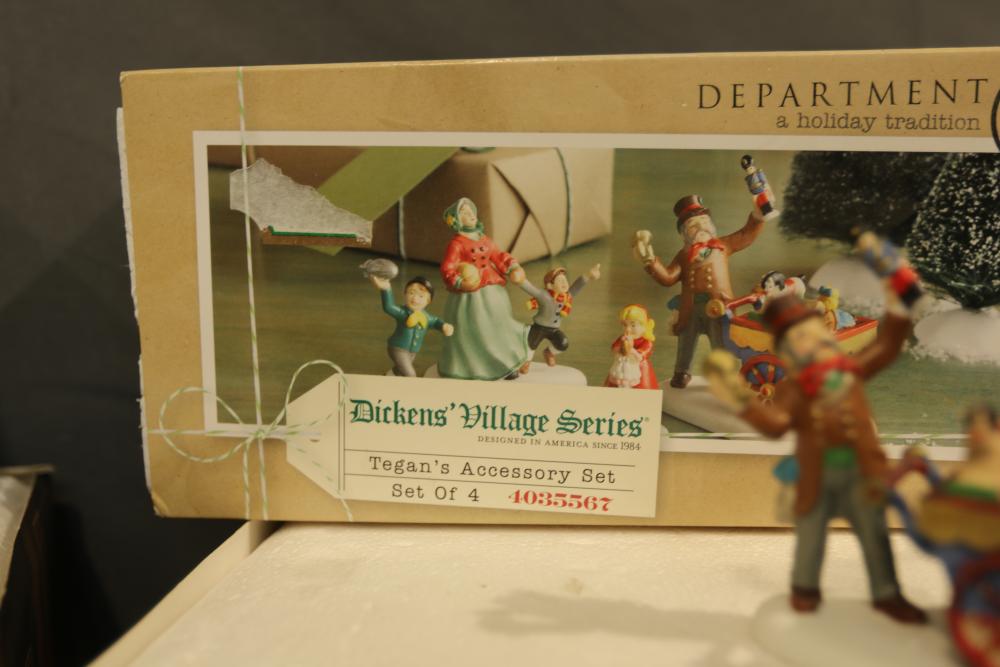 Department 56 Dickens Village Buildings and Accessories with Boxes. Includes "Dickens' Village, Welcoming Christmas," "Tegan's Toy Shoppe," "Tegan's Accessory Set," "The Magic of Christmas, Santa's Magic Sleight," "Sidewalk Sweets," in original boxes. Conditions may vary.