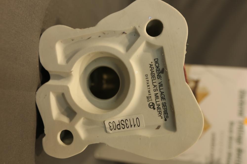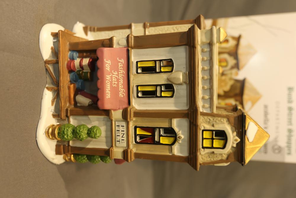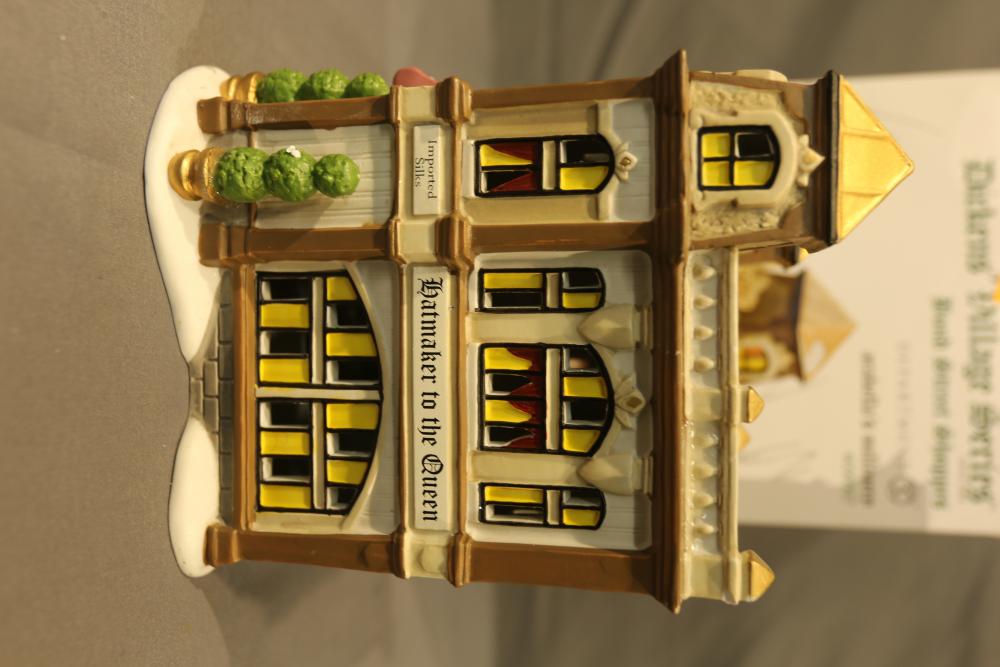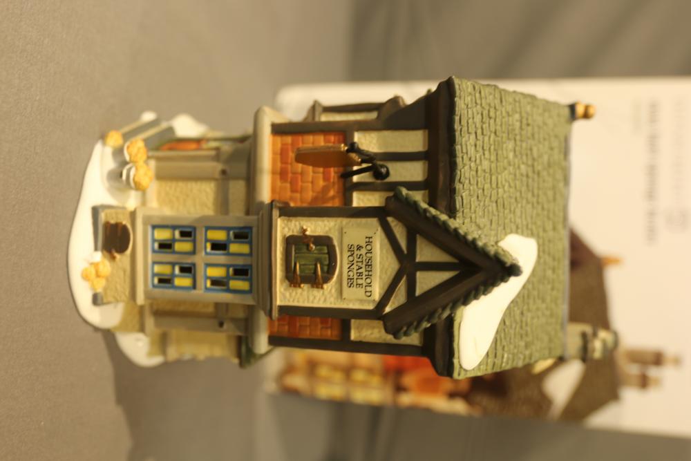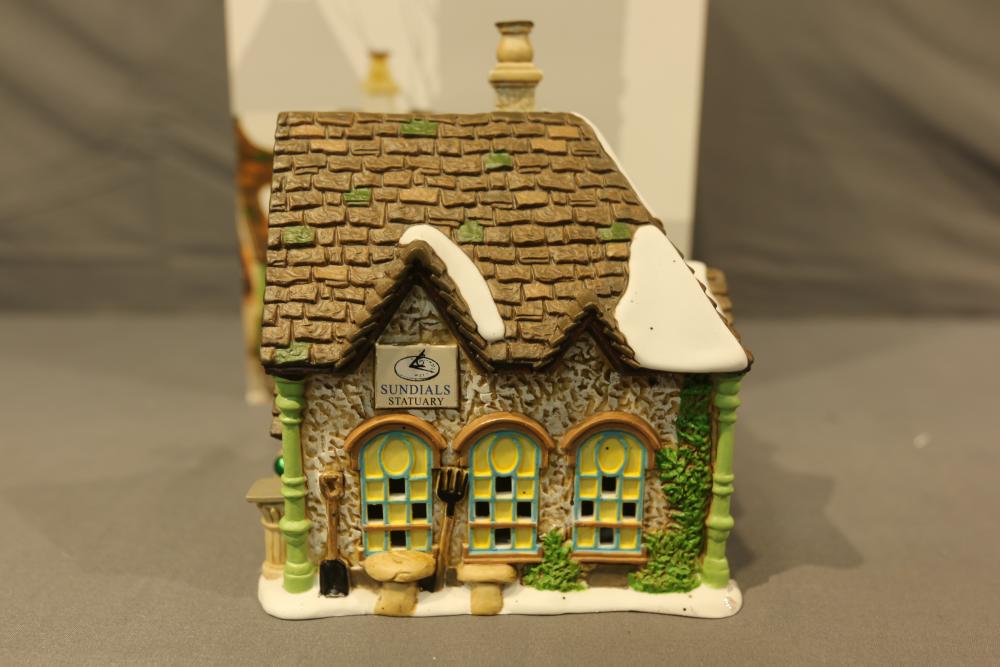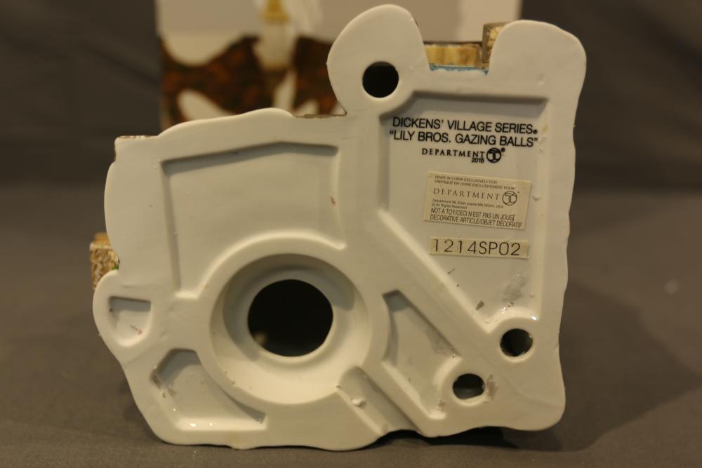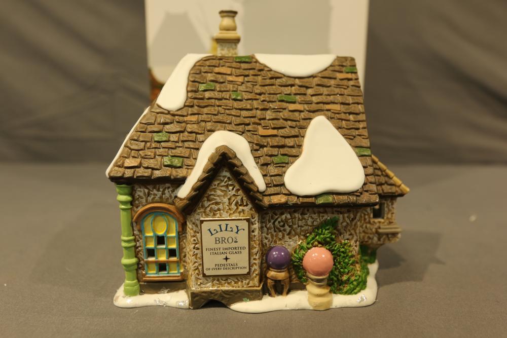 Department 56 Dickens' Village Series Lighted Buildings. Includes "Evan Hoxley, Spice Dealer," "Lily Bros. Gazing Balls," and "Bond Street Shoppes." with original box.