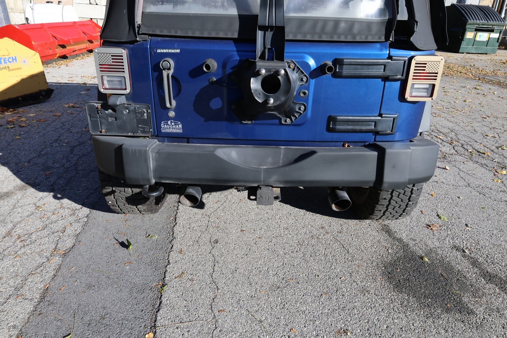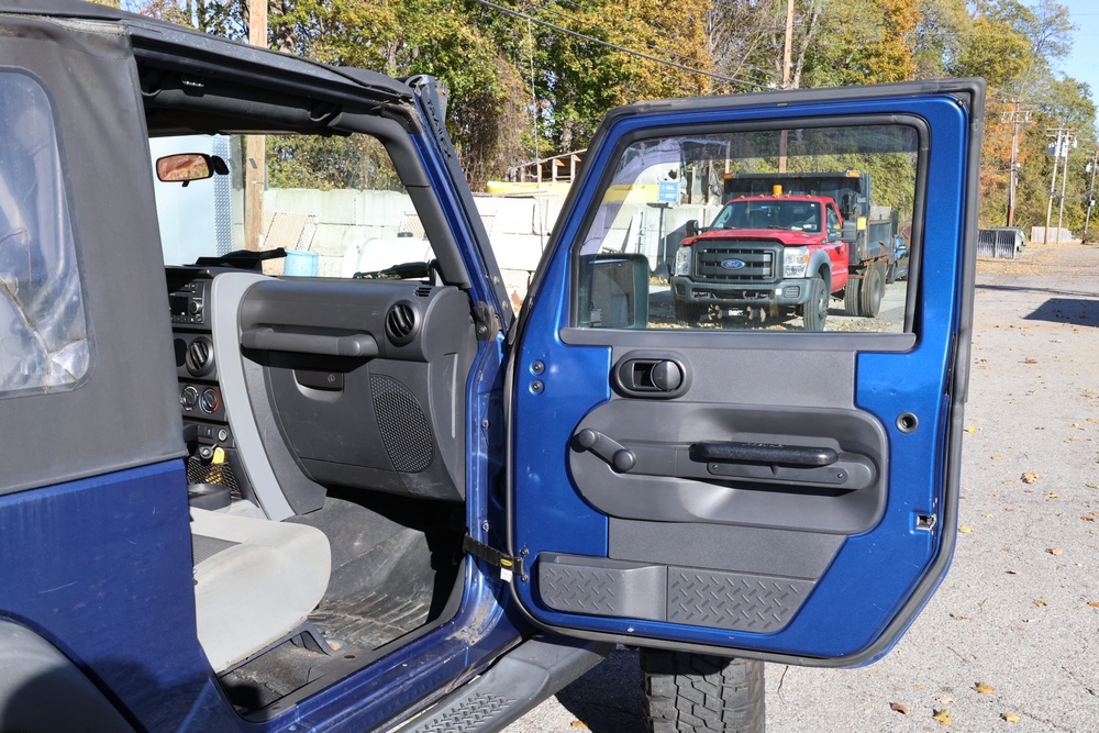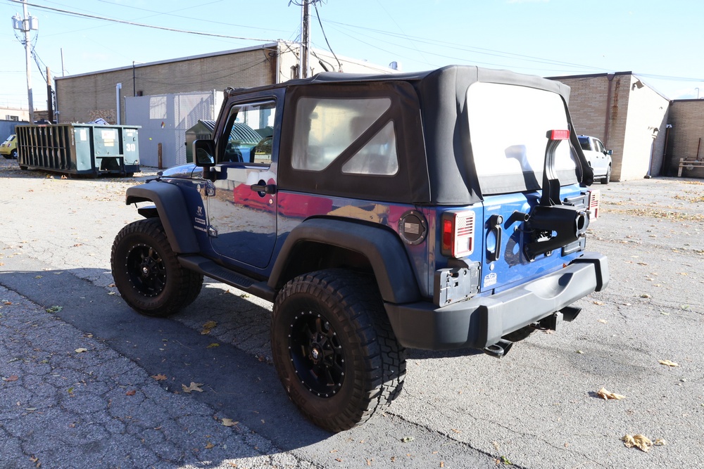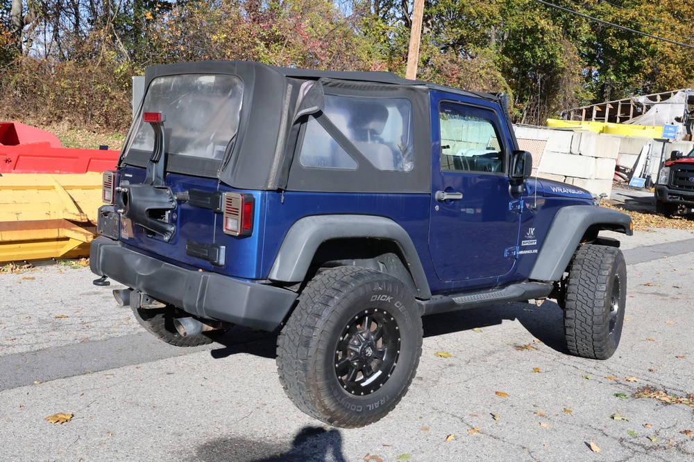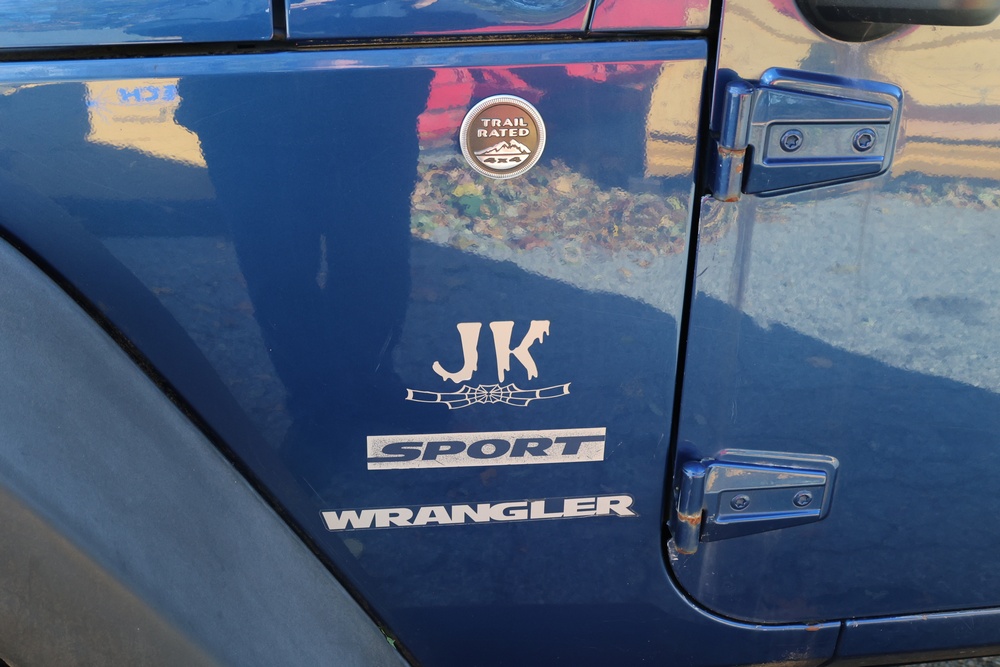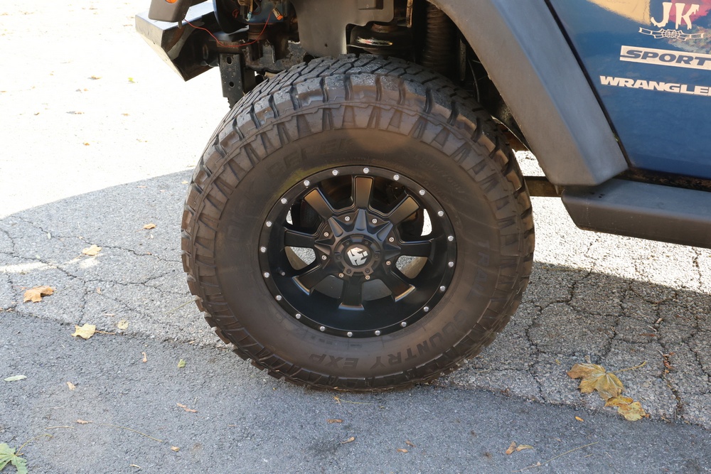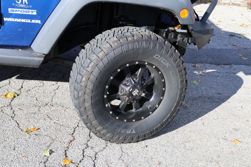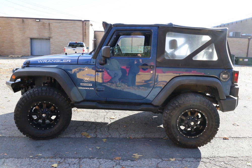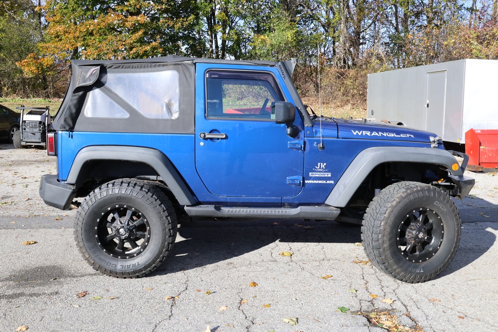2010 Jeep Wrangler Sport 4x4 two-door SUV with automatic transmission. VIN: 1J4AA2D17AL176344. Odometer reading: 145,502. Exterior: Blue with black aftermarket front bumper, hood latches, soft top, light bar, and large off-road tires mounted on black wheels. Interior: Gray and black front bucket seats, center console, automatic shifter, and standard dashboard with factory gauges. Tire size: P225/75R16. Additional equipment includes light bar, custom front bumper with D-rings and fog lights, side steps, and "Trail Rated" and "JK Sport Wrangler" decals. Title and key available. Seller reports: Runs and drives, motor replaced approx. 500 miles ago.
