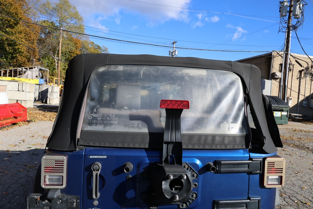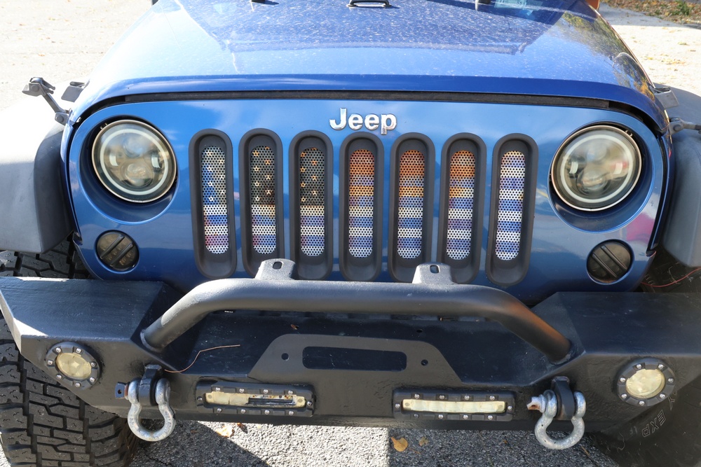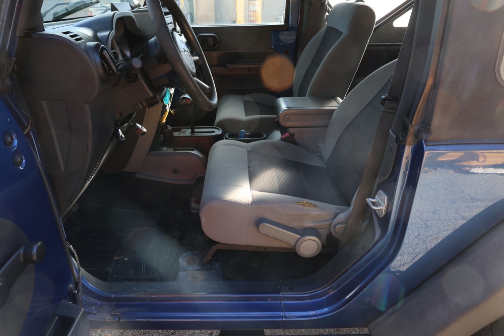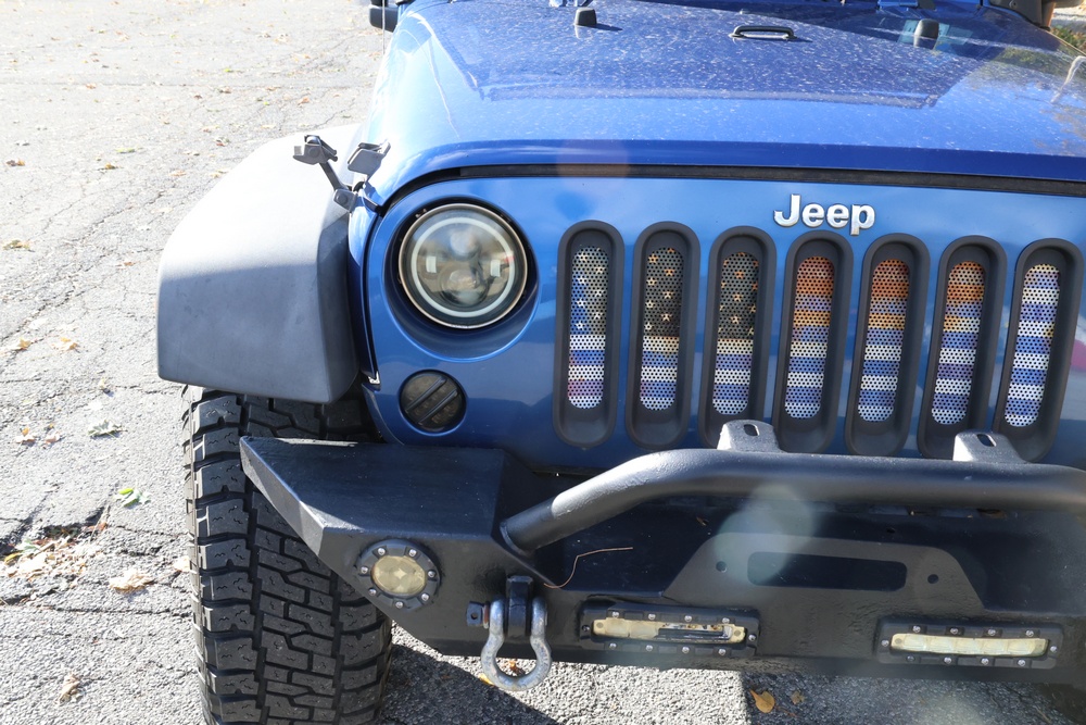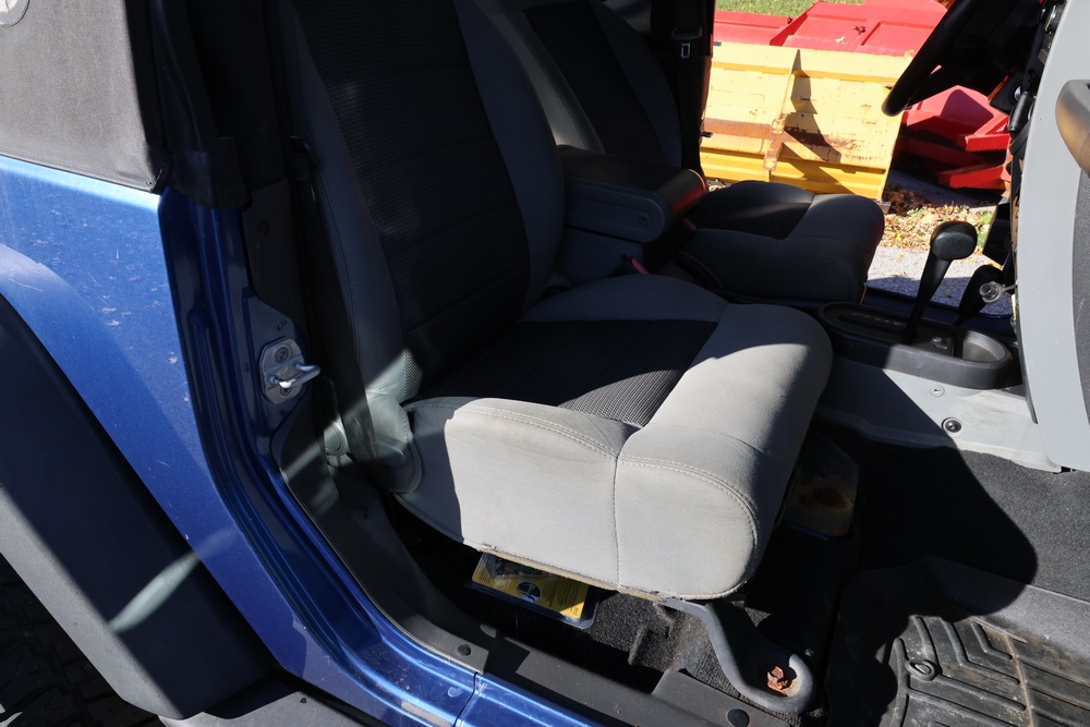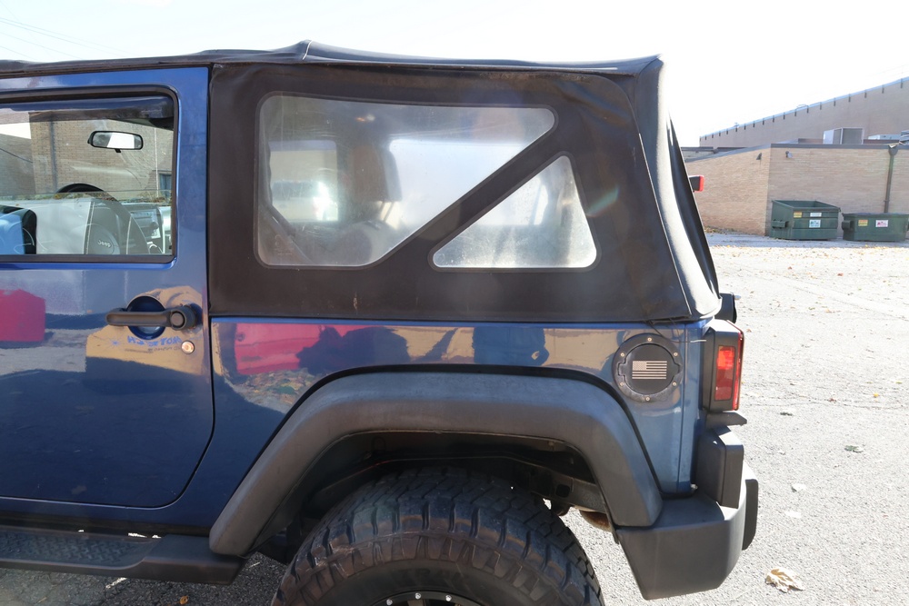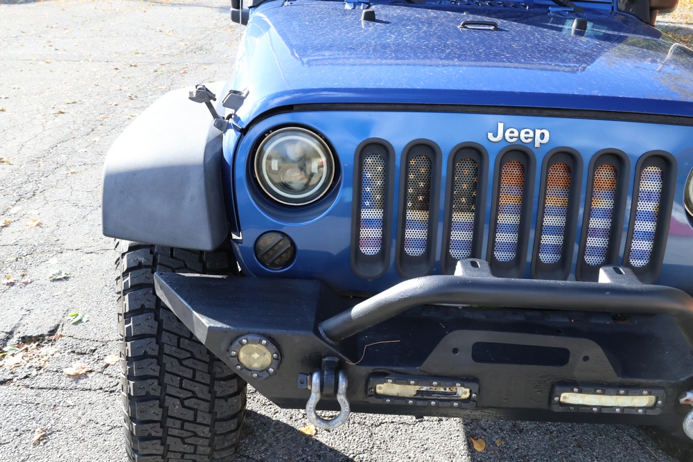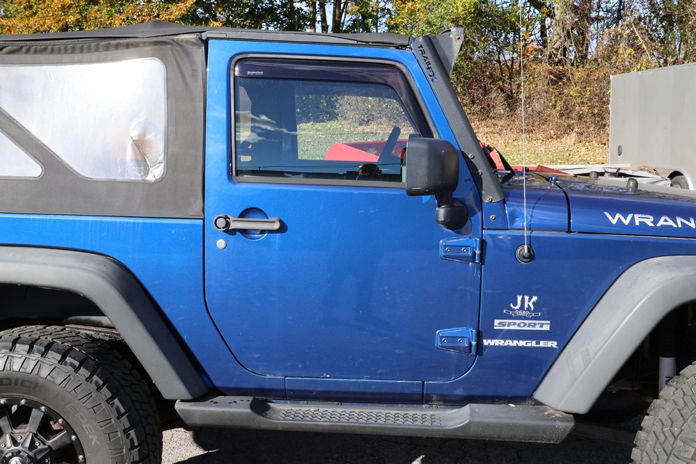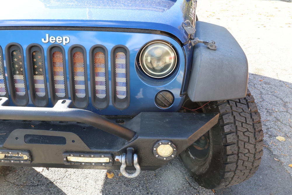 2010 Jeep Wrangler Sport 4x4 two-door SUV with automatic transmission. VIN: 1J4AA2D17AL176344. Odometer reading: 145,502. Exterior: Blue with black aftermarket front bumper, hood latches, soft top, light bar, and large off-road tires mounted on black wheels. Interior: Gray and black front bucket seats, center console, automatic shifter, and standard dashboard with factory gauges. Tire size: P225/75R16. Additional equipment includes light bar, custom front bumper with D-rings and fog lights, side steps, and "Trail Rated" and "JK Sport Wrangler" decals. Title and key available. Seller reports: Runs and drives, motor replaced approx. 500 miles ago.