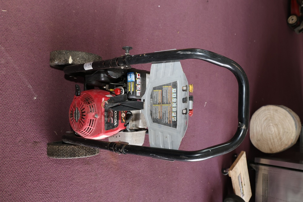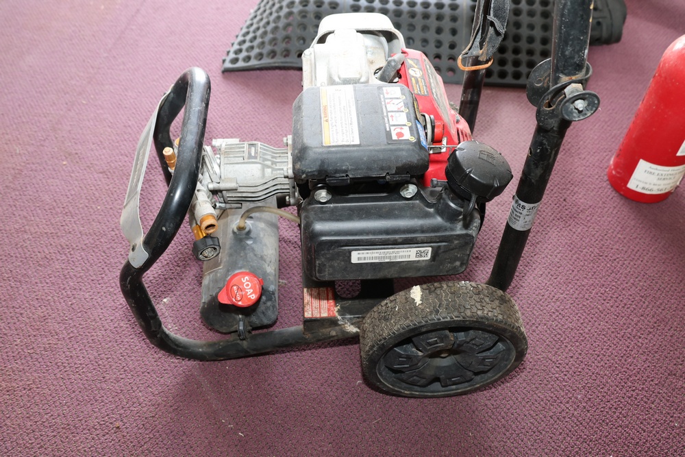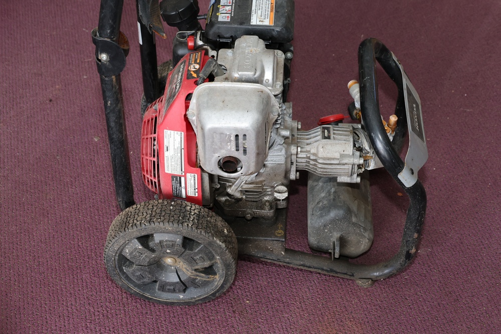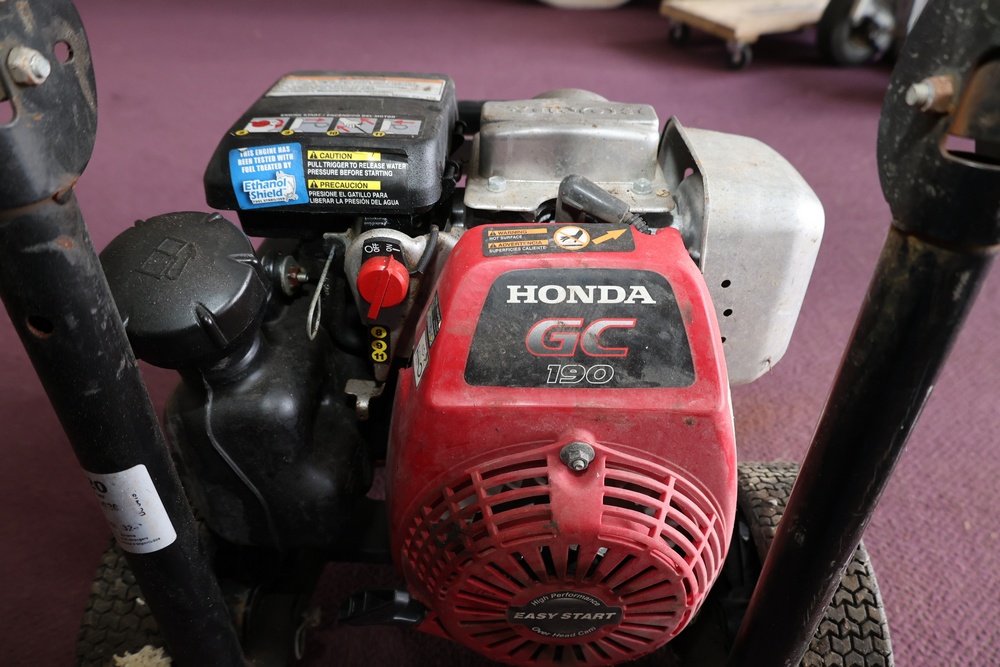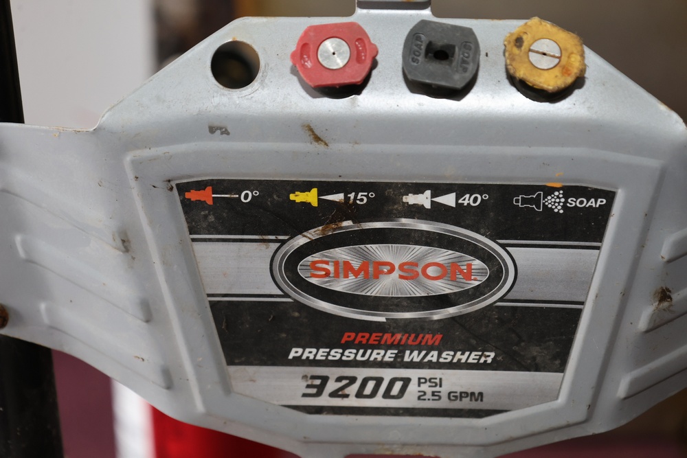 Simpson Premium Pressure Washer rated at 3200 PSI and 2.5 GPM, powered by a Honda GC190 engine (model GC190LA QHGF R280, serial GCAAA-3254021). The unit includes multiple quick-connect spray nozzles. Motor tuns, pump blown.