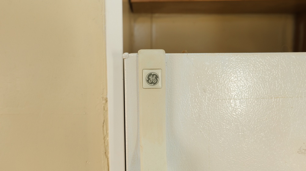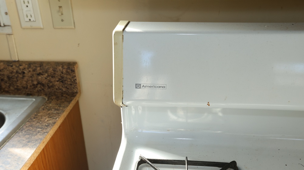 Inside features two bedrooms and one bathroom, various flooring styles, and painted walls, with windows throughout. The kitchen includes wood cabinets, laminate-style countertops, a single-basin sink, a free-standing gas range, and a refrigerator.