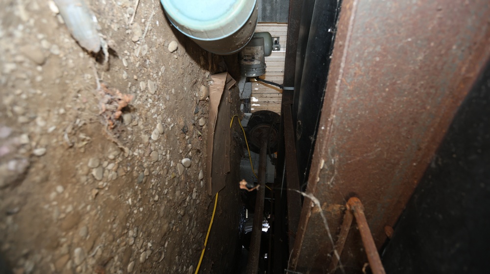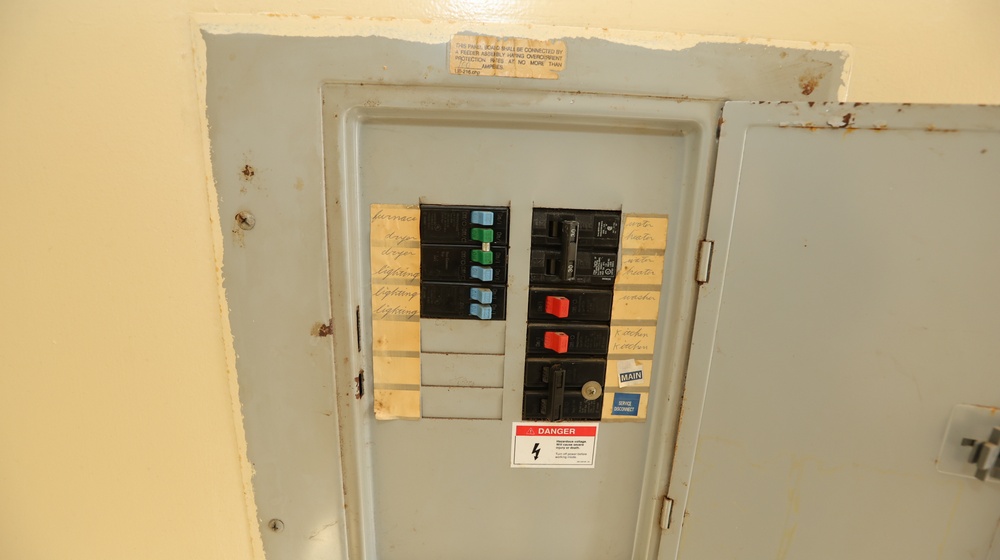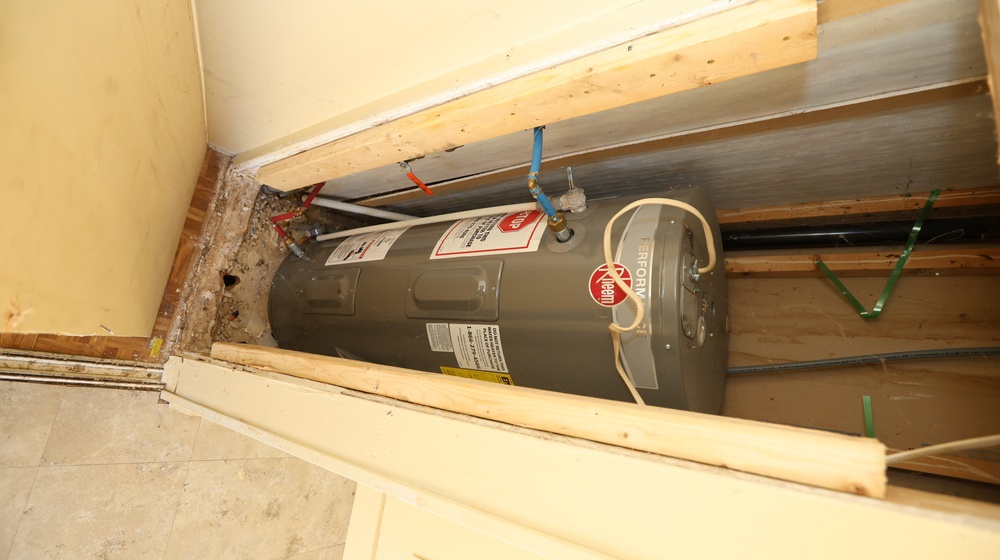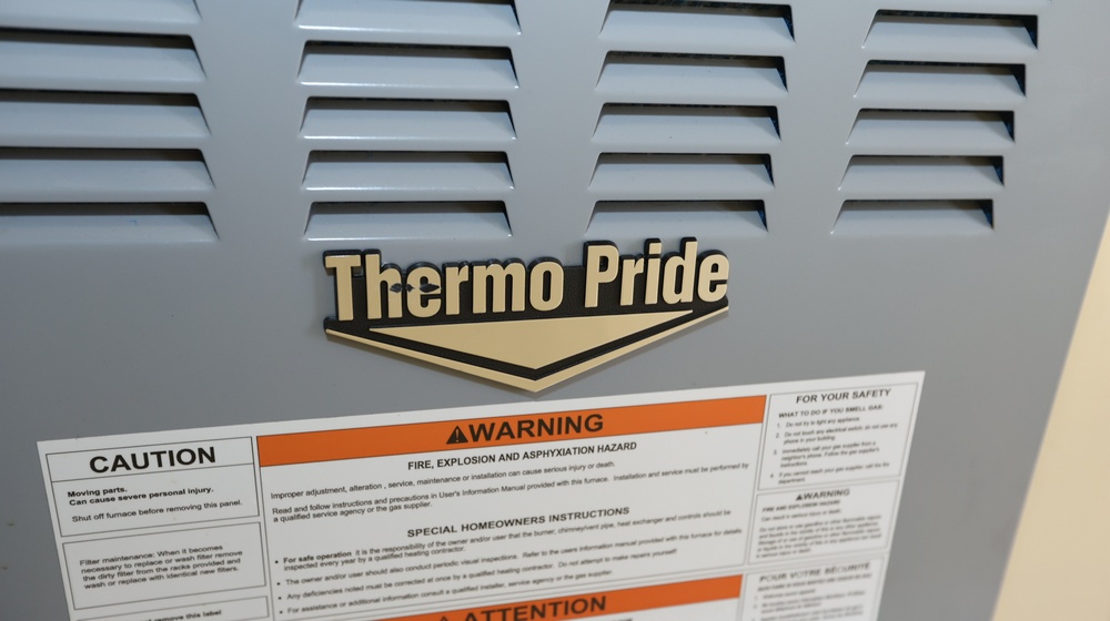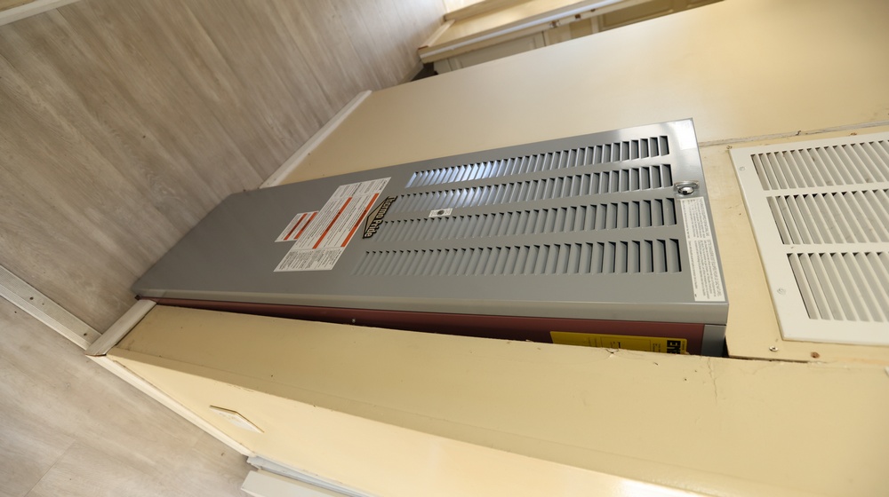 The bathroom includes a vanity with sink and a tub with shower surround. Mechanical and utility components include a Thermo Pride interior furnace unit, a Rheem electric water heater, and an interior electrical panel with breakers. Undercarriage components and utility connections are visible beneath the home.