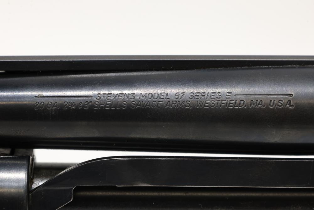 Stevens Model 67 Series E Savage Arms pump-action shotgun chambered in 20 GA, with wooden stock, ribbed rubber butt pad, and ventilated rib with bead front sight. Serial Number E139300. All lots are subject to all applicable laws at the time of transfer. NOTE: Semi automatic rifles and all handguns require a license in NYS. There is a $35 transfer fee per long gun. There is a $40 transfer fee per hand gun. There is a $20 transfer fee per ammunition lot. If you fail the background check, the transfer fee still applies, and you are still required to make payment and then reconsign the lot to auction. FFL dealers are not exempt from these fees. A background check will be required for all buyers purchasing a firearm and/or ammunition. NYS charges a background check fee for all firearms and ammunition. The fee is $9 for firearms and $2.50 for ammunition. The NYS fee is per background check NOT per lot, will be collected directly by Civil Armory, and is in addition to any transfer All lots are subject to all applicable laws at the time of transfer. NOTE: Semi automatic rifles and all handguns require a license in NYS. There is a $35 transfer fee per long gun. There is a $40 transfer fee per hand gun. There is a $20 transfer fee per ammunition lot. If you fail the background check, the transfer fee still applies, and you are still required to make payment and then reconsign the lot to auction. FFL dealers are not exempt from these fees. A background check will be required for all buyers purchasing a firearm and/or ammunition. NYS charges a background check fee for all firearms and ammunition. The fee is $9 for firearms and $2.50 for ammunition. The NYS fee is per background check NOT per lot, will be collected directly by Civil Armory, and is in addition to any transfer