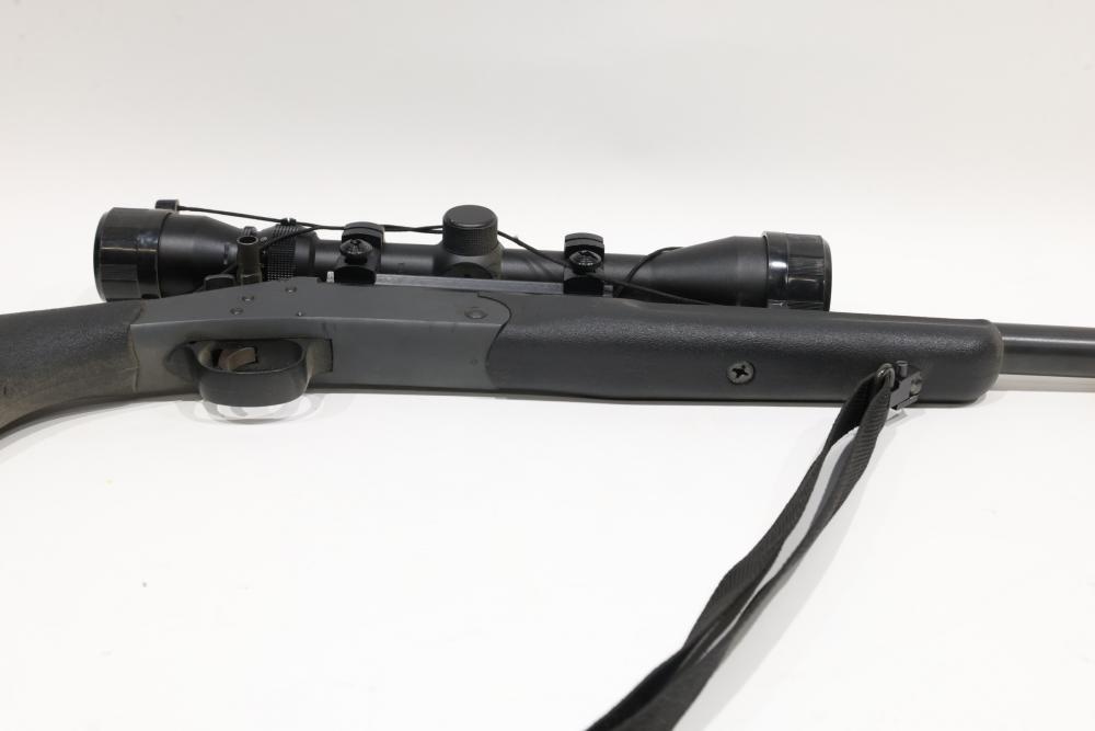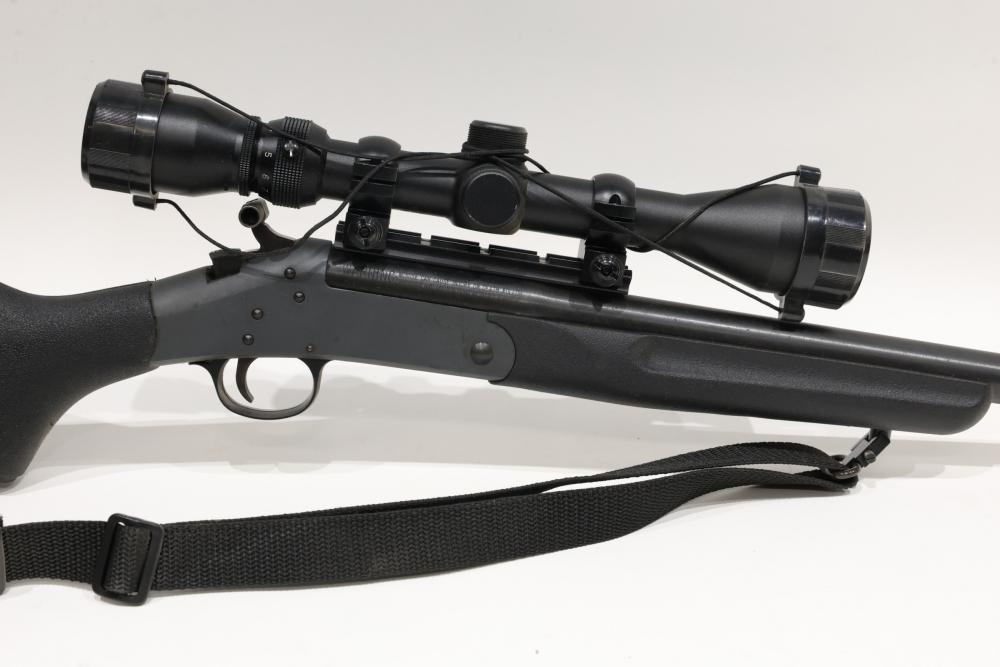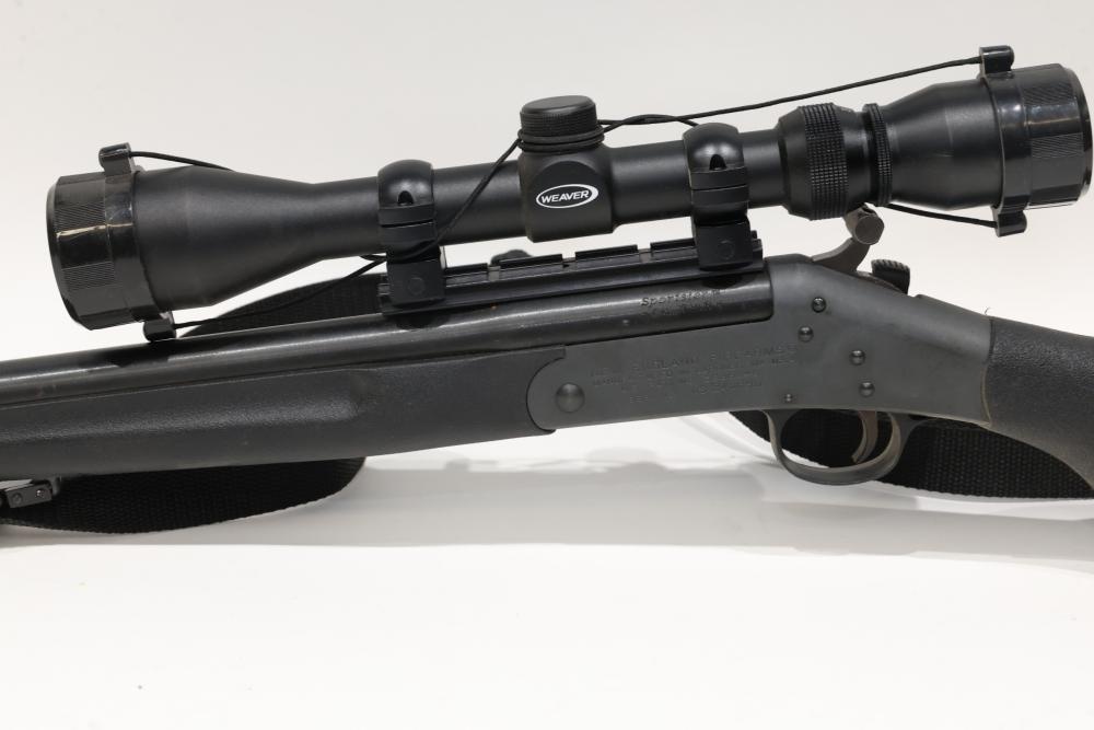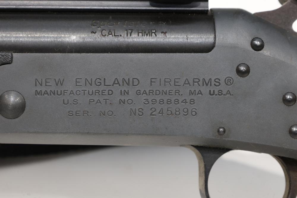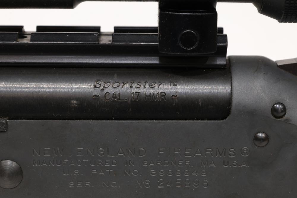 New England Firearms Sportster break-action rifle chambered in .17 HMR, featuring a black synthetic stock with rubber recoil pad and a mounted Weaver optic. Serial Number NS245896. All lots are subject to all applicable laws at the time of transfer. NOTE: Semi automatic rifles and all handguns require a license in NYS. There is a $35 transfer fee per long gun. There is a $40 transfer fee per hand gun. There is a $20 transfer fee per ammunition lot. If you fail the background check, the transfer fee still applies, and you are still required to make payment and then reconsign the lot to auction. FFL dealers are not exempt from these fees. A background check will be required for all buyers purchasing a firearm and/or ammunition. NYS charges a background check fee for all firearms and ammunition. The fee is $9 for firearms and $2.50 for ammunition. The NYS fee is per background check NOT per lot, will be collected directly by Civil Armory, and is in addition to transfer fees. All lots are subject to all applicable laws at the time of transfer. NOTE: Semi automatic rifles and all handguns require a license in NYS. There is a $35 transfer fee per long gun. There is a $40 transfer fee per hand gun. There is a $20 transfer fee per ammunition lot. If you fail the background check, the transfer fee still applies, and you are still required to make payment and then reconsign the lot to auction. FFL dealers are not exempt from these fees. A background check will be required for all buyers purchasing a firearm and/or ammunition. NYS charges a background check fee for all firearms and ammunition. The fee is $9 for firearms and $2.50 for ammunition. The NYS fee is per background check NOT per lot, will be collected directly by Civil Armory, and is in addition to transfer fees.