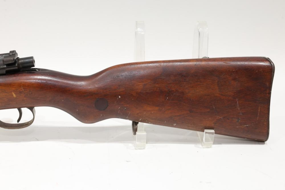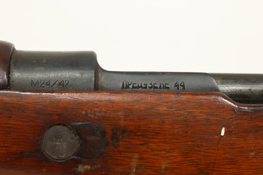 M24/47 bolt-action rifle likely chambered in 8mm Mauser (7.92x57mm), with a wood stock, metal butt plate, and hooded front sight with tangent rear sight. Serial Number 33377. All lots are subject to all applicable laws at the time of transfer. NOTE: Semi automatic rifles and all handguns require a license in NYS. There is a $35 transfer fee per long gun. There is a $40 transfer fee per hand gun. There is a $20 transfer fee per ammunition lot. If you fail the background check, the transfer fee still applies, and you are still required to make payment and then reconsign the lot to auction. FFL dealers are not exempt from these fees. A background check will be required for all buyers purchasing a firearm and/or ammunition. NYS charges a background check fee for all firearms and ammunition. The fee is $9 for firearms and $2.50 for ammunition. The NYS fee is per background check NOT per lot, will be collected directly by Civil Armory, and is in addition to any transfer All lots are subject to all applicable laws at the time of transfer. NOTE: Semi automatic rifles and all handguns require a license in NYS. There is a $35 transfer fee per long gun. There is a $40 transfer fee per hand gun. There is a $20 transfer fee per ammunition lot. If you fail the background check, the transfer fee still applies, and you are still required to make payment and then reconsign the lot to auction. FFL dealers are not exempt from these fees. A background check will be required for all buyers purchasing a firearm and/or ammunition. NYS charges a background check fee for all firearms and ammunition. The fee is $9 for firearms and $2.50 for ammunition. The NYS fee is per background check NOT per lot, will be collected directly by Civil Armory, and is in addition to any transfer