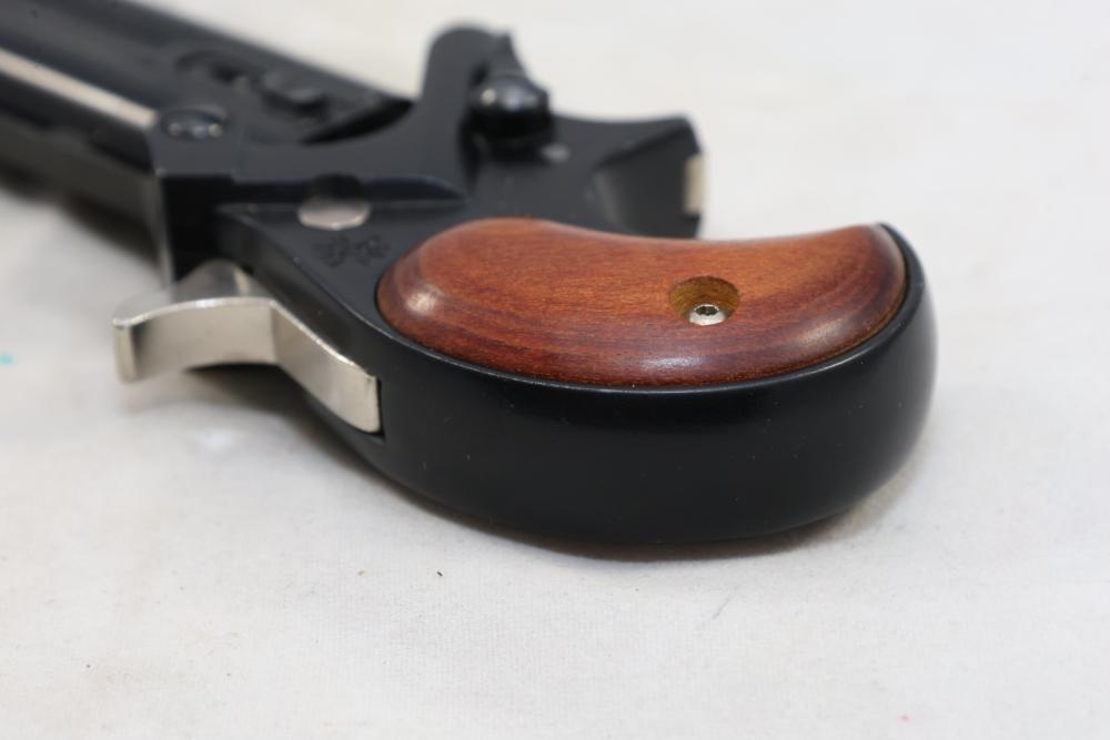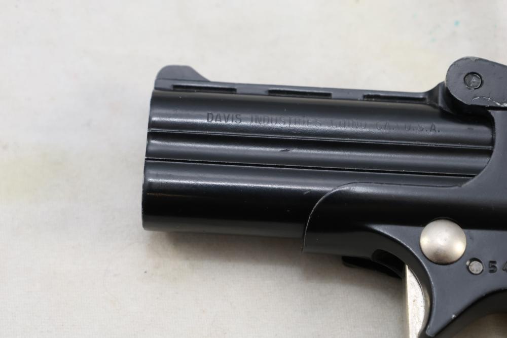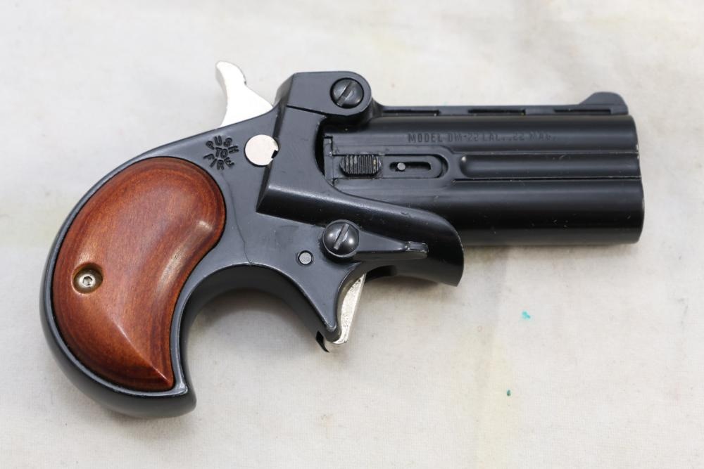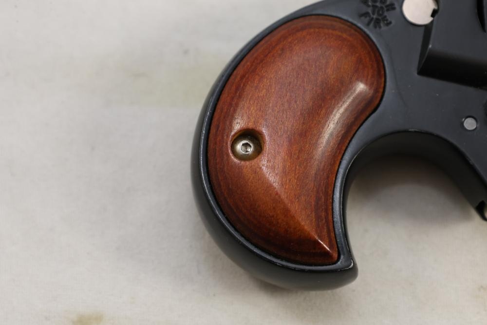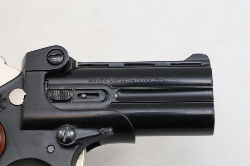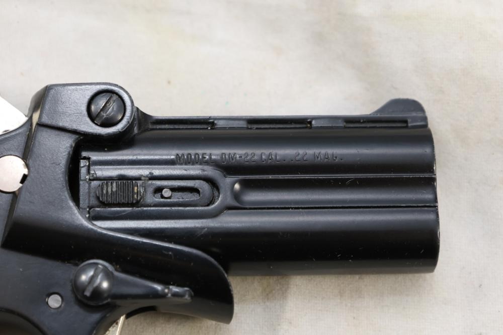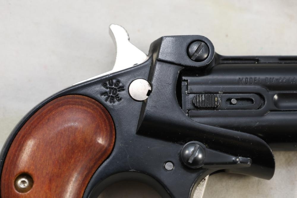 Davis Industries Model DM-22 over/under derringer chambered in .22 Magnum, with smooth wood grips and fixed sights. Serial Number 546067. All lots are subject to all applicable laws at the time of transfer. NOTE: Semi automatic rifles and all handguns require a license in NYS. There is a $35 transfer fee per long gun. There is a $40 transfer fee per hand gun. There is a $20 transfer fee per ammunition lot. If you fail the background check, the transfer fee still applies, and you are still required to make payment and then reconsign the lot to auction. FFL dealers are not exempt from these fees. A background check will be required for all buyers purchasing a firearm and/or ammunition. NYS charges a background check fee for all firearms and ammunition. The fee is $9 for firearms and $2.50 for ammunition. The NYS fee is per background check NOT per lot, will be collected directly by Civil Armory, and is in addition to any transfer All lots are subject to all applicable laws at the time of transfer. NOTE: Semi automatic rifles and all handguns require a license in NYS. There is a $35 transfer fee per long gun. There is a $40 transfer fee per hand gun. There is a $20 transfer fee per ammunition lot. If you fail the background check, the transfer fee still applies, and you are still required to make payment and then reconsign the lot to auction. FFL dealers are not exempt from these fees. A background check will be required for all buyers purchasing a firearm and/or ammunition. NYS charges a background check fee for all firearms and ammunition. The fee is $9 for firearms and $2.50 for ammunition. The NYS fee is per background check NOT per lot, will be collected directly by Civil Armory, and is in addition to any transfer