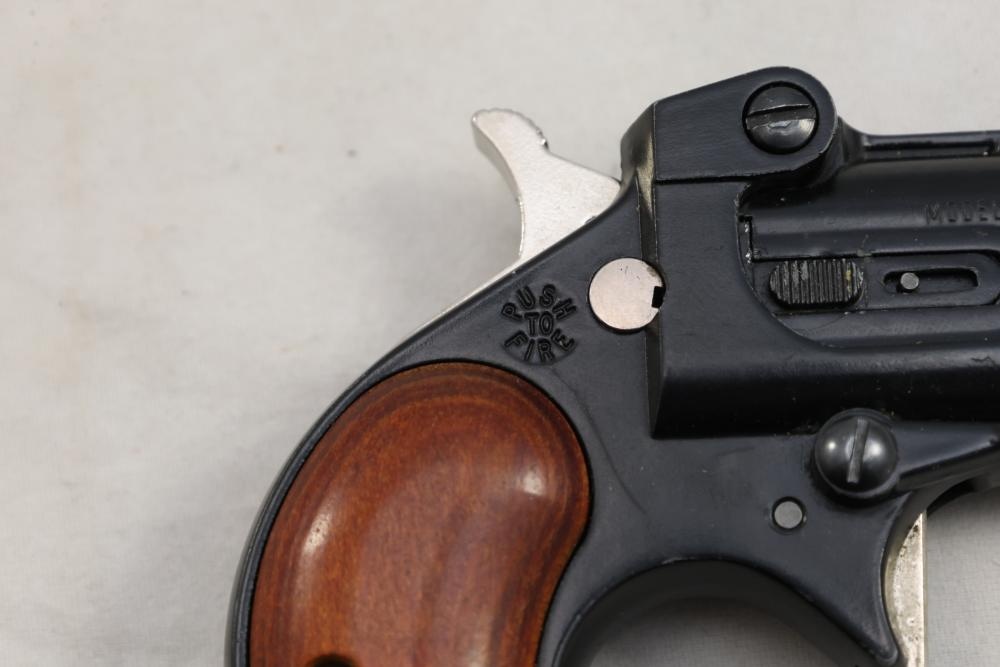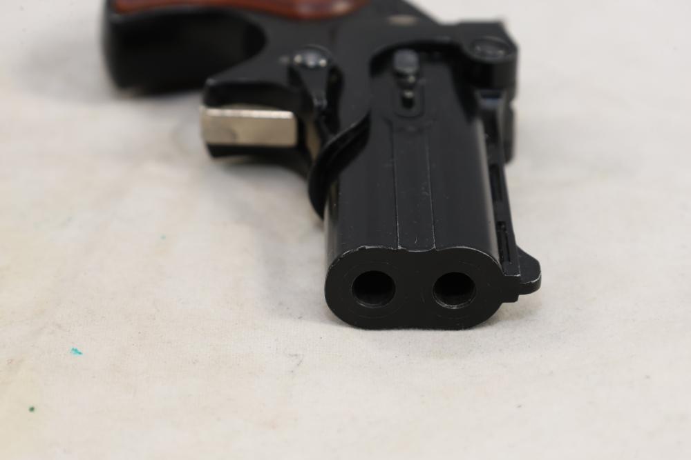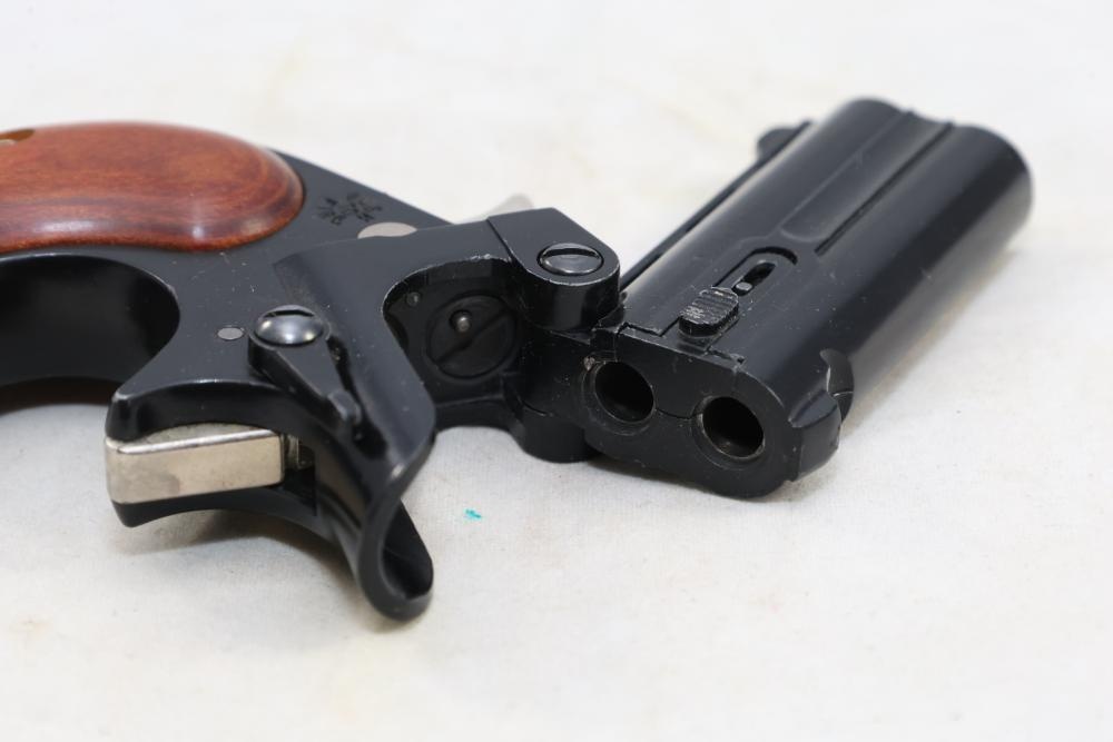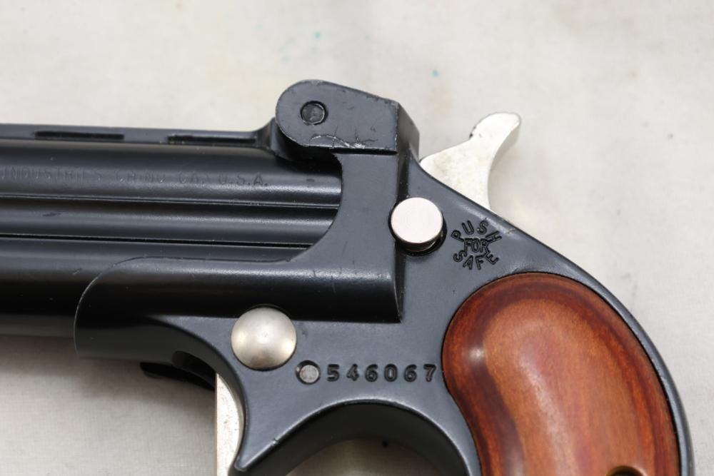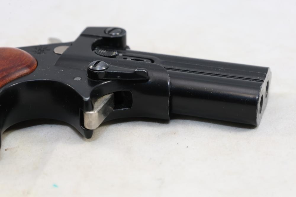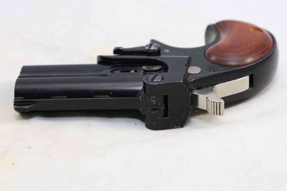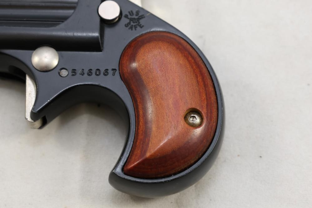 Davis Industries Model DM-22 over/under derringer chambered in .22 Magnum, with smooth wood grips and fixed sights. Serial Number 546067. All lots are subject to all applicable laws at the time of transfer. NOTE: Semi automatic rifles and all handguns require a license in NYS. There is a $35 transfer fee per long gun. There is a $40 transfer fee per hand gun. There is a $20 transfer fee per ammunition lot. If you fail the background check, the transfer fee still applies, and you are still required to make payment and then reconsign the lot to auction. FFL dealers are not exempt from these fees. A background check will be required for all buyers purchasing a firearm and/or ammunition. NYS charges a background check fee for all firearms and ammunition. The fee is $9 for firearms and $2.50 for ammunition. The NYS fee is per background check NOT per lot, will be collected directly by Civil Armory, and is in addition to any transfer All lots are subject to all applicable laws at the time of transfer. NOTE: Semi automatic rifles and all handguns require a license in NYS. There is a $35 transfer fee per long gun. There is a $40 transfer fee per hand gun. There is a $20 transfer fee per ammunition lot. If you fail the background check, the transfer fee still applies, and you are still required to make payment and then reconsign the lot to auction. FFL dealers are not exempt from these fees. A background check will be required for all buyers purchasing a firearm and/or ammunition. NYS charges a background check fee for all firearms and ammunition. The fee is $9 for firearms and $2.50 for ammunition. The NYS fee is per background check NOT per lot, will be collected directly by Civil Armory, and is in addition to any transfer