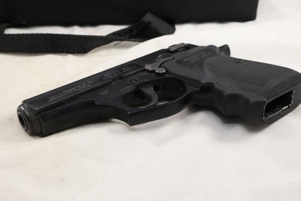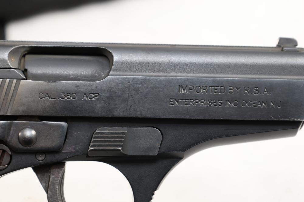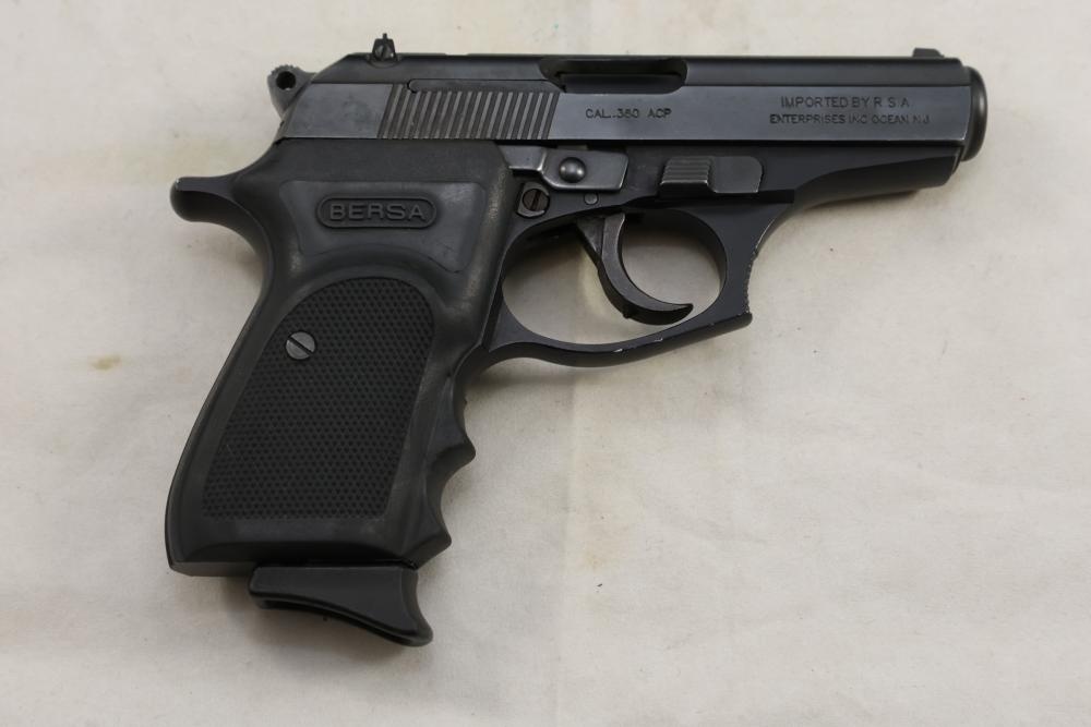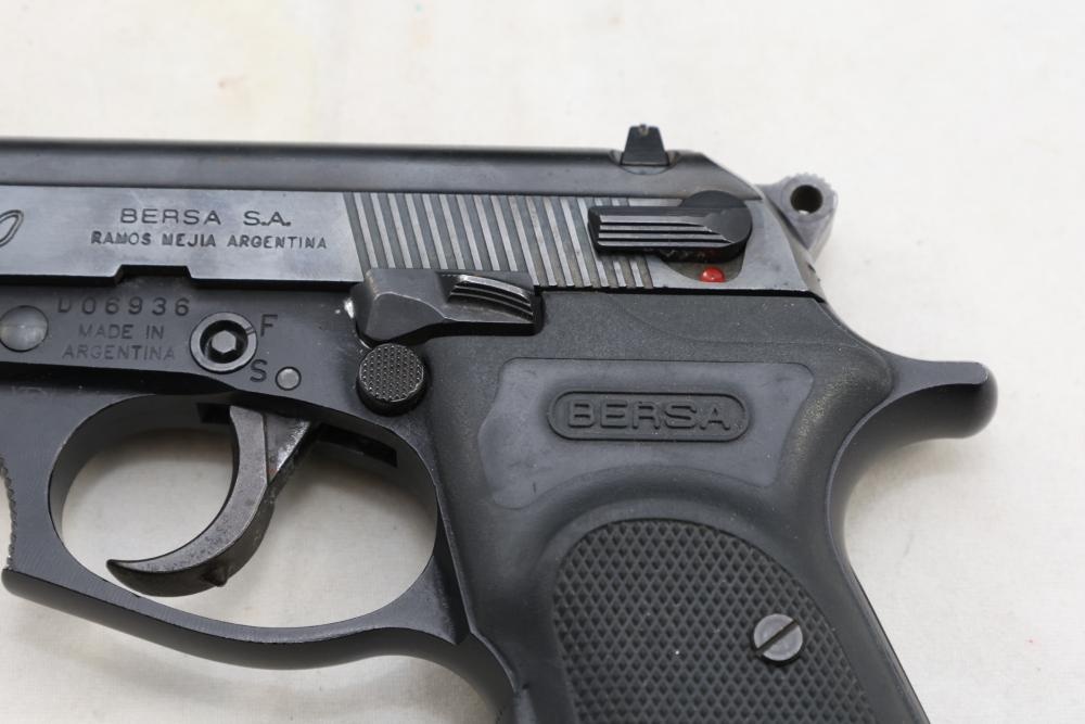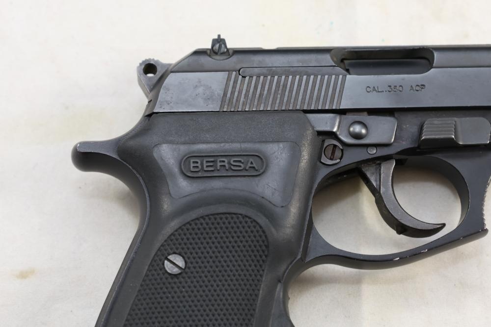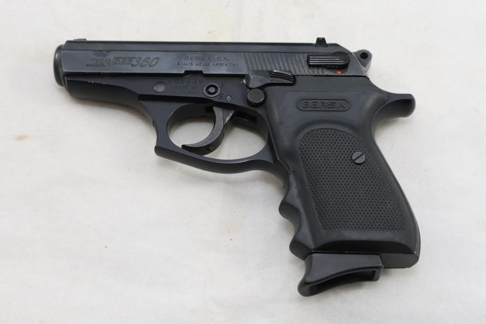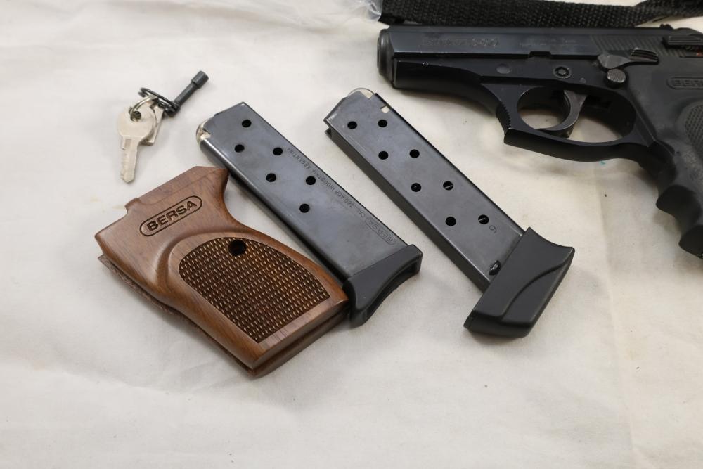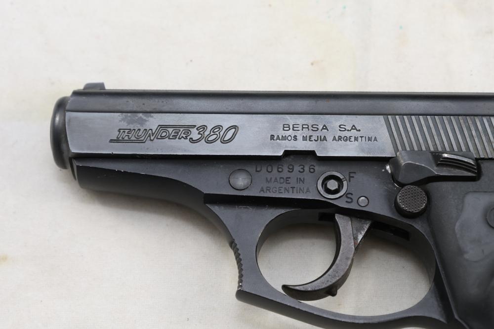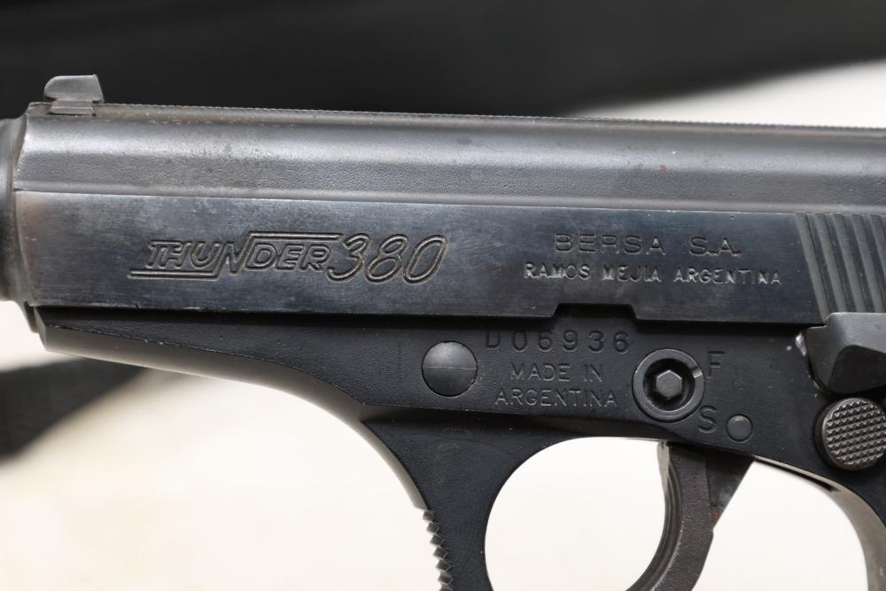 Bersa Thunder 380 semi-automatic pistol chambered in .380 ACP, with a black synthetic grip, and standard fixed sights; Serial Number D06936, and comes with two magazines, an extra wood grip set, a soft case, and a manual. All lots are subject to all applicable laws at the time of transfer. NOTE: Semi automatic rifles and all handguns require a license in NYS. There is a $35 transfer fee per long gun. There is a $40 transfer fee per hand gun. There is a $20 transfer fee per ammunition lot. If you fail the background check, the transfer fee still applies, and you are still required to make payment and then reconsign the lot to auction. FFL dealers are not exempt from these fees. A background check will be required for all buyers purchasing a firearm and/or ammunition. NYS charges a background check fee for all firearms and ammunition. The fee is $9 for firearms and $2.50 for ammunition. The NYS fee is per background check NOT per lot, will be collected directly by Civil Armory, and is in addition to any transfer All lots are subject to all applicable laws at the time of transfer. NOTE: Semi automatic rifles and all handguns require a license in NYS. There is a $35 transfer fee per long gun. There is a $40 transfer fee per hand gun. There is a $20 transfer fee per ammunition lot. If you fail the background check, the transfer fee still applies, and you are still required to make payment and then reconsign the lot to auction. FFL dealers are not exempt from these fees. A background check will be required for all buyers purchasing a firearm and/or ammunition. NYS charges a background check fee for all firearms and ammunition. The fee is $9 for firearms and $2.50 for ammunition. The NYS fee is per background check NOT per lot, will be collected directly by Civil Armory, and is in addition to any transfer