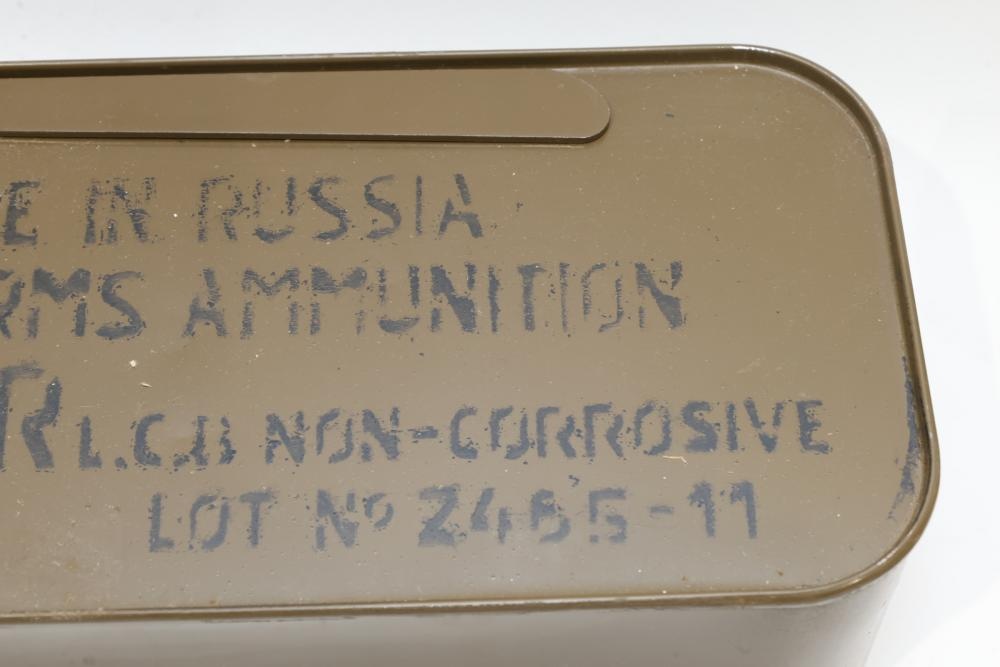 Russian-made small arms ammunition can labeled 9mm Luger L.C.B. non-corrosive, 900 rounds, Lot No. 2485-11. All lots are subject to all applicable laws at the time of transfer. NOTE: Semi automatic rifles and all handguns require a license in NYS. There is a $35 transfer fee per long gun. There is a $40 transfer fee per hand gun. There is a $20 transfer fee per ammunition lot. If you fail the background check, the transfer fee still applies, and you are still required to make payment and then reconsign the lot to auction. FFL dealers are not exempt from these fees. A background check will be required for all buyers purchasing a firearm and/or ammunition. NYS charges a background check fee for all firearms and ammunition. The fee is $9 for firearms and $2.50 for ammunition. The NYS fee is per background check NOT per lot, will be collected directly by Civil Armory, and is in addition to any transfer All lots are subject to all applicable laws at the time of transfer. NOTE: Semi automatic rifles and all handguns require a license in NYS. There is a $35 transfer fee per long gun. There is a $40 transfer fee per hand gun. There is a $20 transfer fee per ammunition lot. If you fail the background check, the transfer fee still applies, and you are still required to make payment and then reconsign the lot to auction. FFL dealers are not exempt from these fees. A background check will be required for all buyers purchasing a firearm and/or ammunition. NYS charges a background check fee for all firearms and ammunition. The fee is $9 for firearms and $2.50 for ammunition. The NYS fee is per background check NOT per lot, will be collected directly by Civil Armory, and is in addition to any transfer