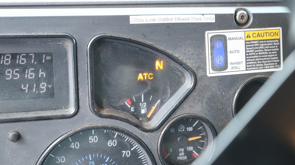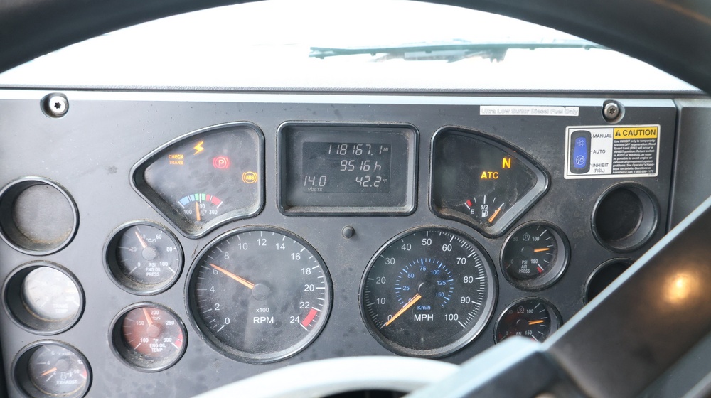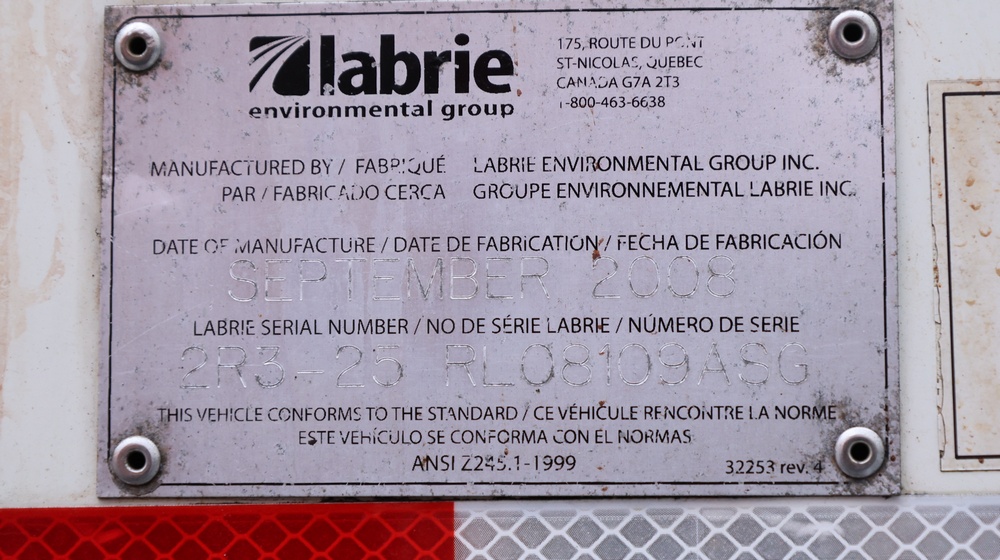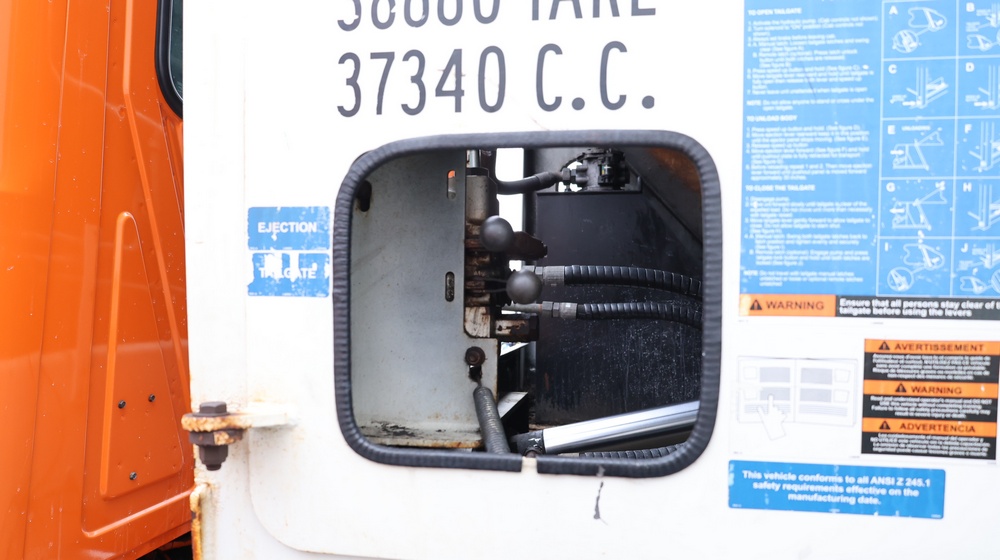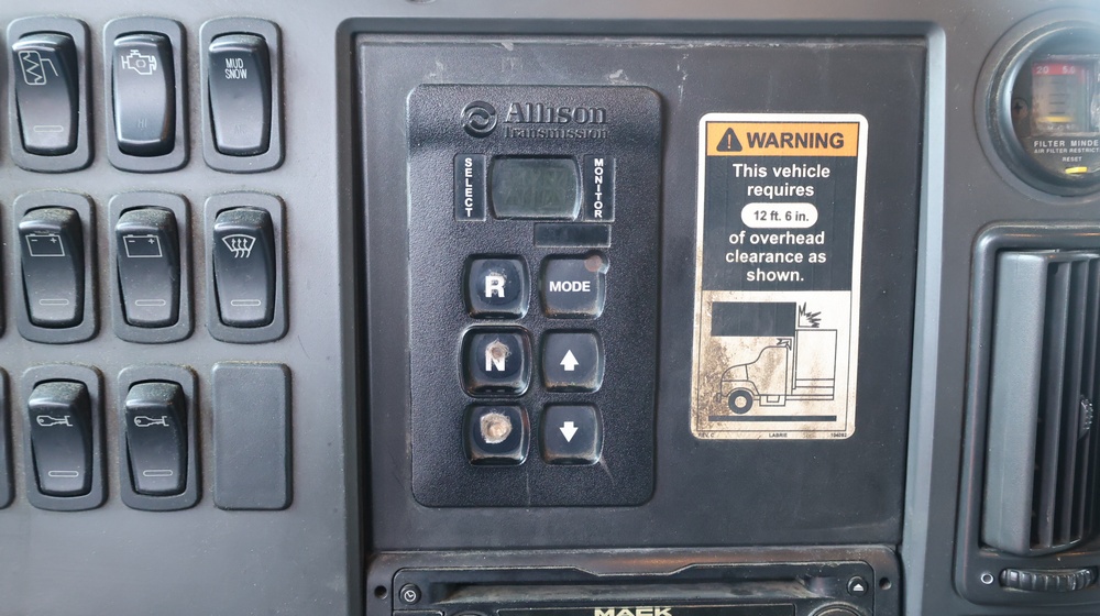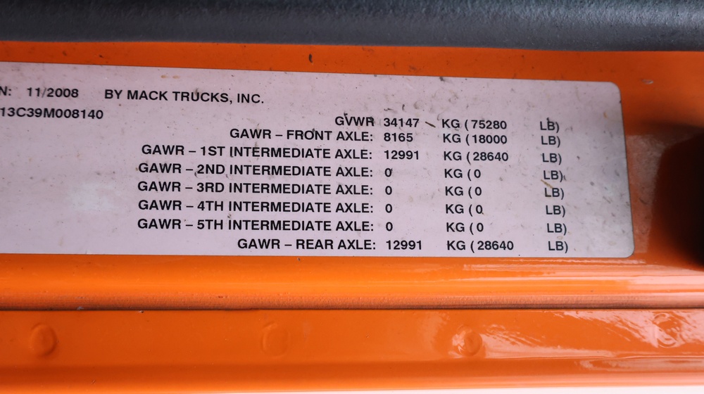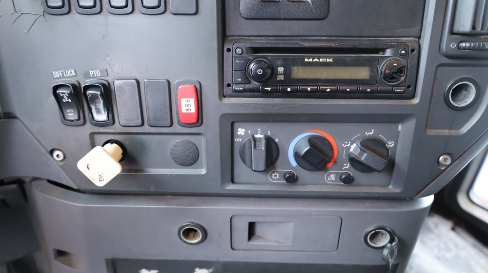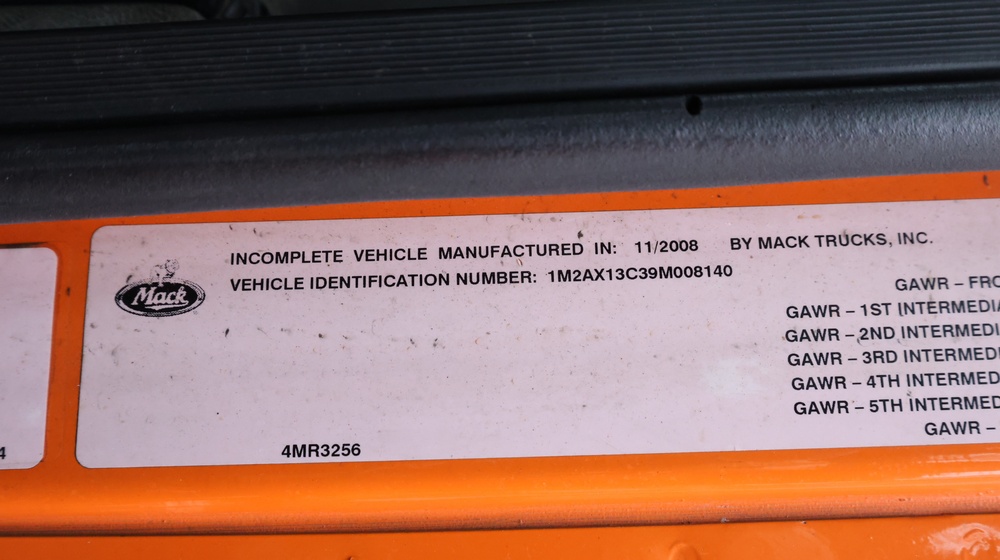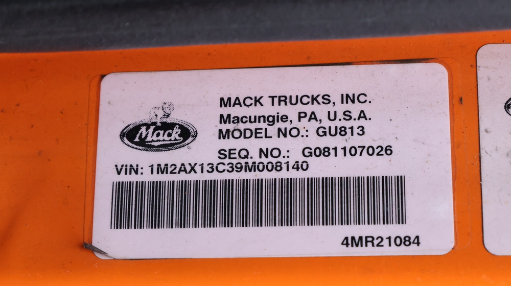 2009 Mack GU813 garbage truck with a 10.8L L6 diesel engine. VIN: 1M2AX13C39M008140. Odometer reading: 118167. Body: Cab-behind-engine refuse truck with rear-load garbage body manufactured by Labrie Environmental Group. Tandem rear axle configuration. Municipal lighting, front bumper guard, dual rear wheels, and rear refuse compactor equipment. Interior controls include HVAC, Mack radio, differential lock, PTO, and auxiliary lighting switches. Seller reports: Runs and drives, Rusty, Transmission Issues, Title and key available. Must be towed.