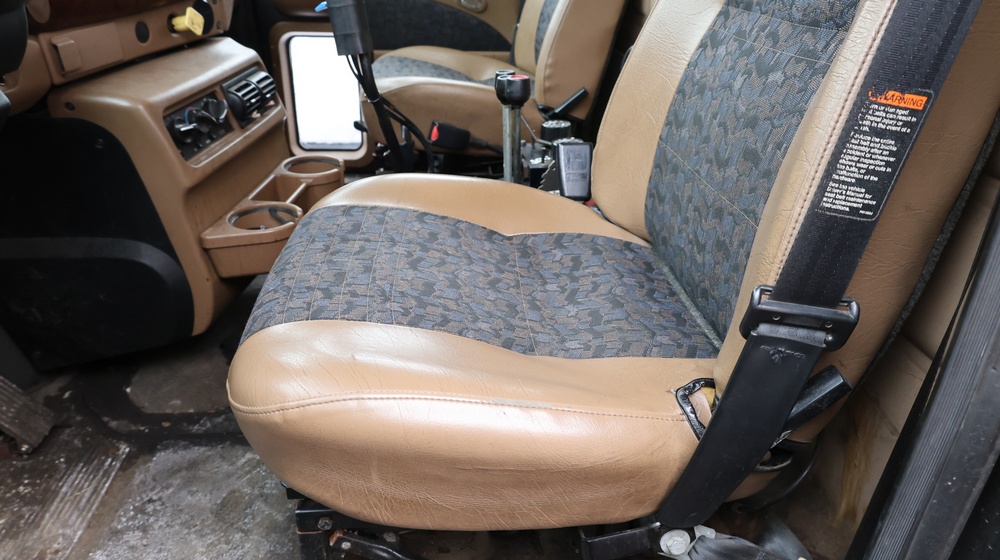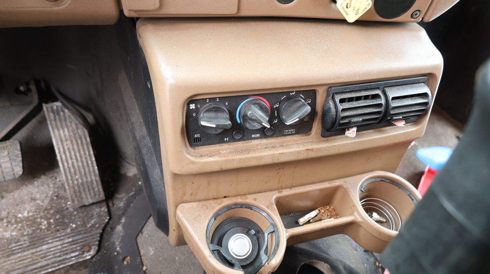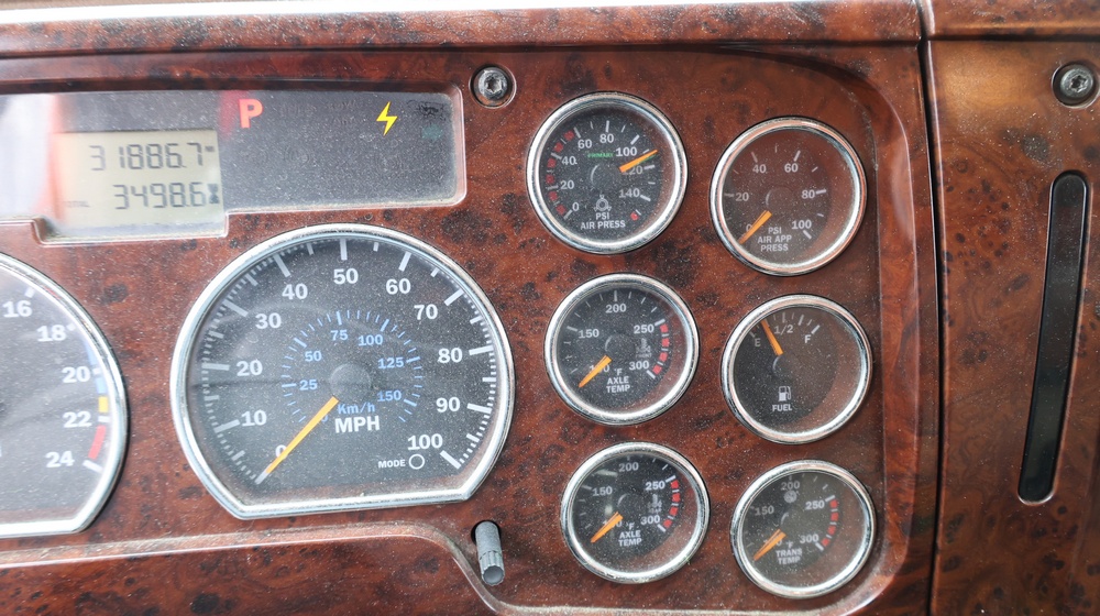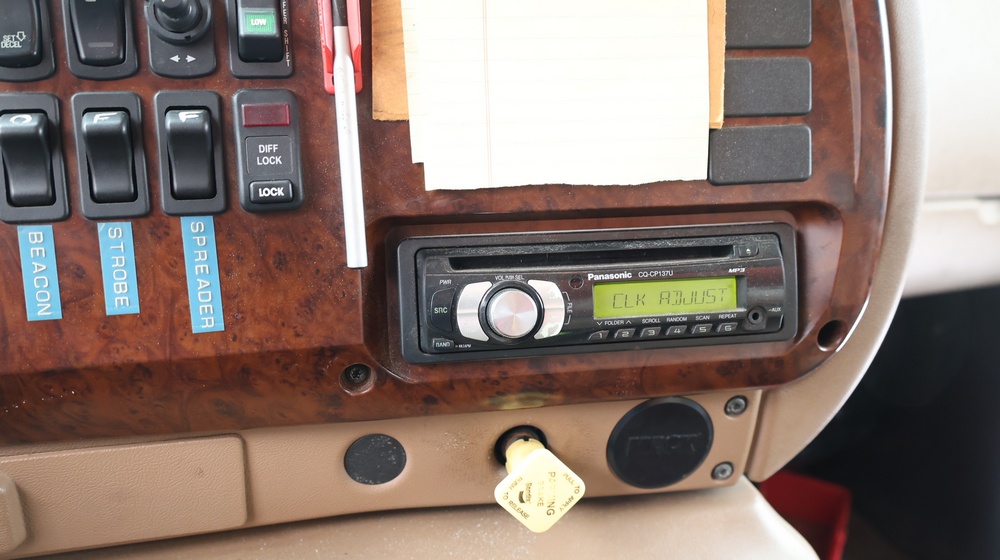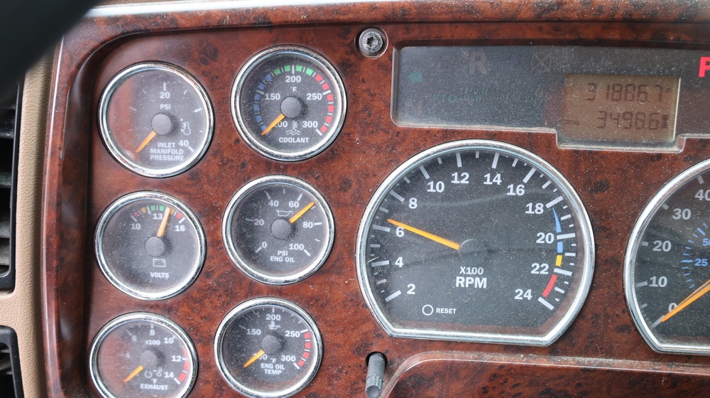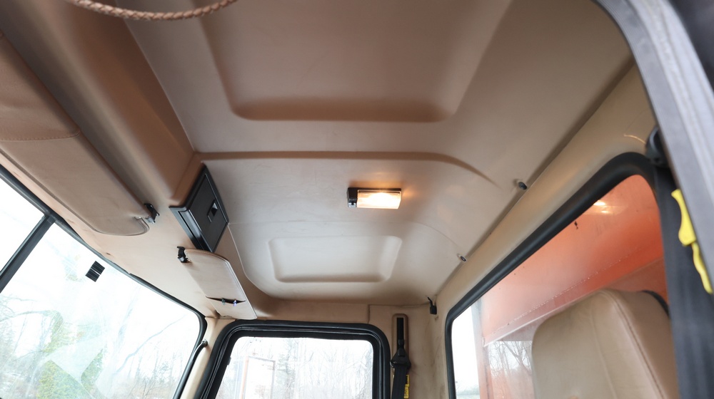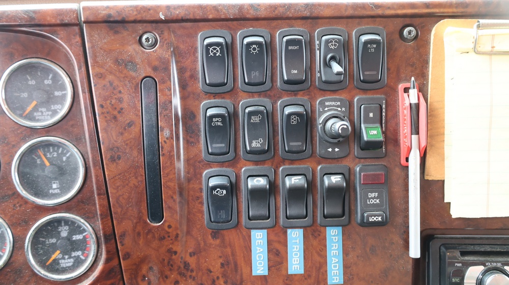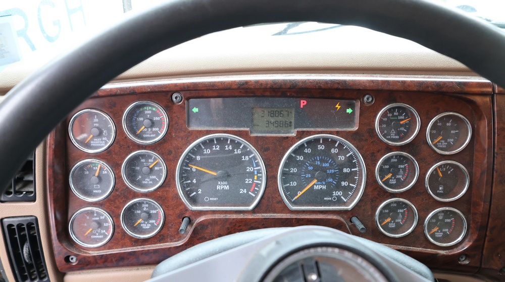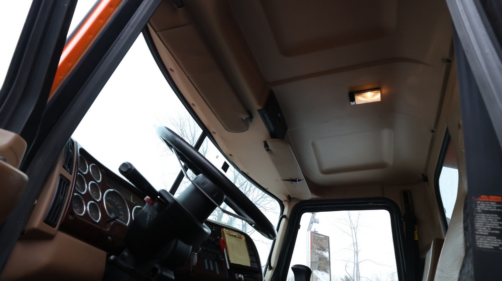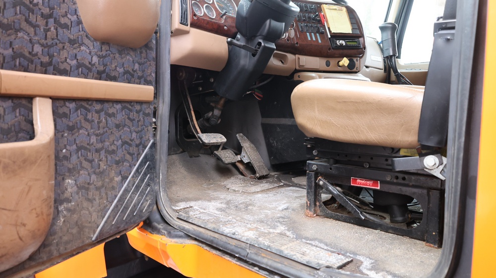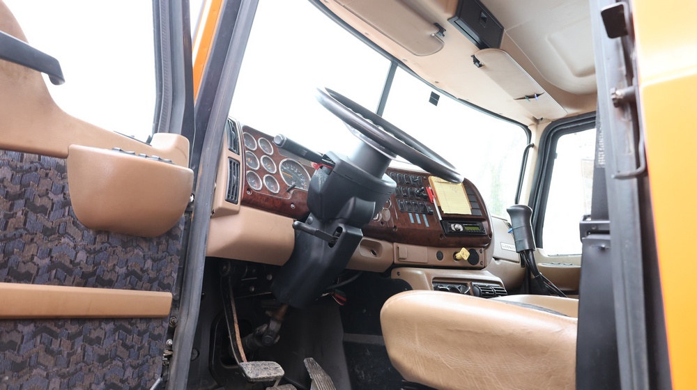 2004 Mack CV713 Granite dump truck with a 12.0L L6 diesel engine, manual transmission. VIN: 1M2AG12CX4M009022. Odometer reading: 34986.8. Hour meter: 3188.6 hours. Body: Tandem-axle dump truck with steel dump body. Interior features include analog gauge cluster, woodgrain dash trim, Panasonic radio, HVAC controls, differential lock switch, and auxiliary switches labeled beacon, strobe, and spreader. Seller reports: Runs and drives, Rusty, Title and key available. Must be towed.