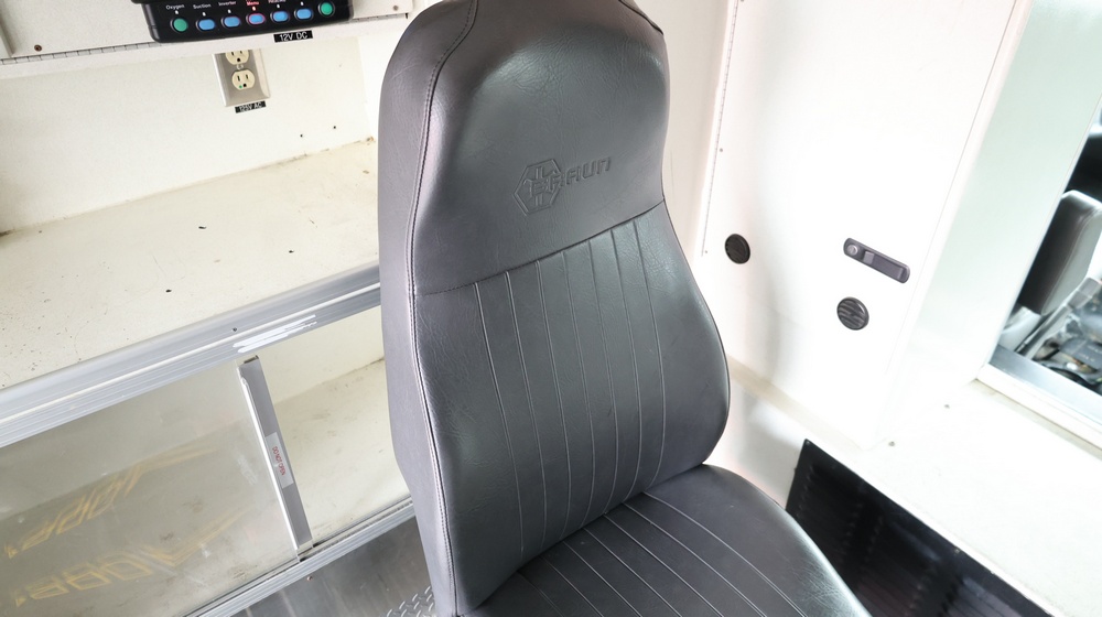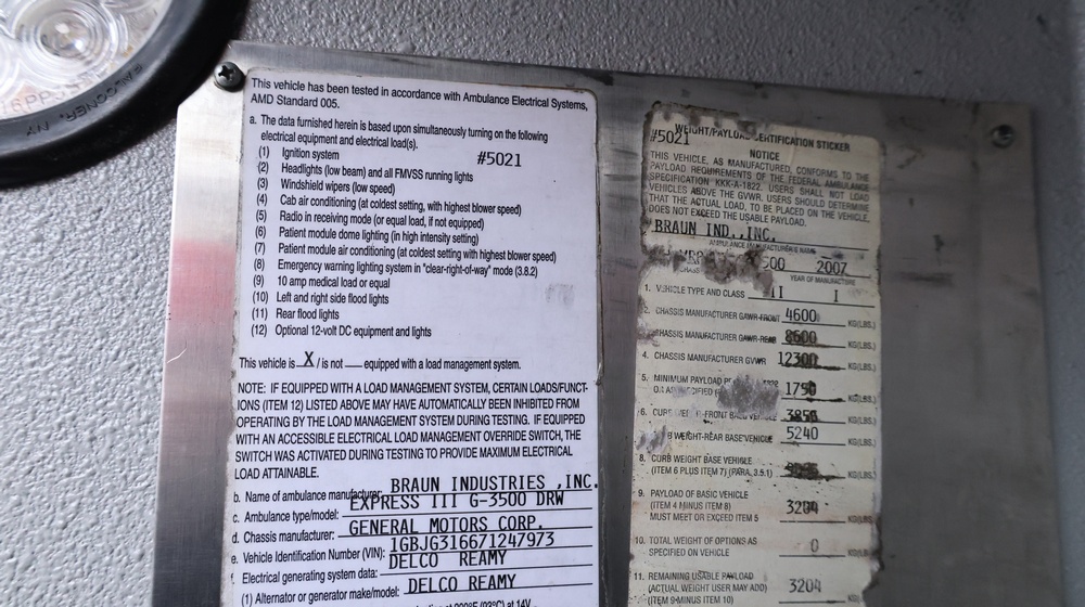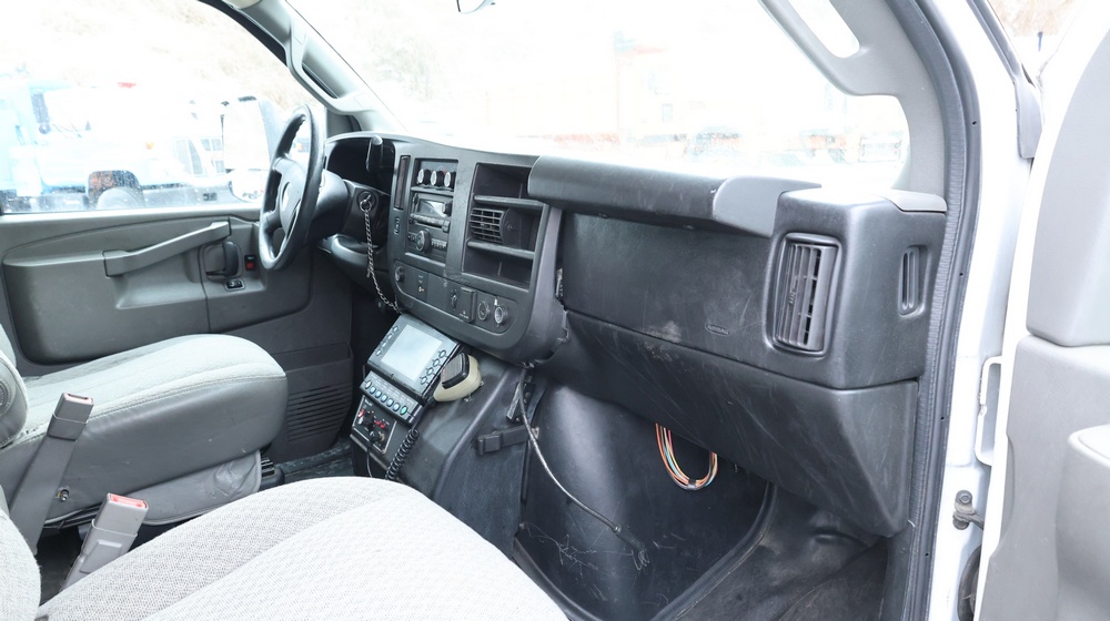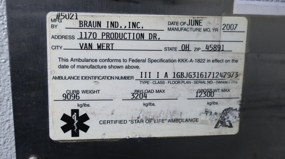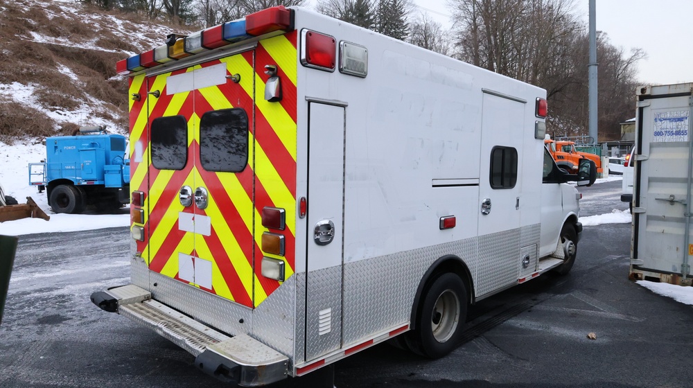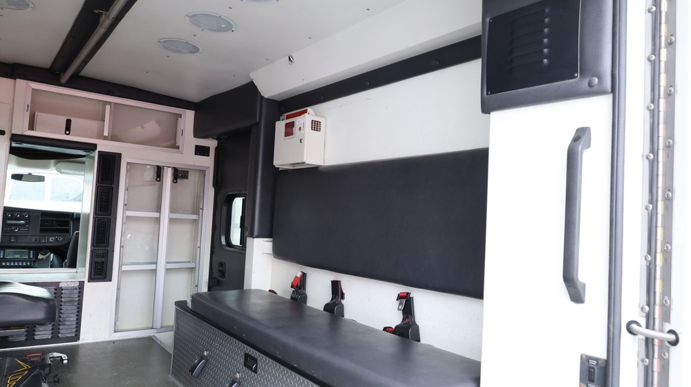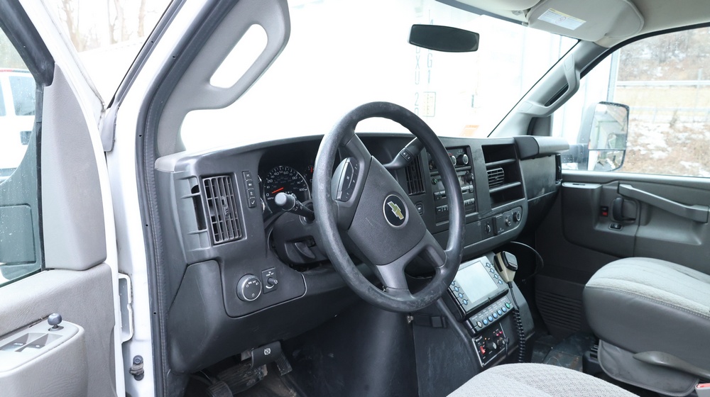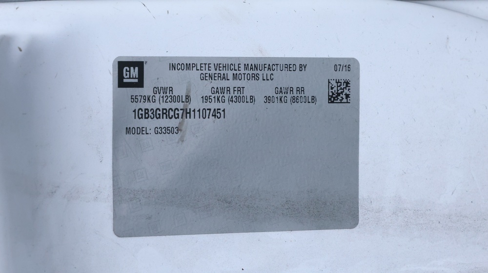 2017 Chevrolet Express G3500 cutaway ambulance with a 6.0L V8 gasoline engine. VIN: 1GB3GRCG7H1107451. Odometer reading: 138199. Body: Cutaway chassis fitted with an ambulance body manufactured by Braun Industries, Inc. Single rear wheel configuration. Roof-mounted emergency lighting, side utility compartments, rear double doors with chevron striping, and rear step bumper. Interior controls include HVAC, factory radio, automatic transmission selector, Whelen emergency control panel, radio microphone, auxiliary switches, and rear ambulance compartment with seating, storage cabinetry, and equipment mounts. Seller reports: Runs and drives, title and key available. Must be towed.