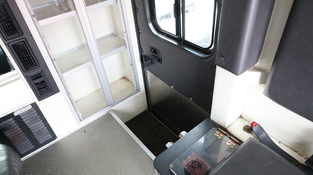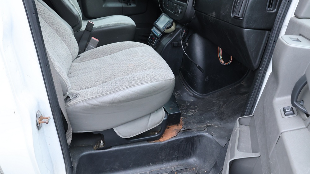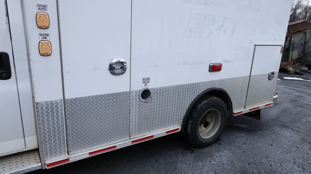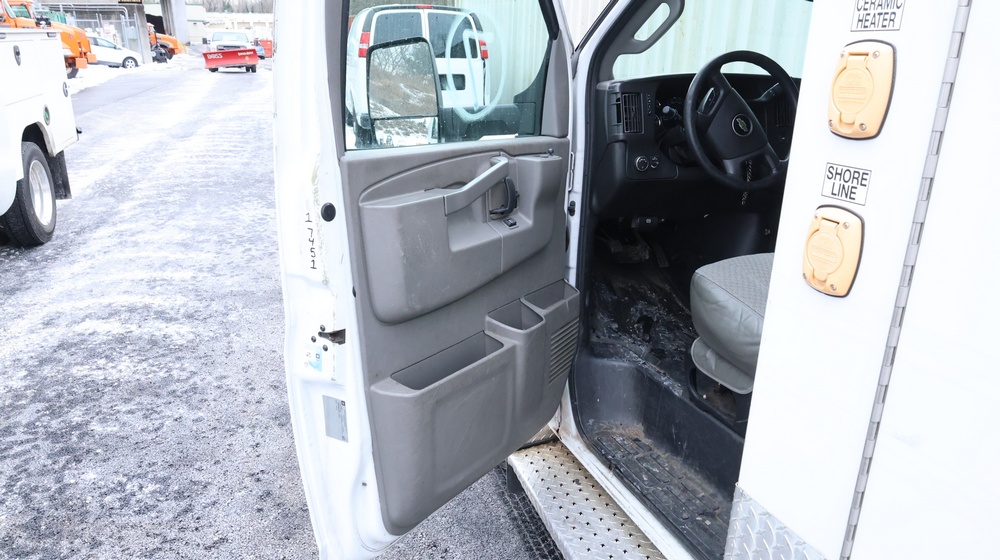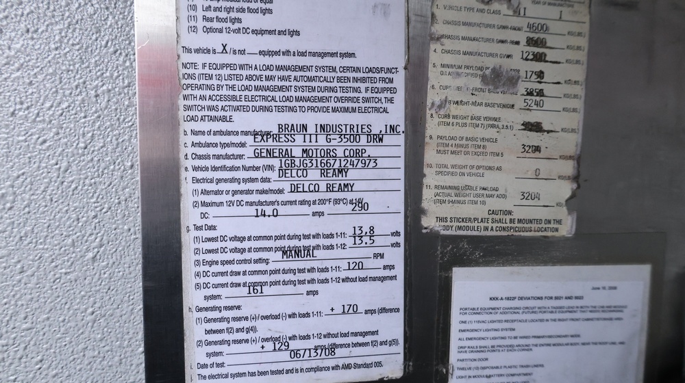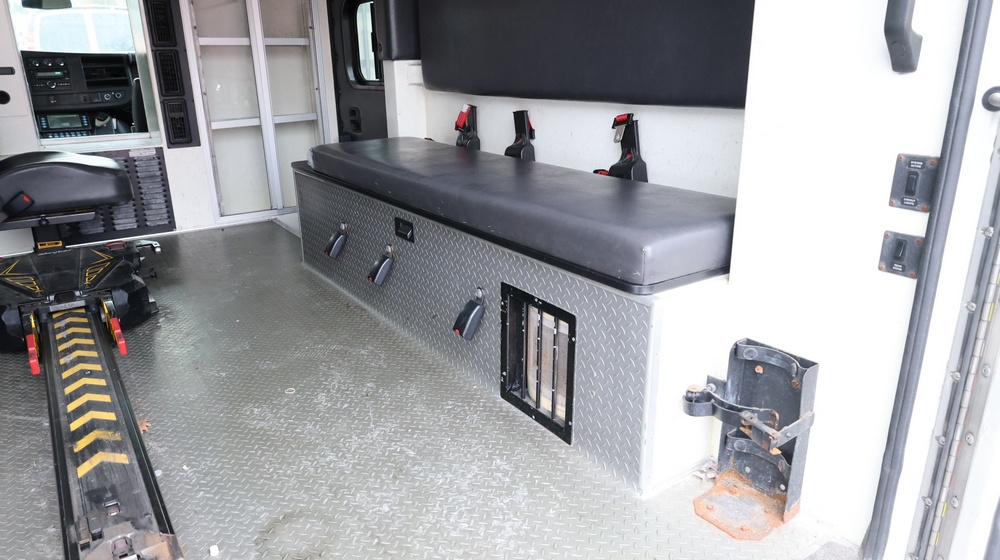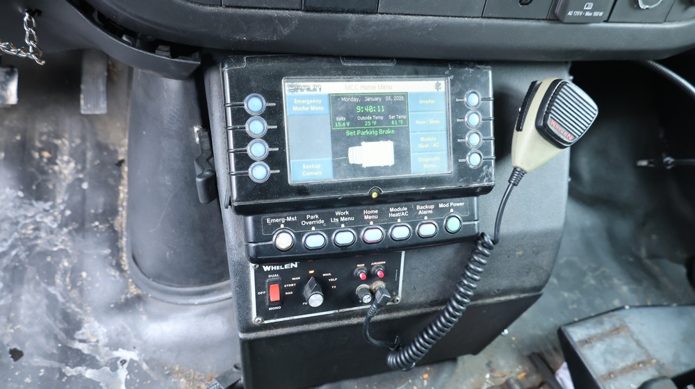 2017 Chevrolet Express G3500 cutaway ambulance with a 6.0L V8 gasoline engine. VIN: 1GB3GRCG7H1107451. Odometer reading: 138199. Body: Cutaway chassis fitted with an ambulance body manufactured by Braun Industries, Inc. Single rear wheel configuration. Roof-mounted emergency lighting, side utility compartments, rear double doors with chevron striping, and rear step bumper. Interior controls include HVAC, factory radio, automatic transmission selector, Whelen emergency control panel, radio microphone, auxiliary switches, and rear ambulance compartment with seating, storage cabinetry, and equipment mounts. Seller reports: Runs and drives, title and key available. Must be towed.