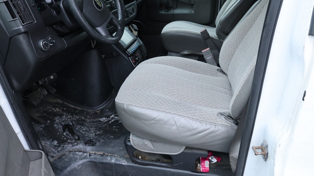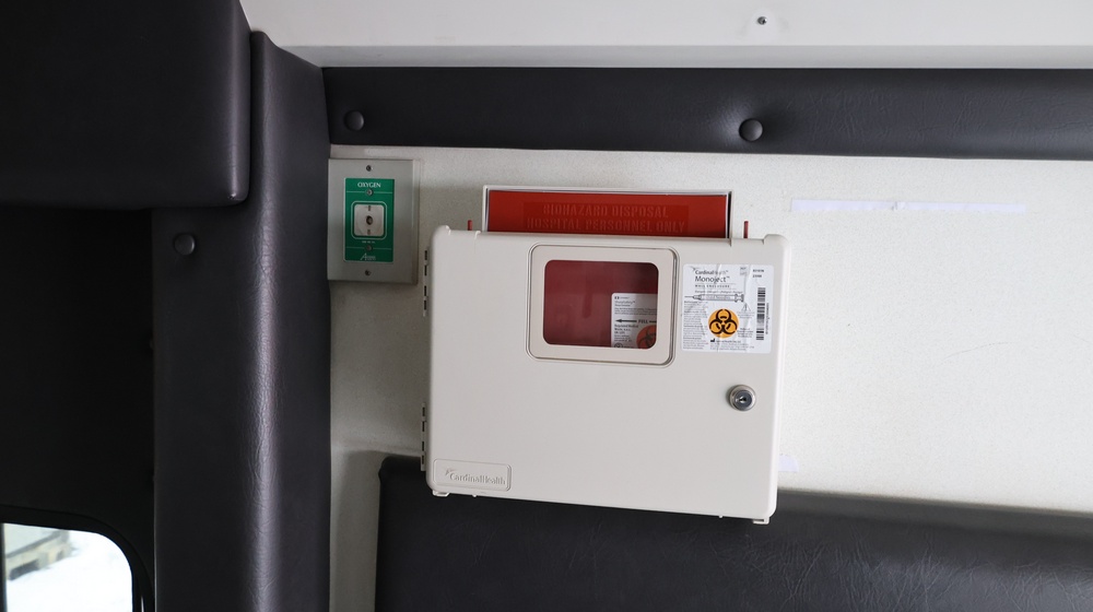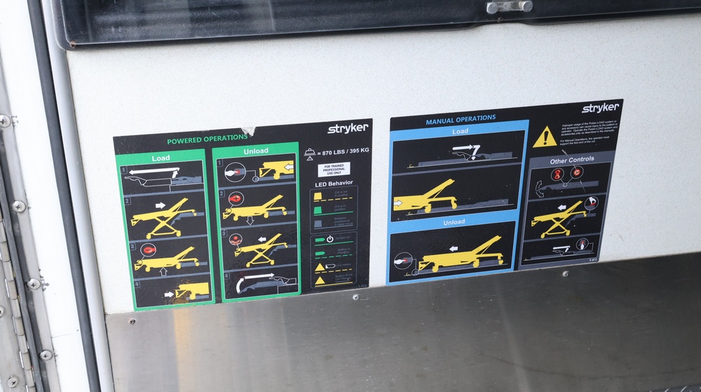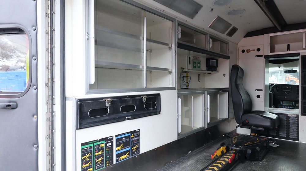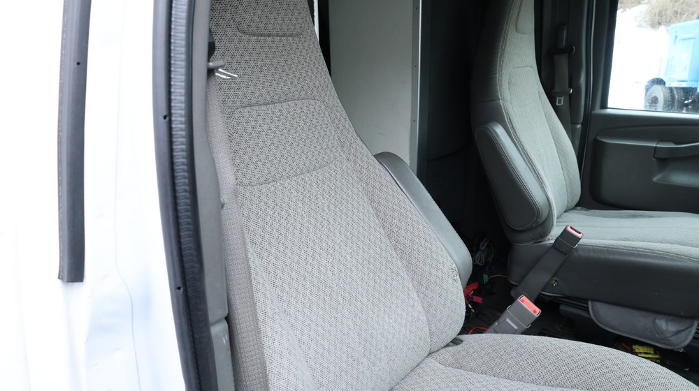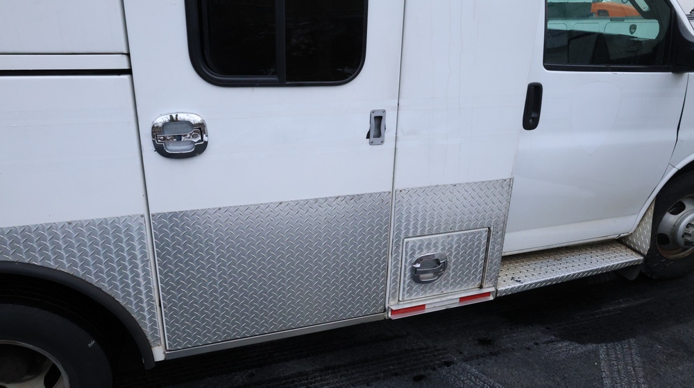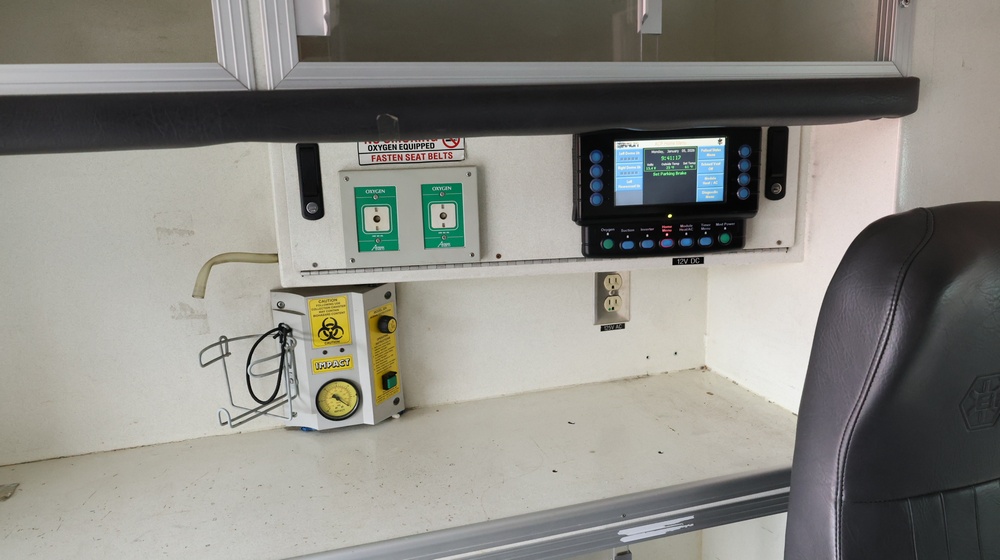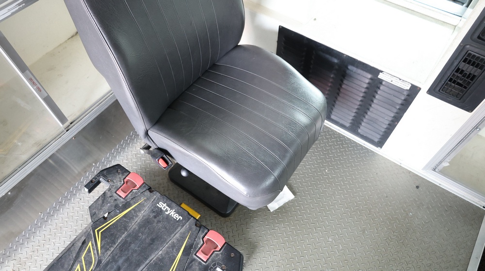 2017 Chevrolet Express G3500 cutaway ambulance with a 6.0L V8 gasoline engine. VIN: 1GB3GRCG7H1107451. Odometer reading: 138199. Body: Cutaway chassis fitted with an ambulance body manufactured by Braun Industries, Inc. Single rear wheel configuration. Roof-mounted emergency lighting, side utility compartments, rear double doors with chevron striping, and rear step bumper. Interior controls include HVAC, factory radio, automatic transmission selector, Whelen emergency control panel, radio microphone, auxiliary switches, and rear ambulance compartment with seating, storage cabinetry, and equipment mounts. Seller reports: Runs and drives, title and key available. Must be towed.