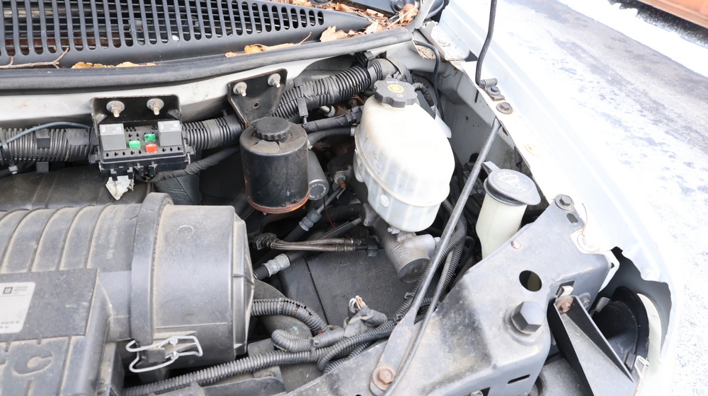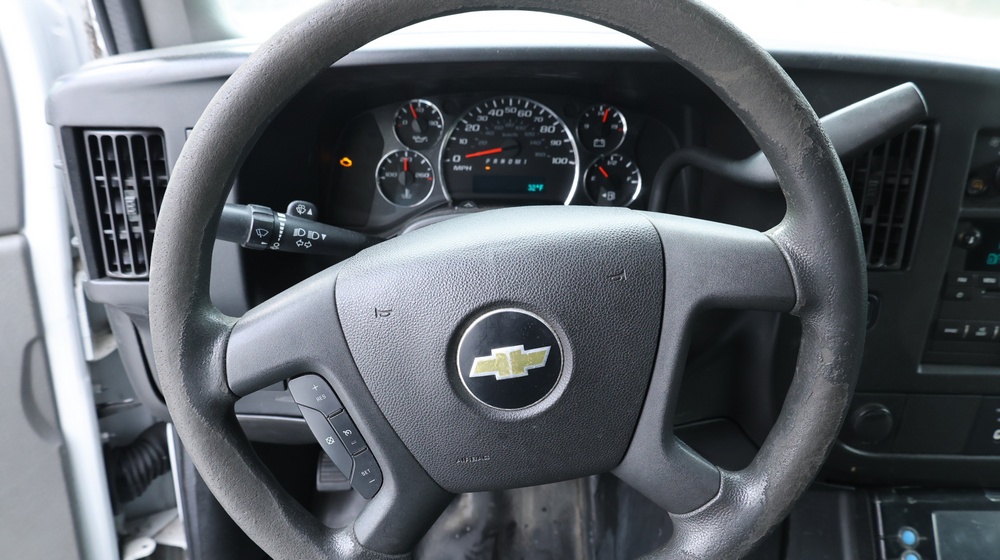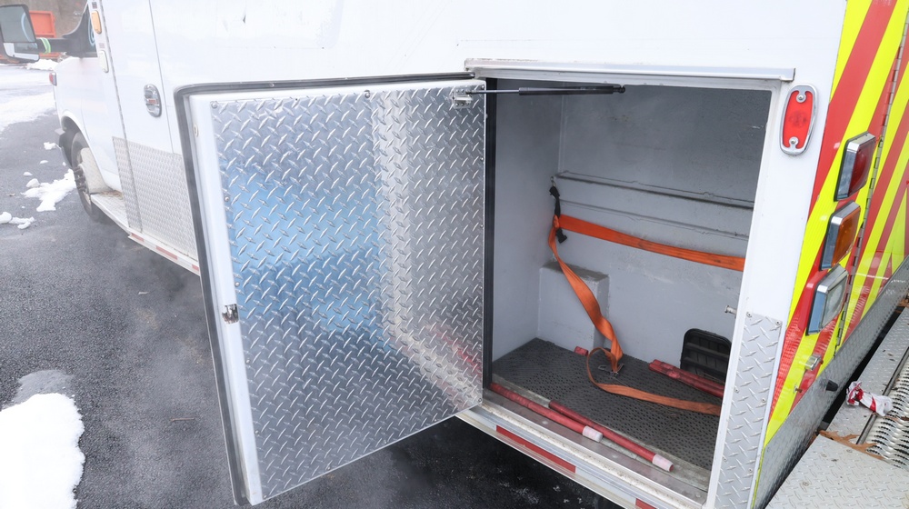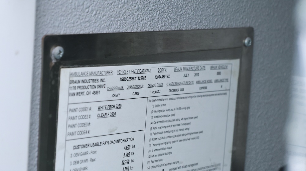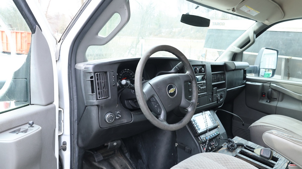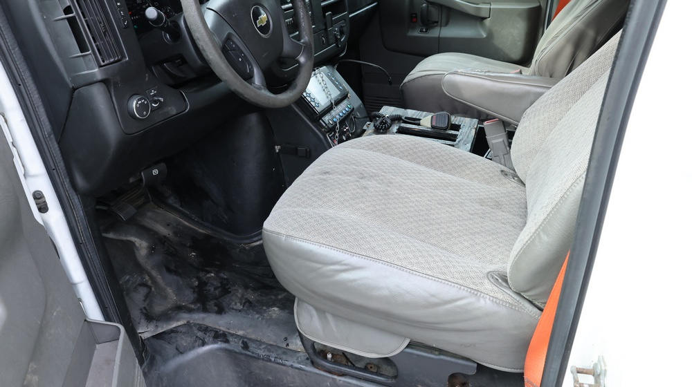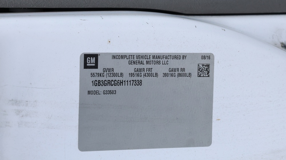 2017 Chevrolet Express G3500 cutaway ambulance with a 6.0L V8 OHV FFV engine. VIN: 1GB3GRCG6H1117338. Body: Cutaway chassis fitted with an ambulance body manufactured by Braun Industries, Inc. Single rear wheel configuration. Exterior features include roof-mounted emergency lighting, side utility compartments, rear double doors with chevron striping, and rear step bumper. Interior controls include HVAC, factory radio, automatic transmission selector, Whelen emergency control panel, radio microphone, auxiliary switches, and rear ambulance compartment with seating, storage cabinetry, stretcher mount, and equipment storage. Seller reports: Runs and drives, title and key available. Must be towed.