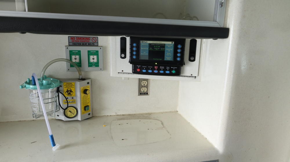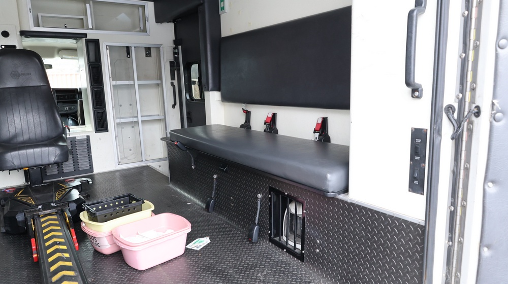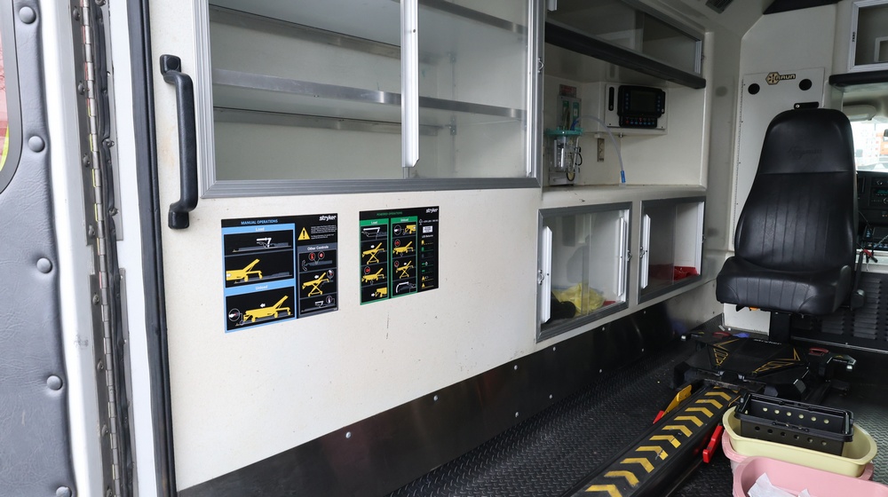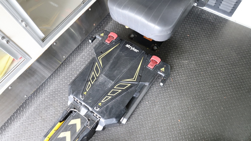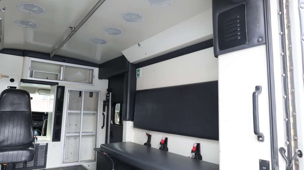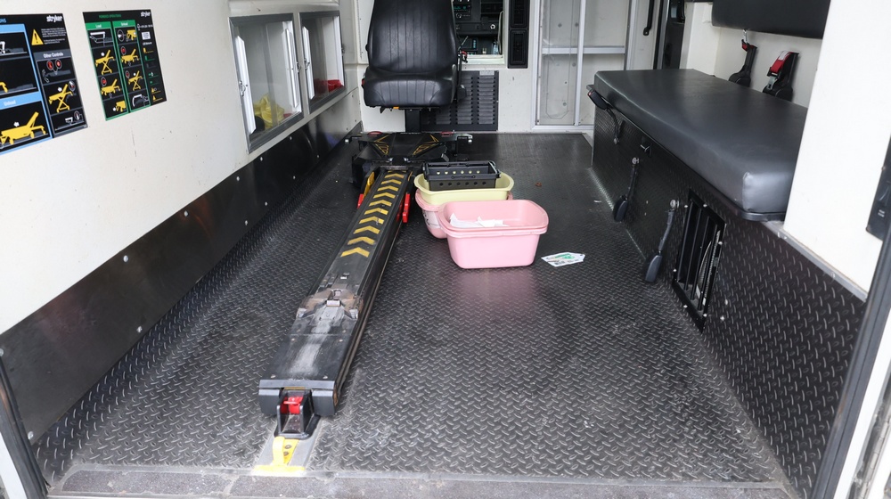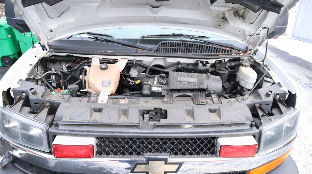 2017 Chevrolet Express G3500 cutaway ambulance with a 6.0L V8 OHV FFV engine. VIN: 1GB3GRCG6H1117338. Body: Cutaway chassis fitted with an ambulance body manufactured by Braun Industries, Inc. Single rear wheel configuration. Exterior features include roof-mounted emergency lighting, side utility compartments, rear double doors with chevron striping, and rear step bumper. Interior controls include HVAC, factory radio, automatic transmission selector, Whelen emergency control panel, radio microphone, auxiliary switches, and rear ambulance compartment with seating, storage cabinetry, stretcher mount, and equipment storage. Seller reports: Runs and drives, title and key available. Must be towed.