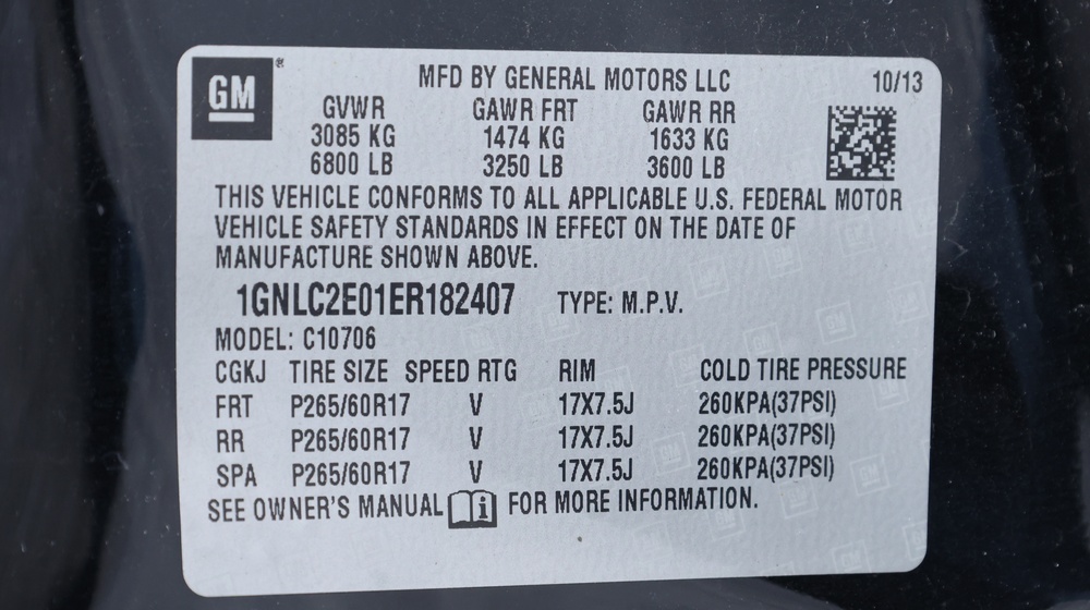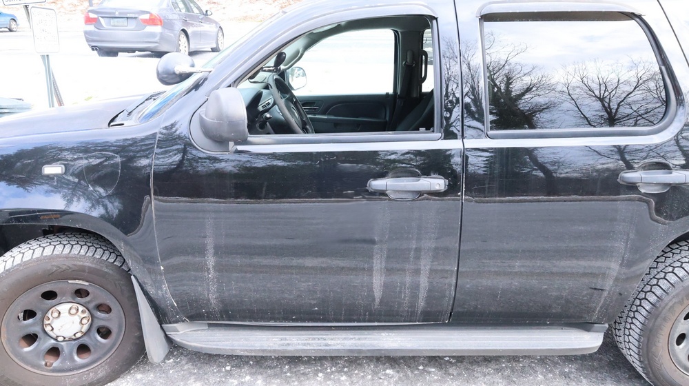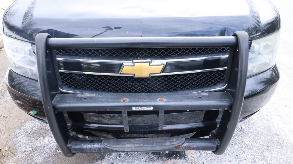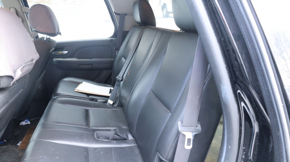 2014 Chevrolet Tahoe Police with a 5.3L V8 OHV FFV engine. VIN: 1GNLC2E01ER182407. Odometer reading: 140806. Body: Full-size four-door sport utility vehicle in police configuration. Equipped with a front push bumper, steel wheels, black exterior trim, and tinted rear windows. Interior features include cloth seating, center console equipment mount, factory Chevrolet radio, HVAC controls, floor-mounted automatic transmission selector, auxiliary wiring and mounts associated with police use, and analog gauge cluster. Seller reports: Rusty, runs and drives, title and key available. Must be towed.