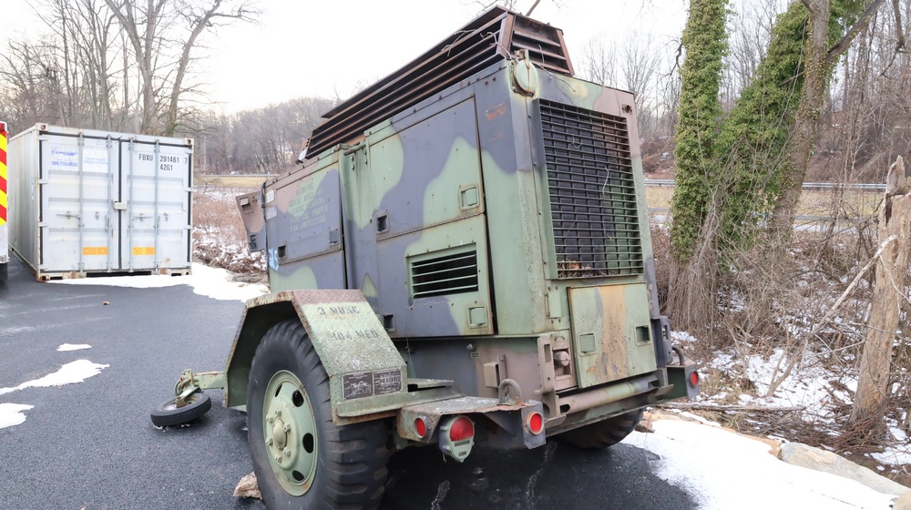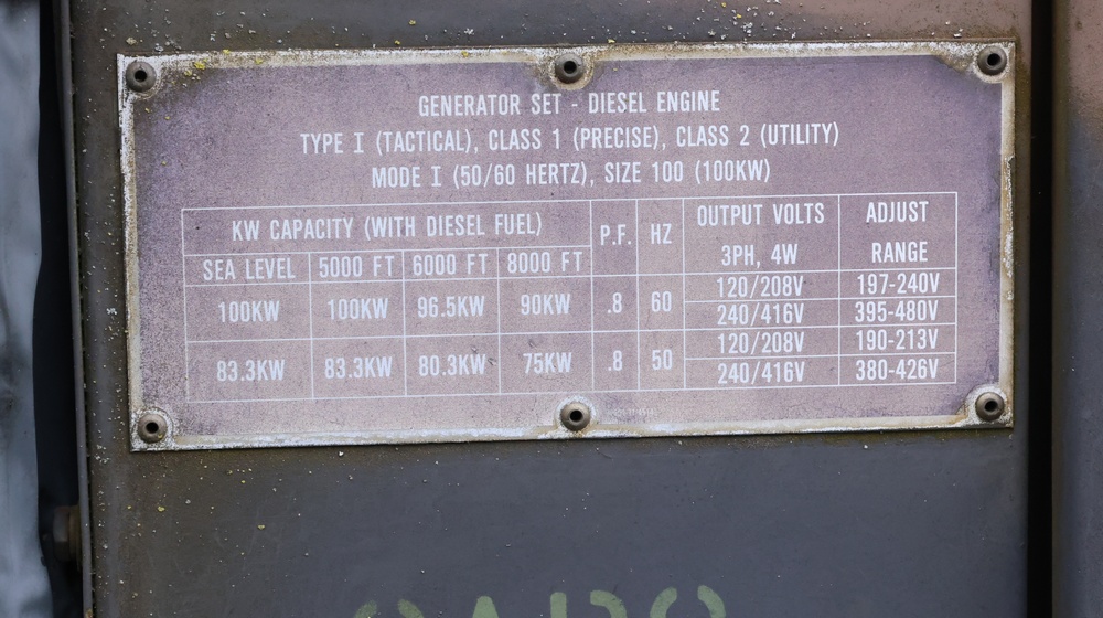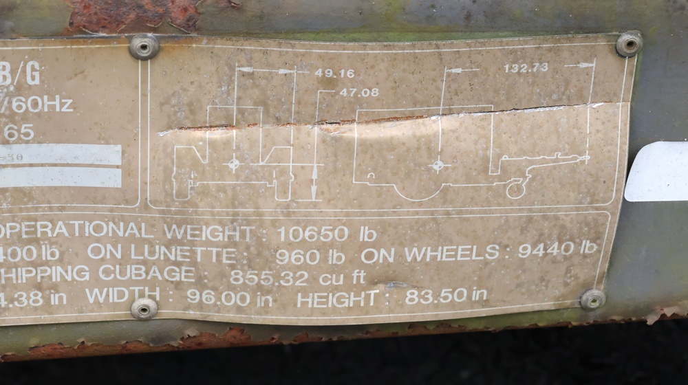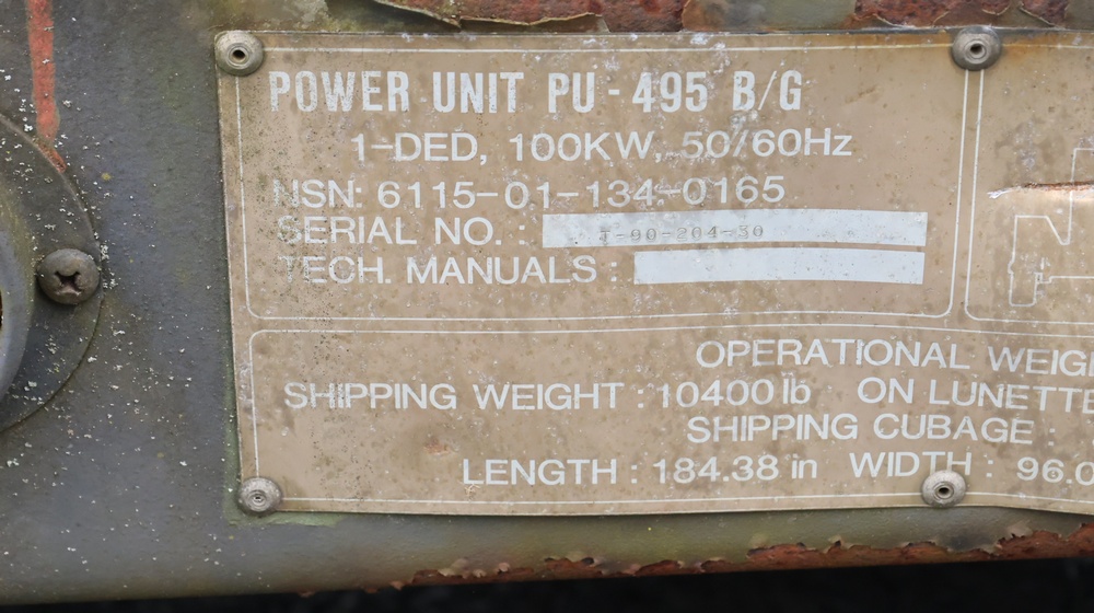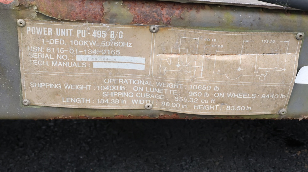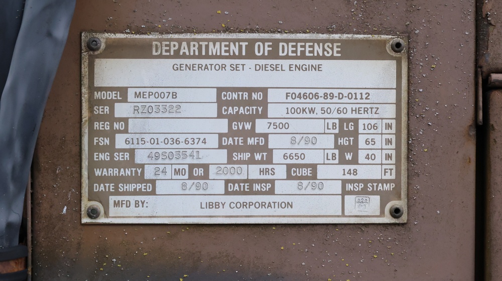 1990 Military Generator. MEP007B / S/N # RZ03322. Hour meter reading: 94. Unknown operating condition. Must be towed.
