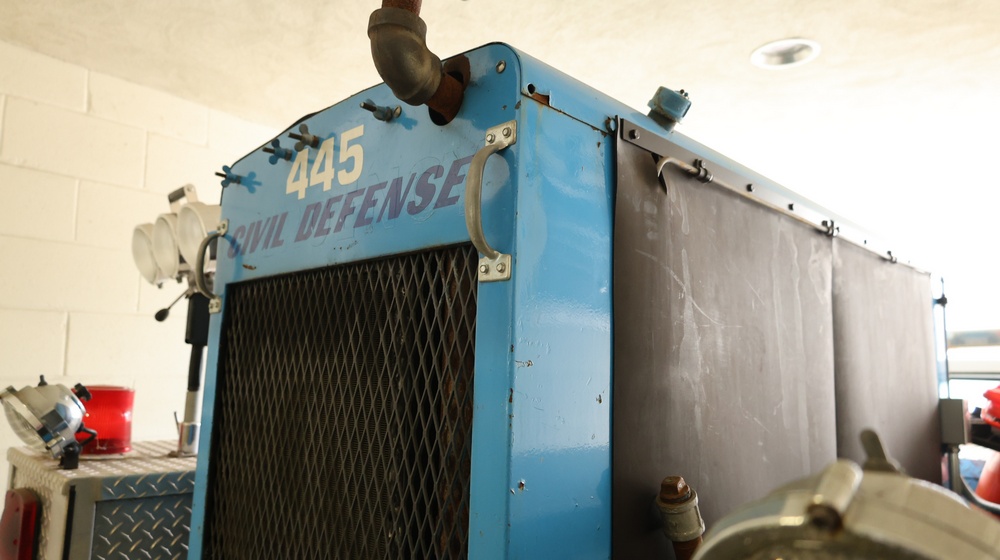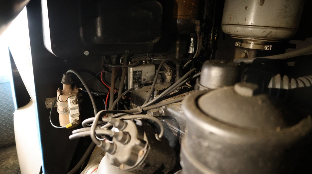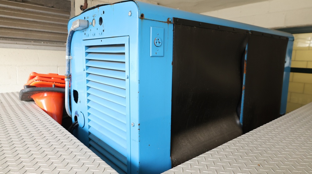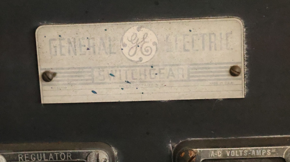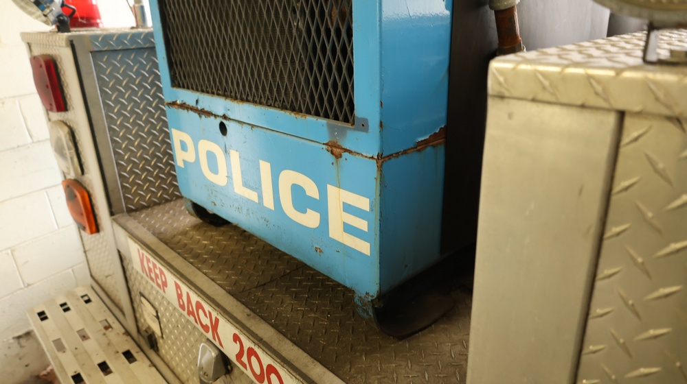 General Electric switchgear and generator assembly housed in a blue metal enclosure, mounted on a vehicle or platform. Control panel includes analog gauges, switches, selector knobs, electrical outlets, and a General Electric time meter reading 2432 hours. Time meter labeled General Electric, model 8KT8Y25. Unit marked “POLICE” on rear enclosure panel. Seller reports: operational. Generator only, truck not included.