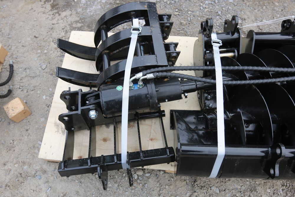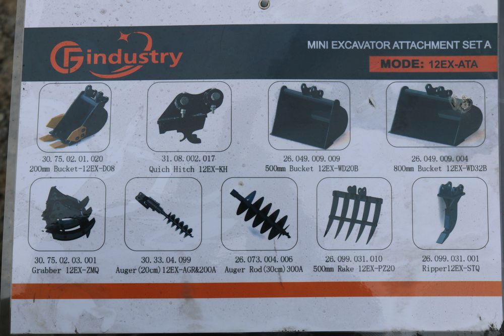 New 2026 AGT Mini Excavator Attachment Set A Model:12EX-ATA including 200mm bucket, quick hitch, 500mm bucket, 800mm bucket, grabber, 20cm auger, 30cm auger, 500mm rake, and ripper.