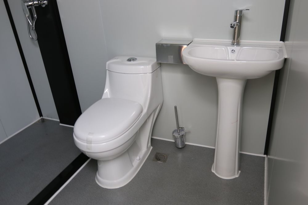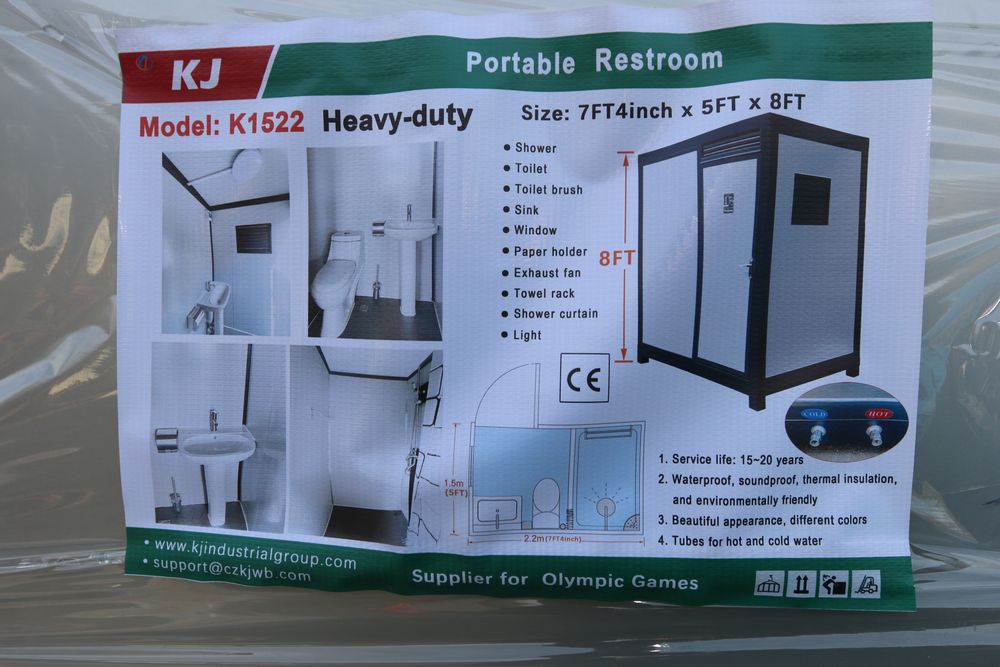 New 2026 KJ portable restroom 7'4" X 5' X 8', includes shower, toilet, toilet brush, sink, window, paper holder, exhaust fan, towel rack, shower curtain, light, model K1522.