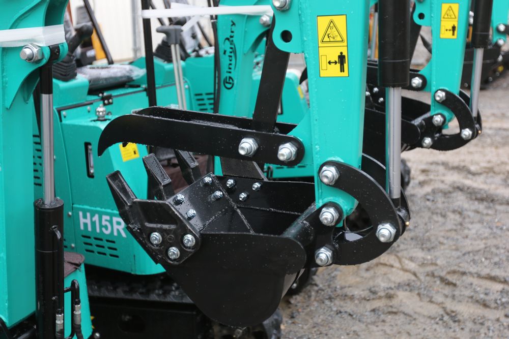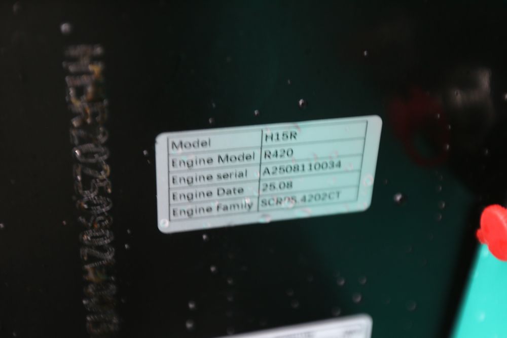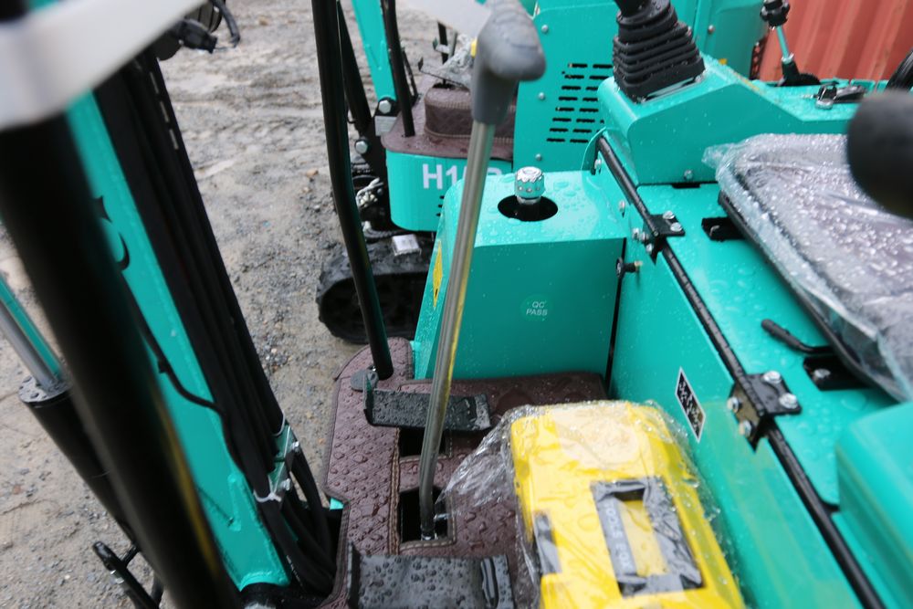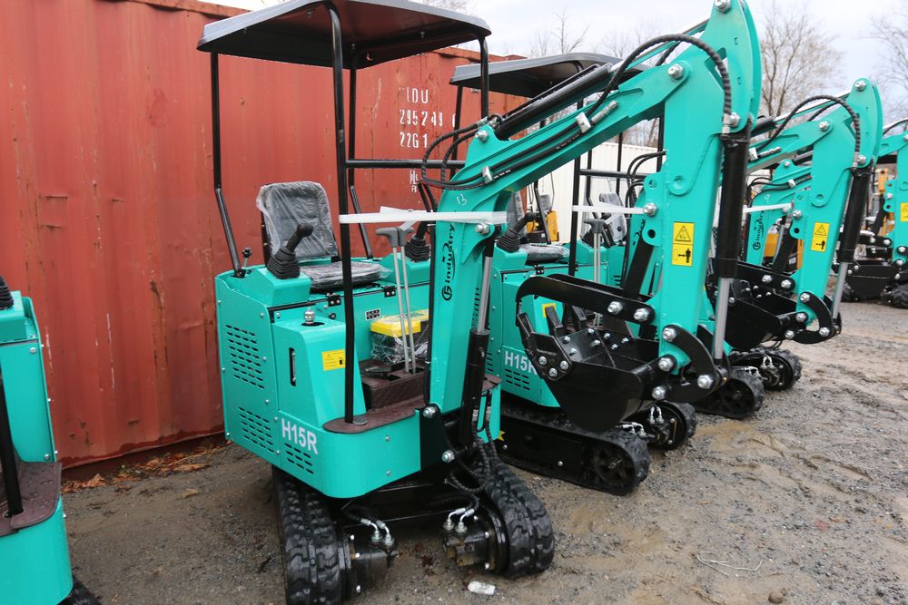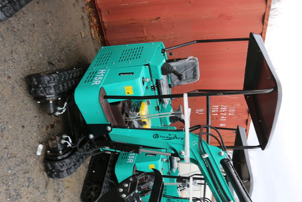 New 2025 CFG Industrial gas powered mini Excavator model H15R with 420cc gasoline engine, bucket, 4' long tracks, 38.5" wide base, 6" wide tracks, canopy, hydraulic boom & bucket controls, pilot system, thumb, dozer blade. Hours reading less than 1 hour.