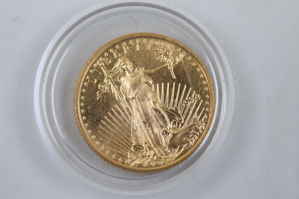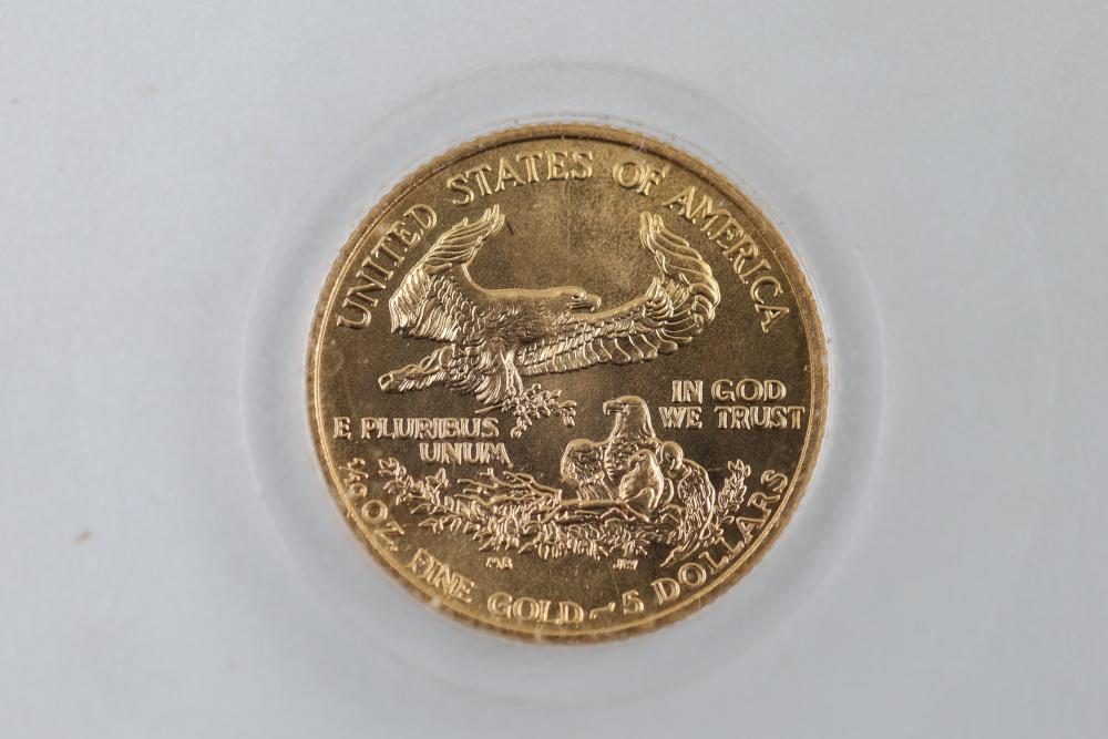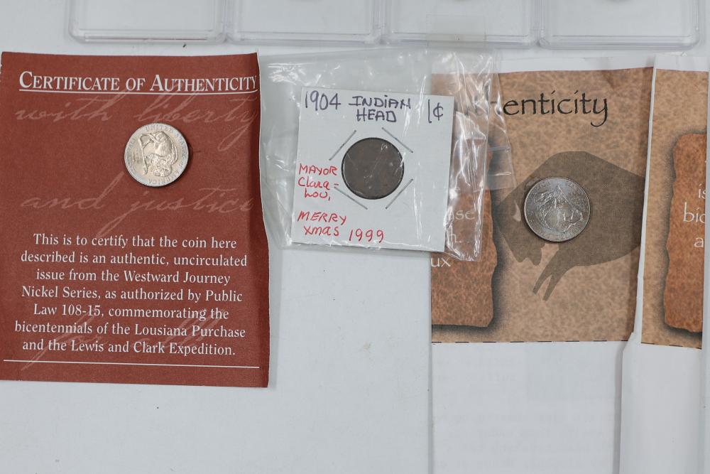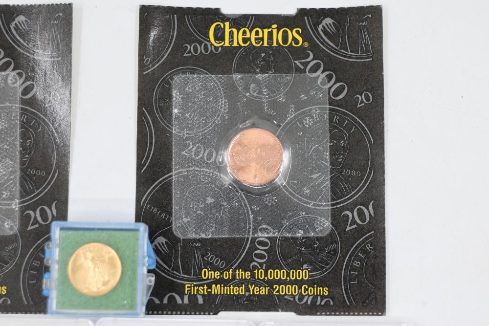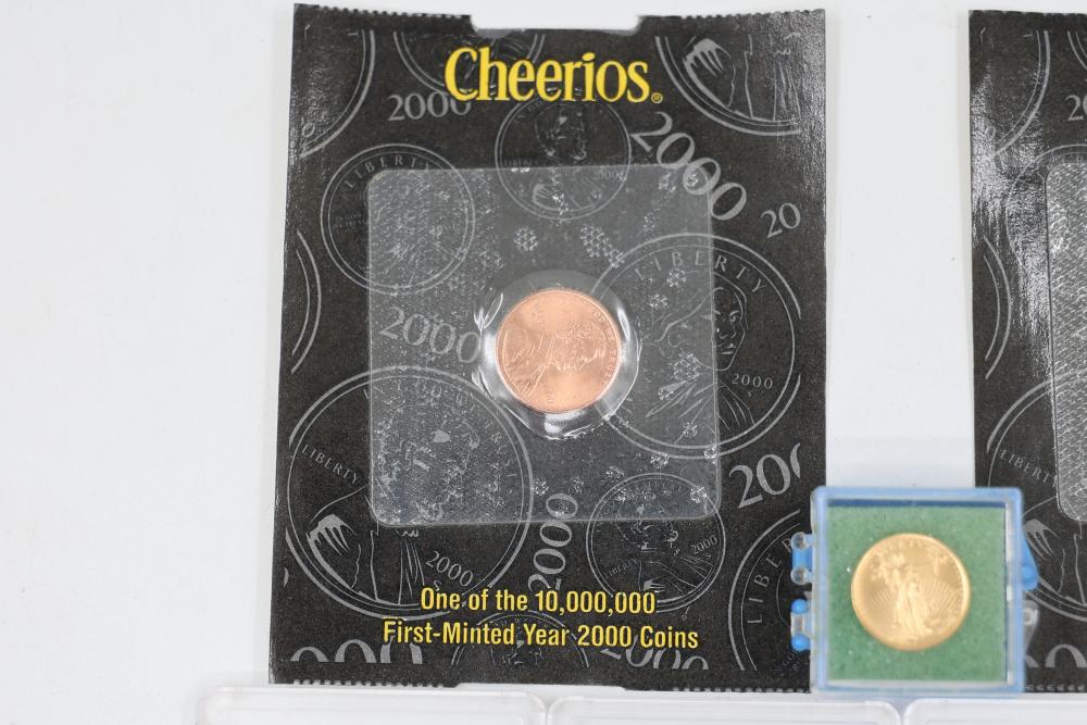 1/10 Oz 24k $5 Gold U.S. Coins and Nickel Coins with Certificates (1992-2000, MCMXCI, Indian Head 1904). Includes a variety of coins, including gold coins in protective cases, and an Indian Head penny (1904). Tested with JSP solution.