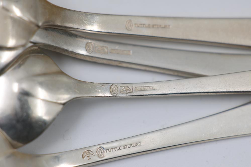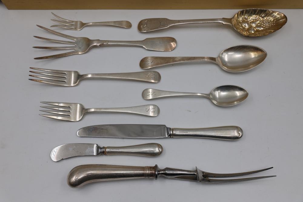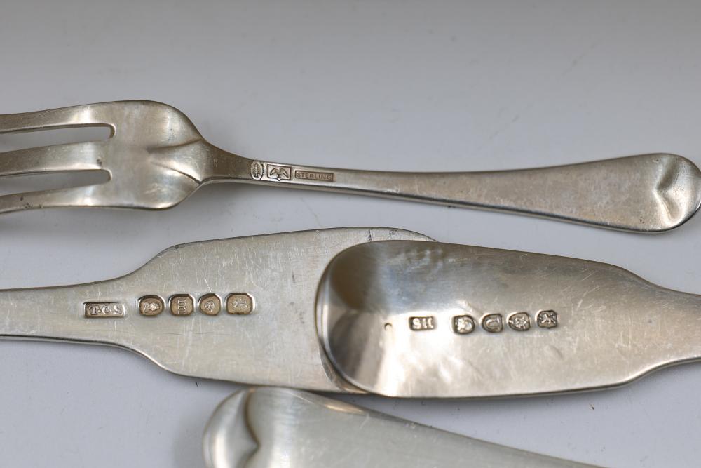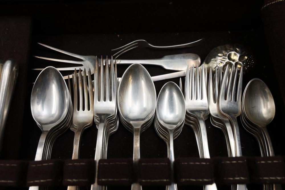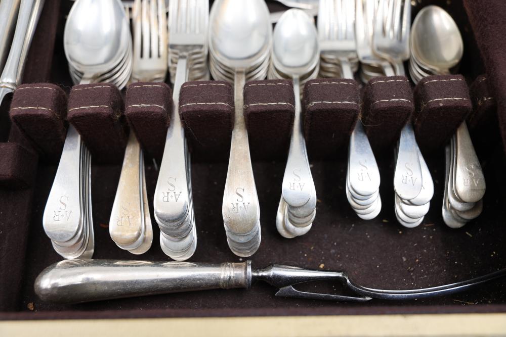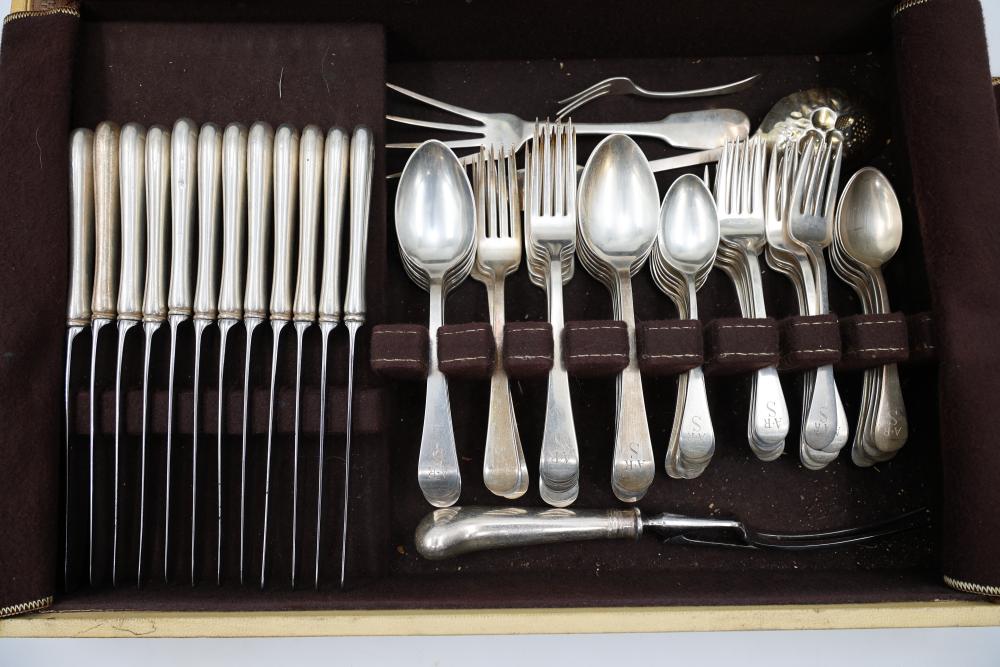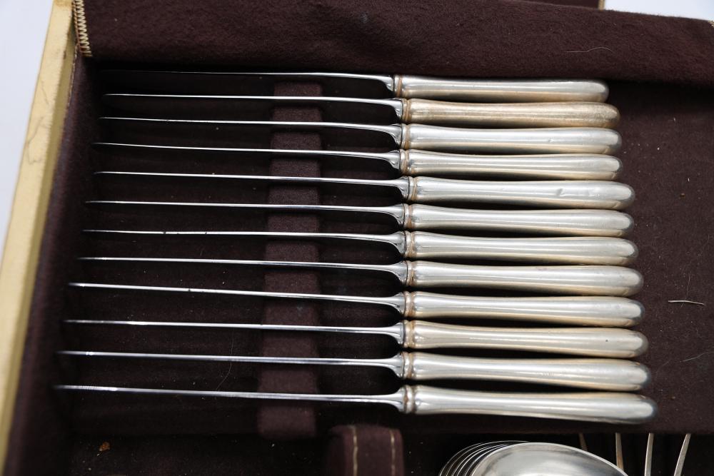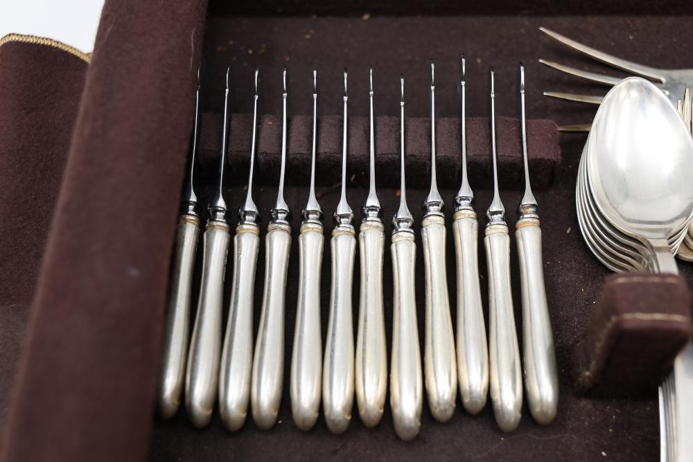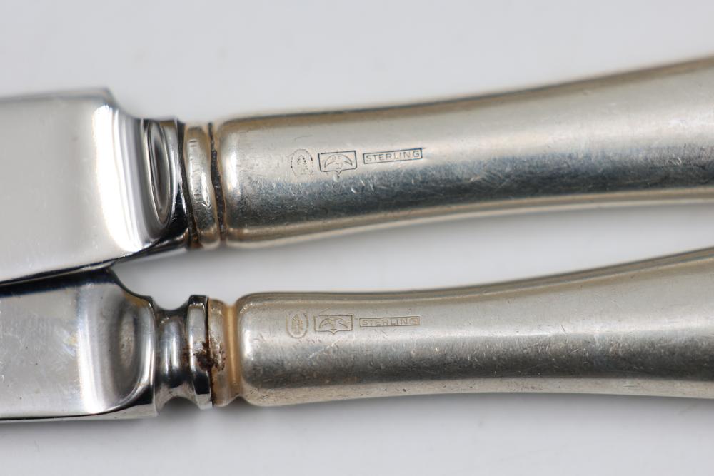 Sterling Stamper Silver Cutlery Set with Assorted Pieces and Hallmarks. Includes various knives, spoons, forks, and serving utensils of matching design, contained within a fitted case for storage and display. 2575 grams of Sterling, with the total weight including sterling handles being 4133 grams.