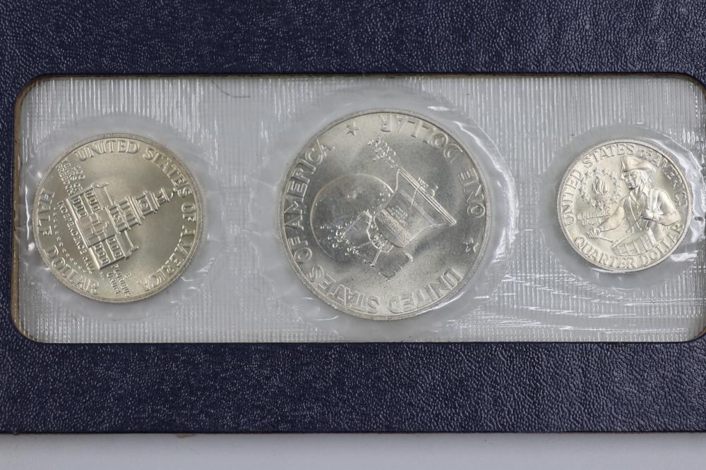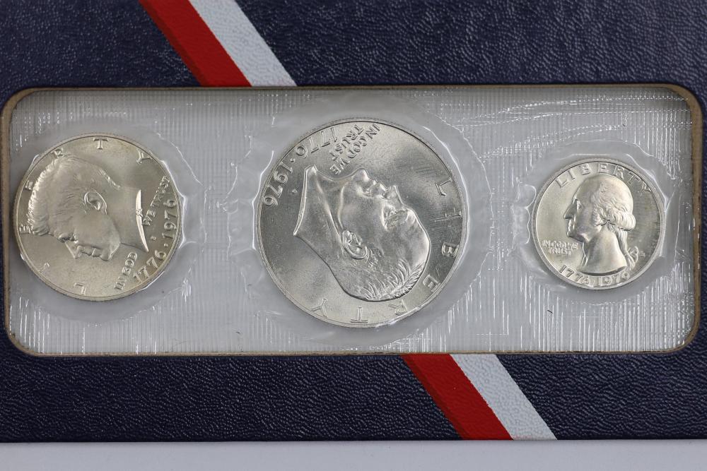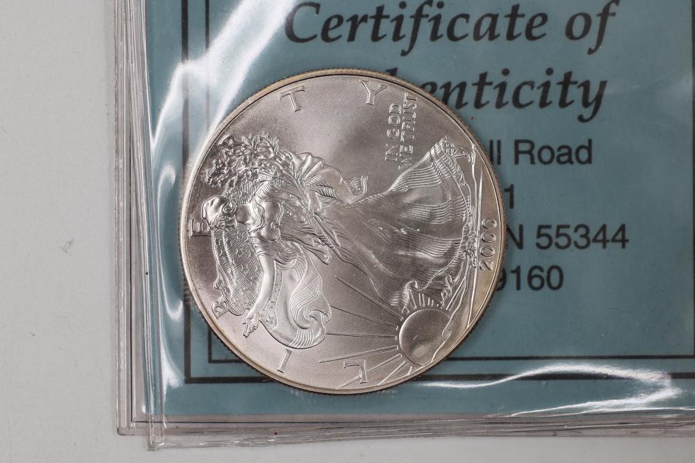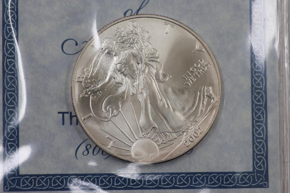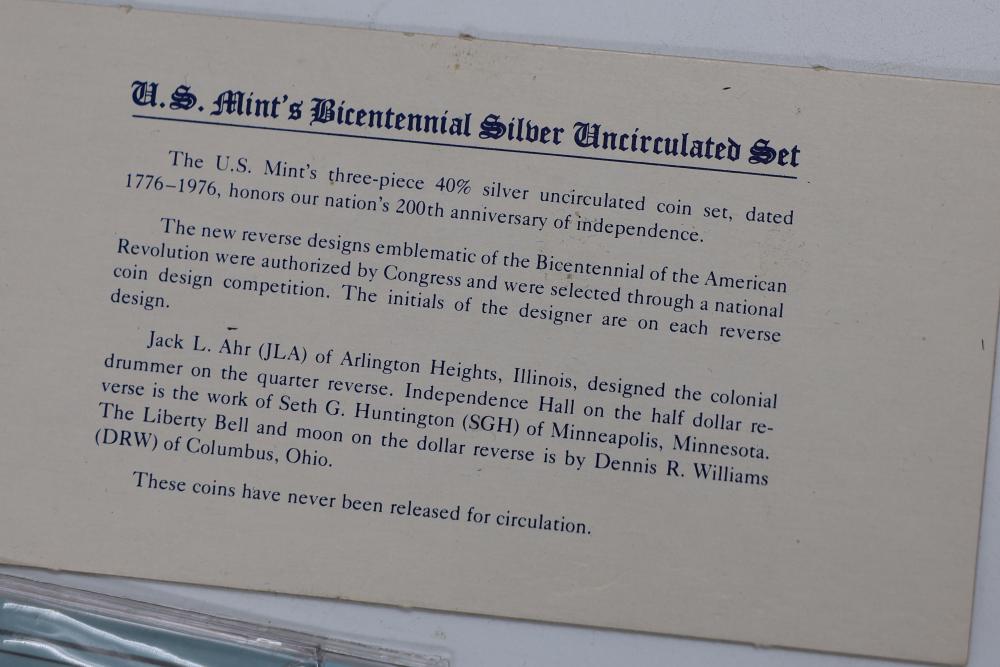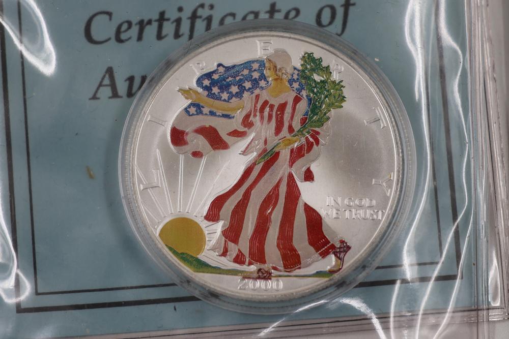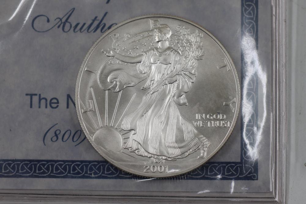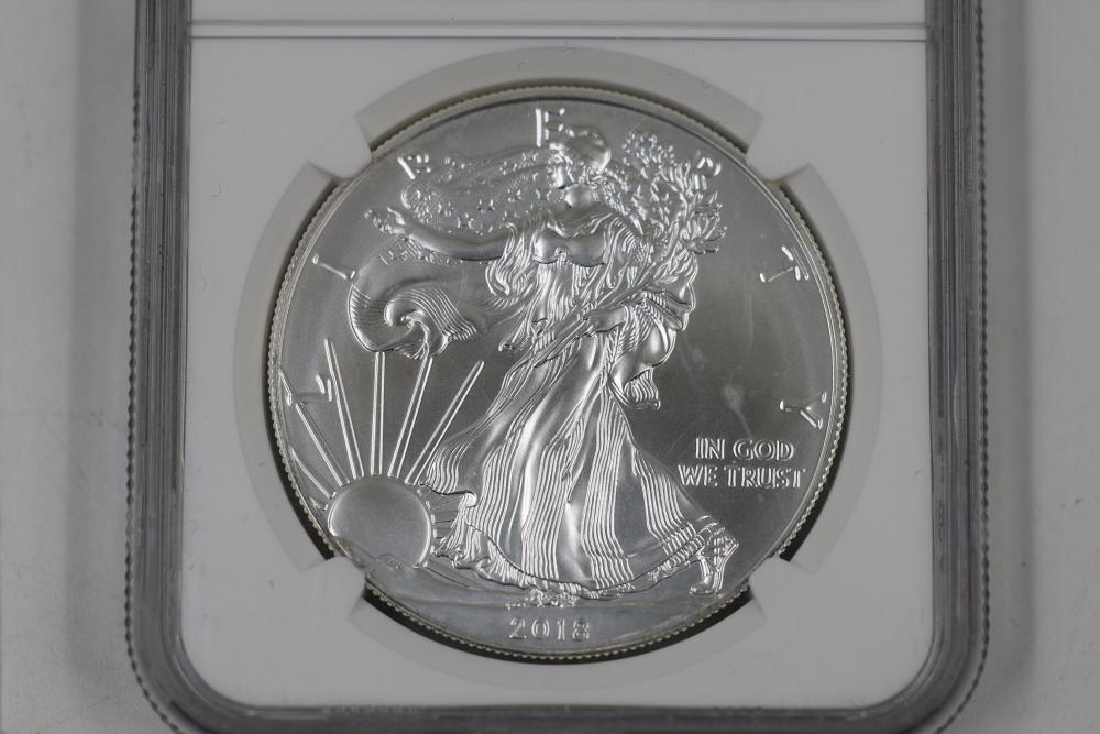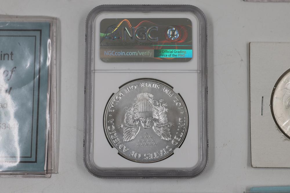 U.S. Silver Dollars and Bicentennial Set including a 2018 Standing Liberty $1 First Release slabbed and graded MS-69 by NGC. Years included are 2000, 2001, 2002, 2009, and 2018.