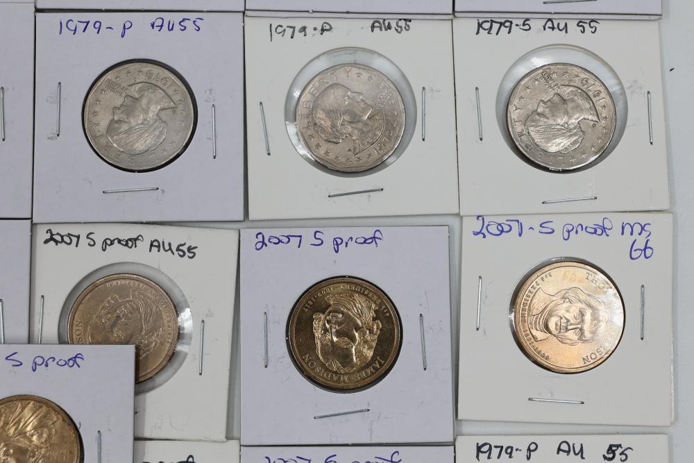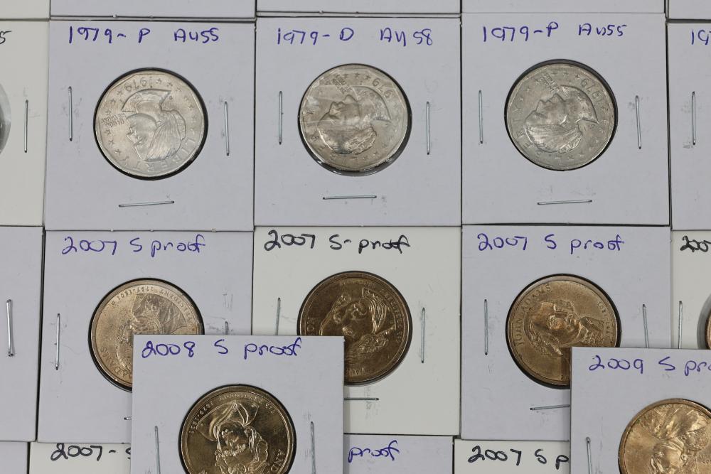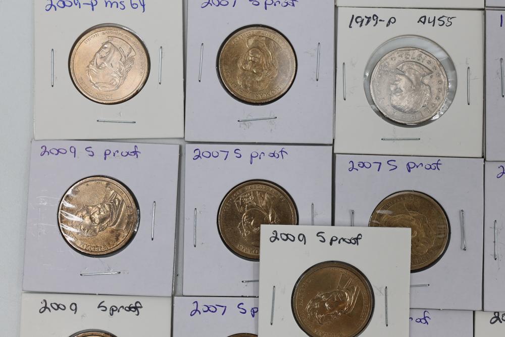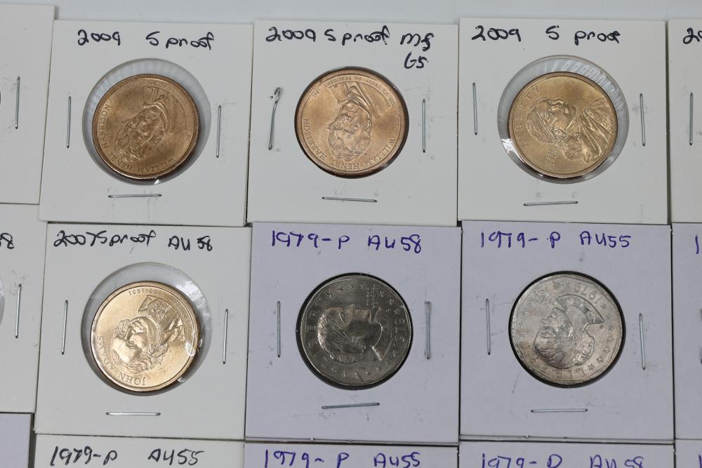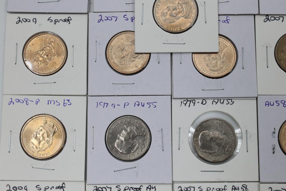 U.S. $1 Presidential Dollars and Susan B Anthony $1 Coins from years 1979, 2007, 2008, and 2009 in variable conditions. 75 coins in total.