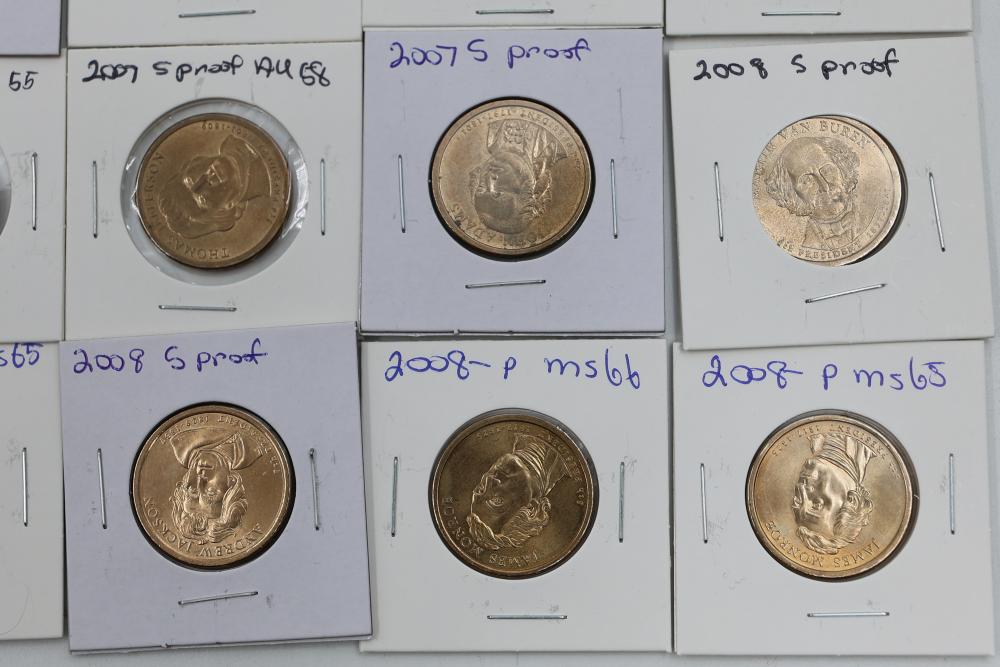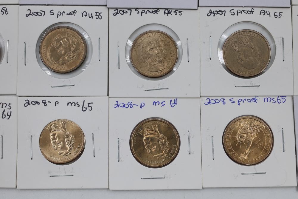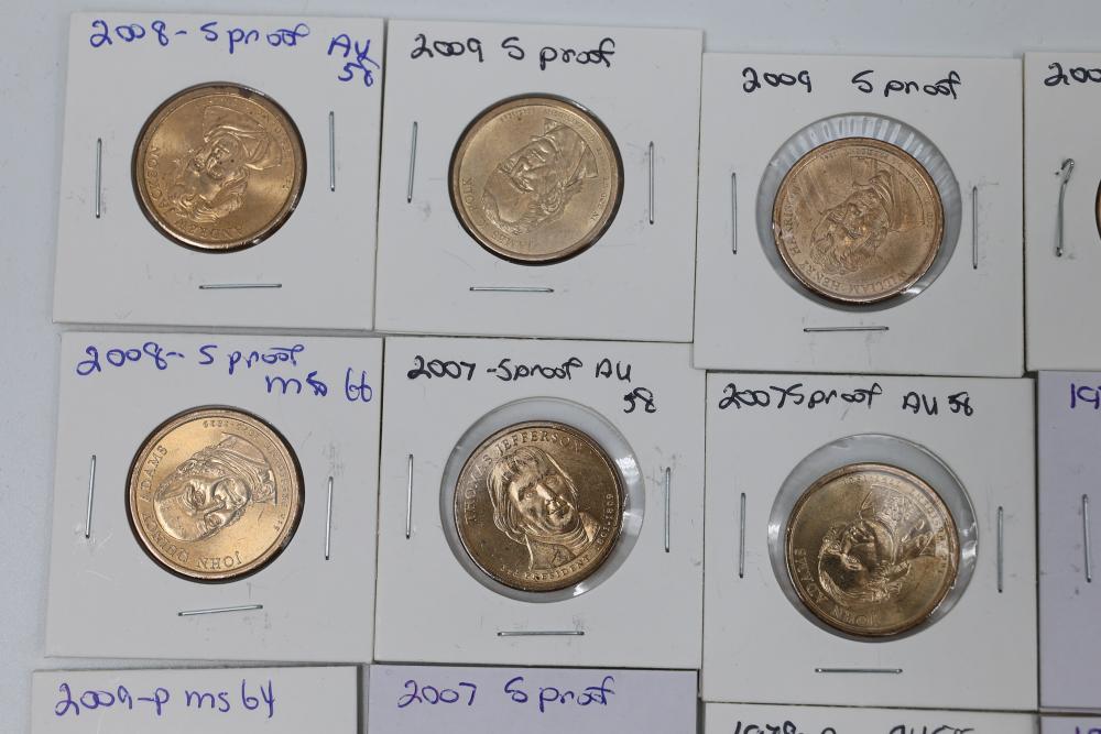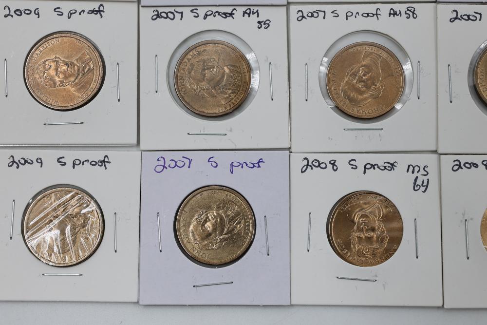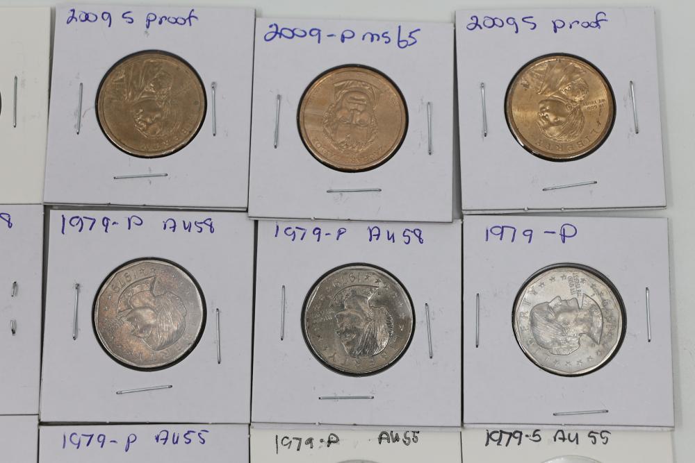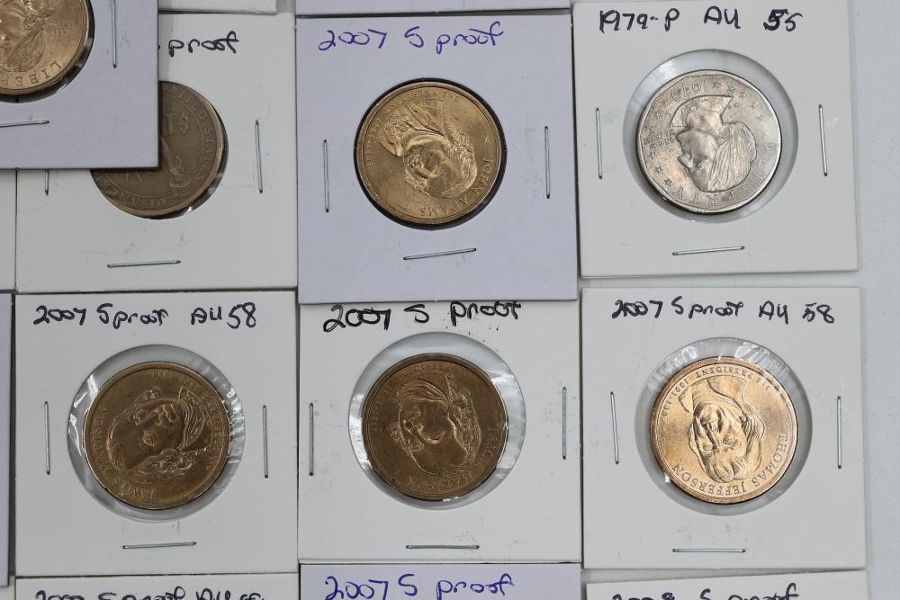U.S. $1 Presidential Dollars and Susan B Anthony $1 Coins from years 1979, 2007, 2008, and 2009 in variable conditions. 75 coins in total.
