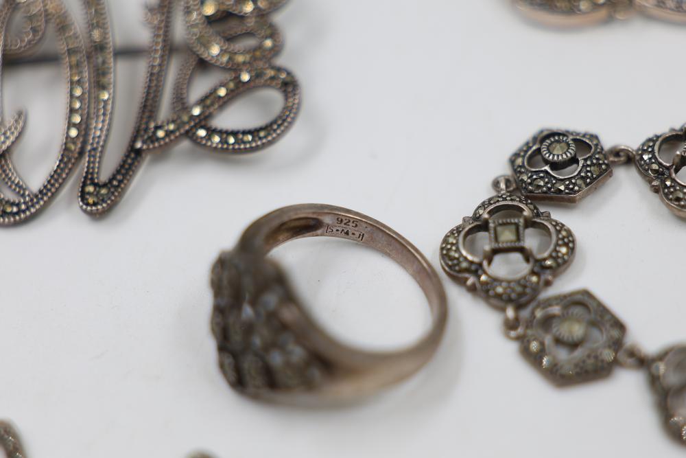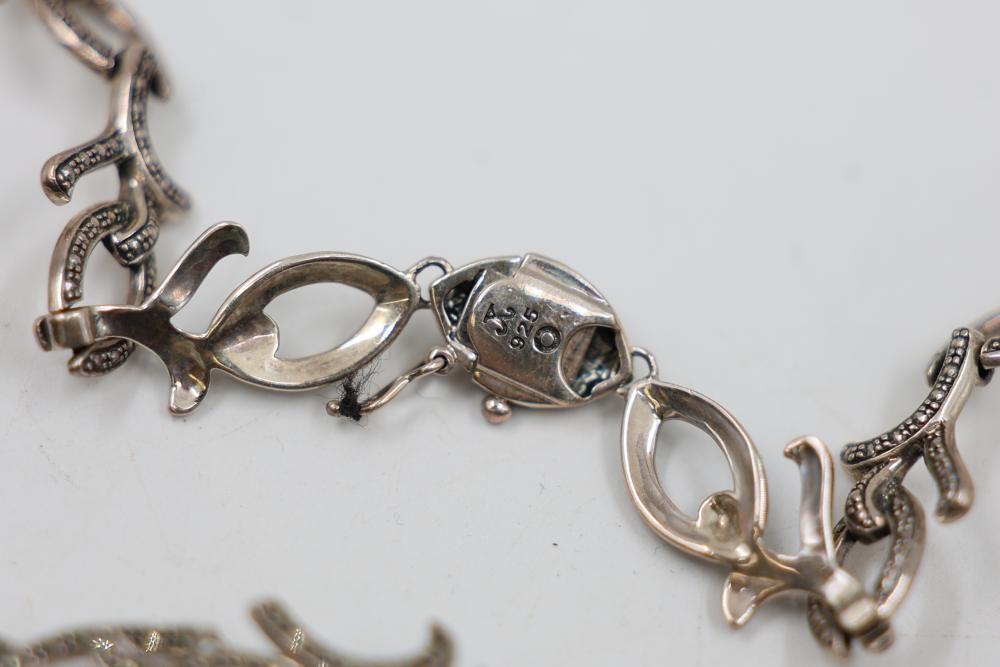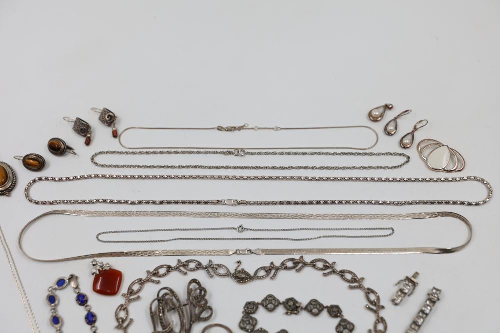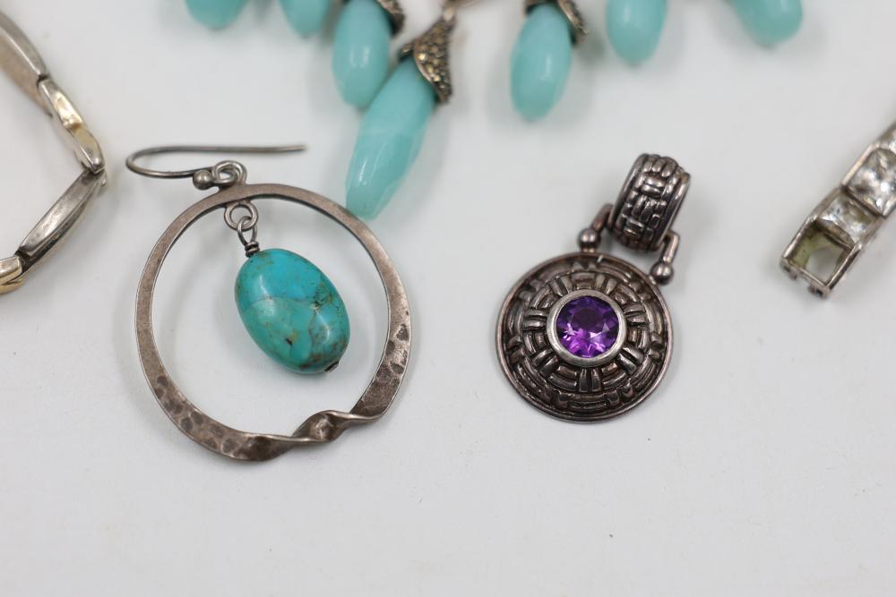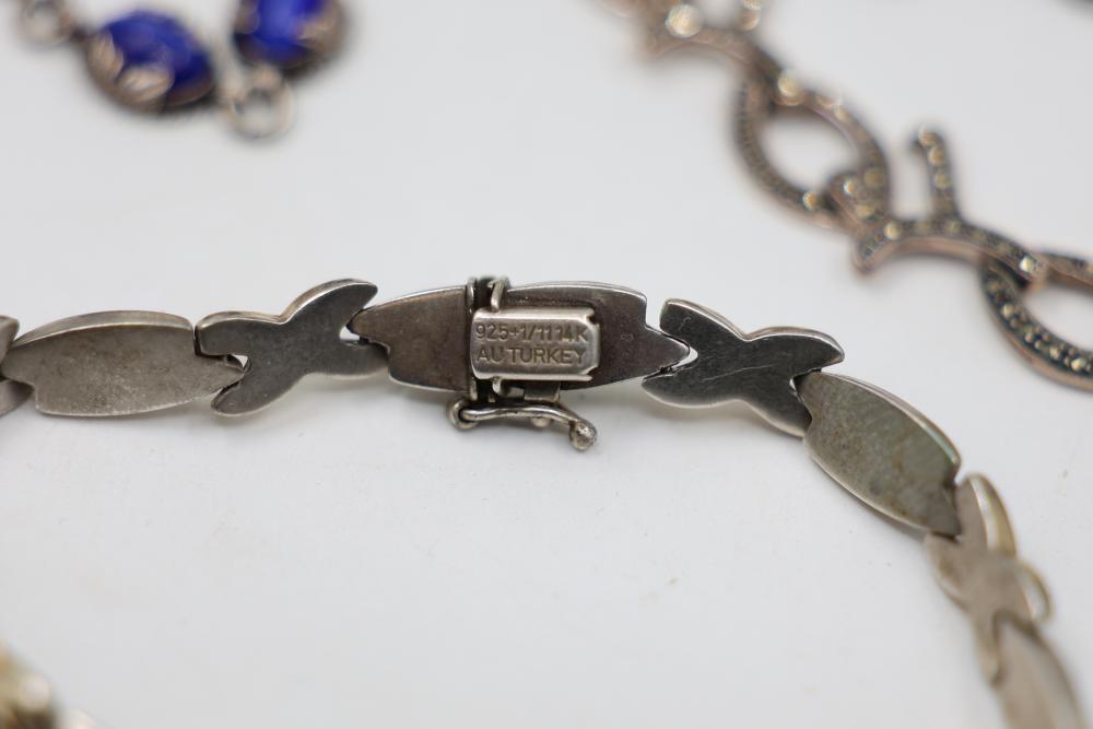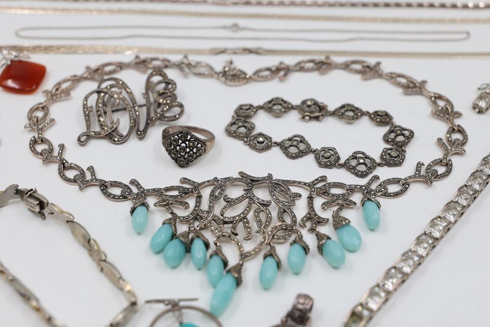 Sterling Silver and Gemstone Jewelry. Includes necklaces, bracelets, earrings, and pendants, featuring designs crafted in sterling silver, gemstones, and marcasite accents. Markings indicate 925 sterling silver and some makers. Sterling weight is 48 grams, total weight being 239 grams.