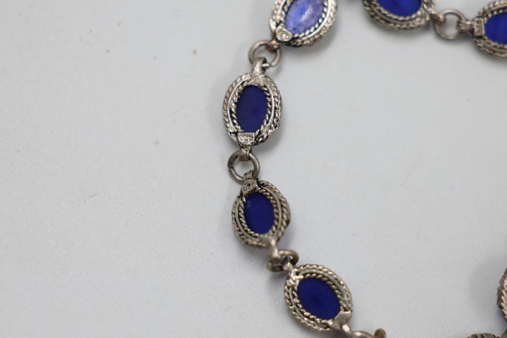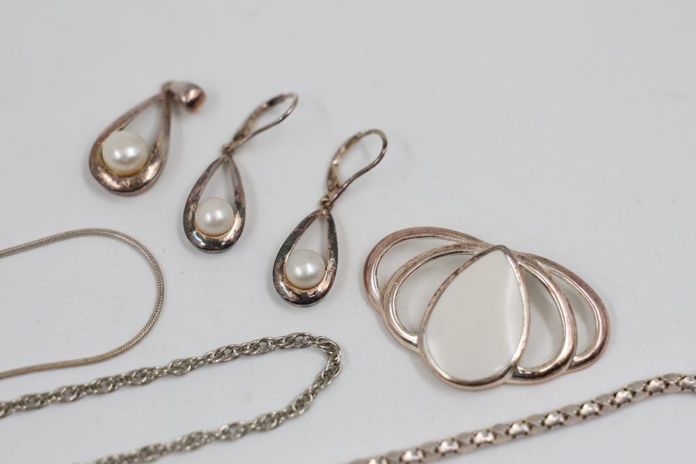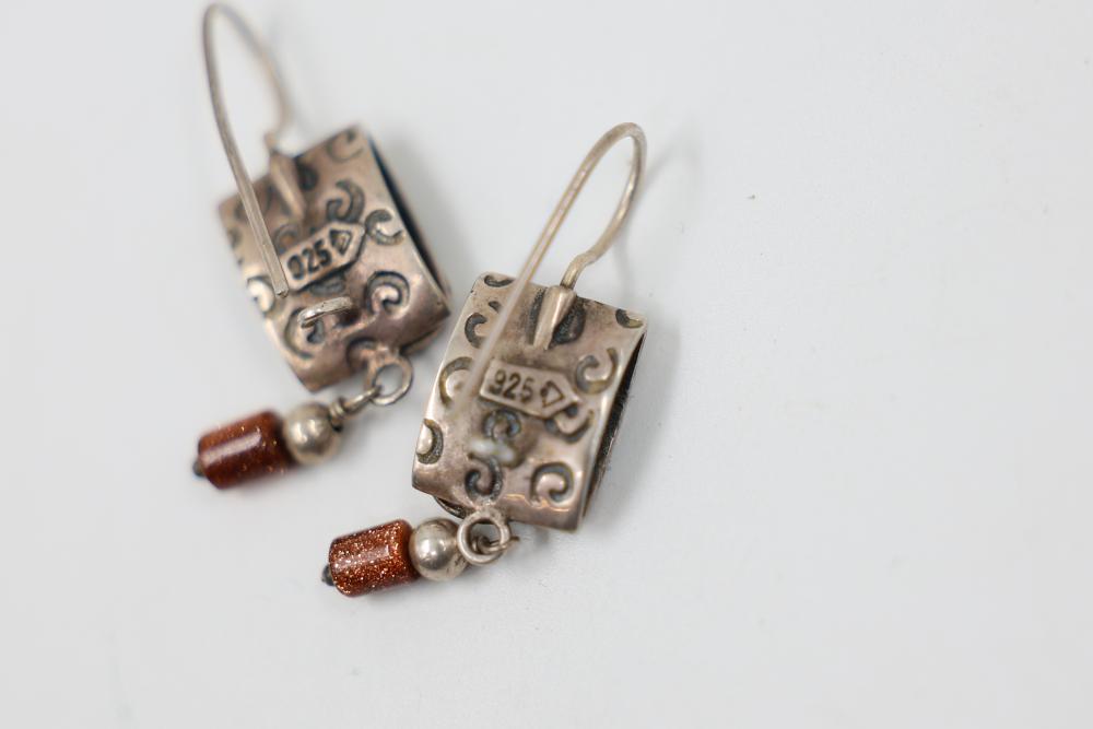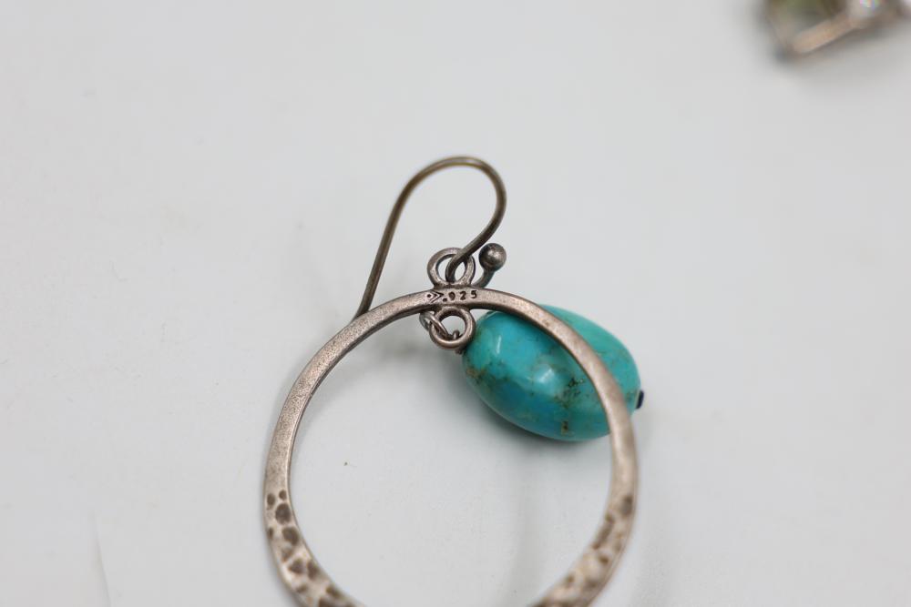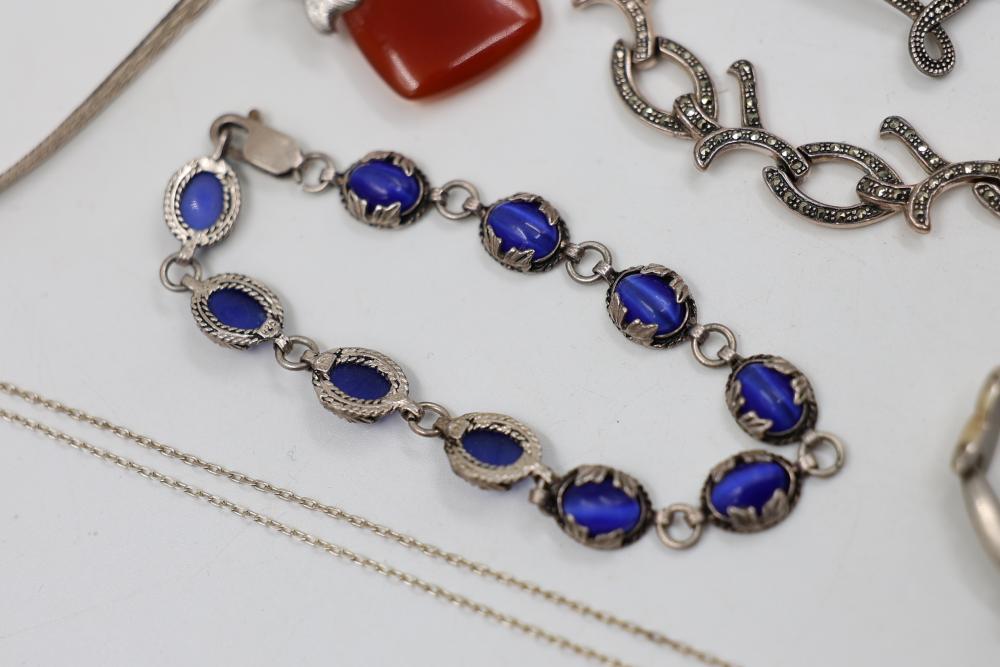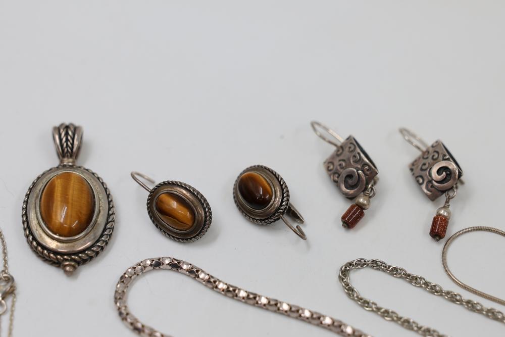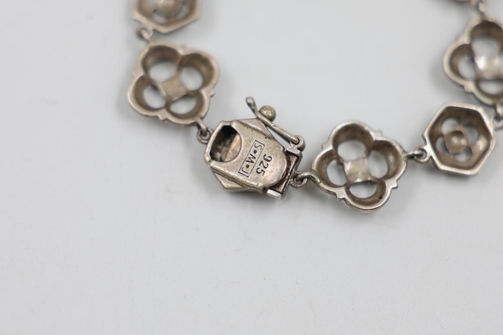 Sterling Silver and Gemstone Jewelry. Includes necklaces, bracelets, earrings, and pendants, featuring designs crafted in sterling silver, gemstones, and marcasite accents. Markings indicate 925 sterling silver and some makers. Sterling weight is 48 grams, total weight being 239 grams.