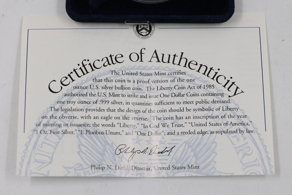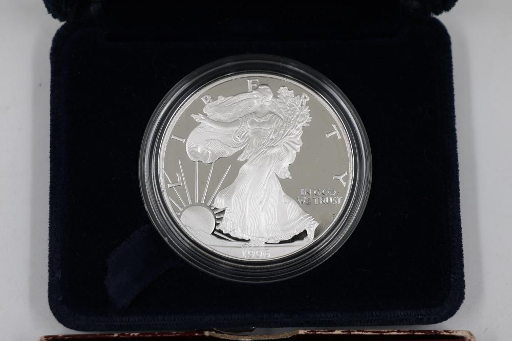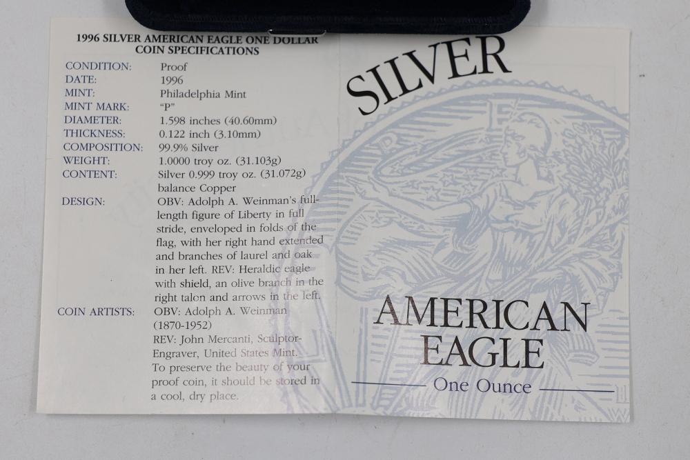 1996 Silver American Eagle One Dollar Proof Coin and George Washington Half Dollar. The American Eagle Proof coin is 1 oz of .999 fine silver.
