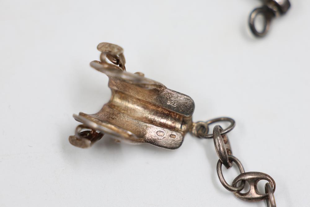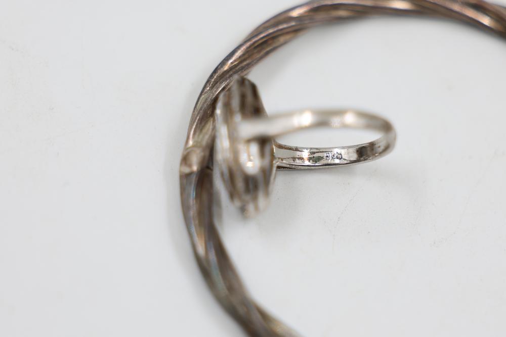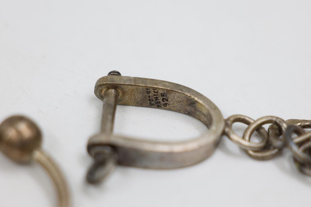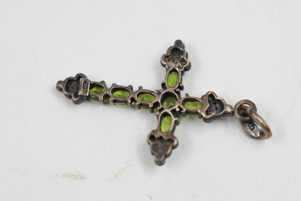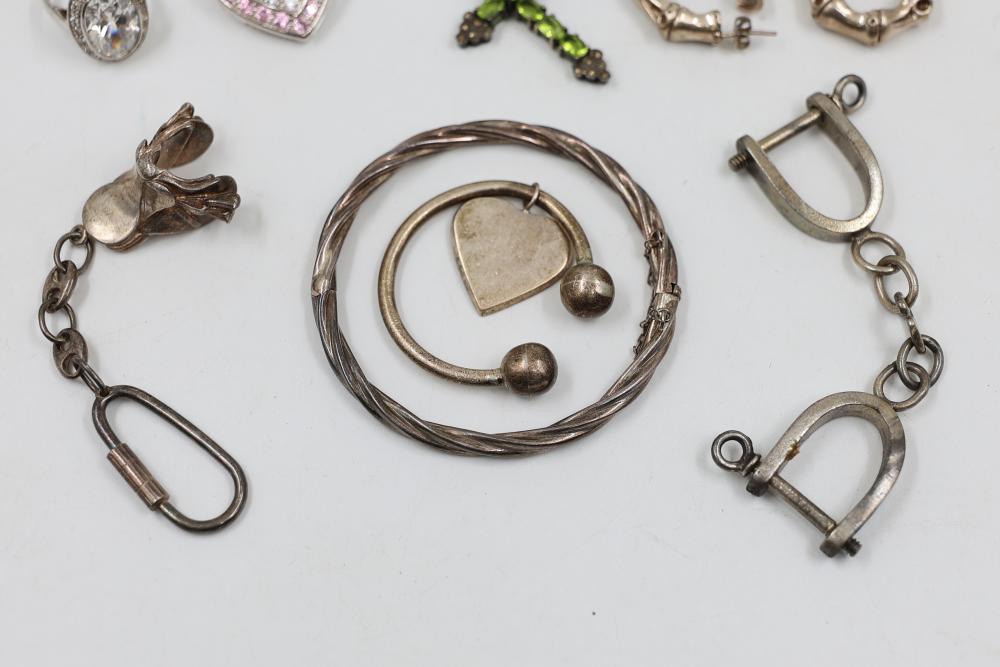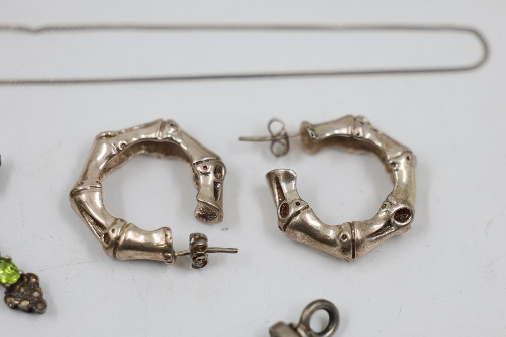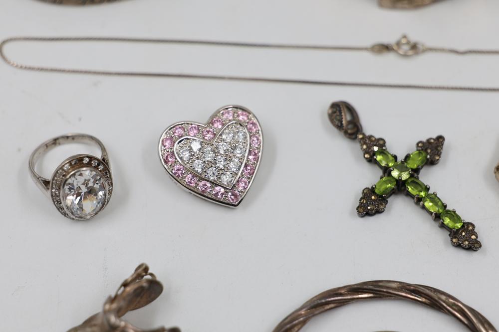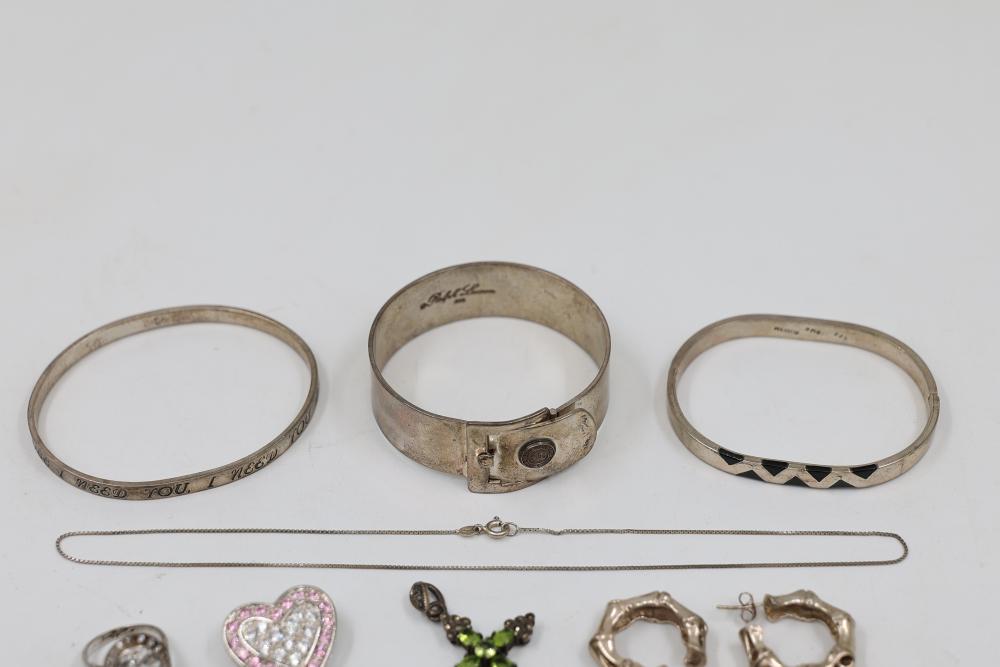 Sterling Silver Jewelry including bracelets, rings, a heart-shaped pin, a cross pendant with green stones, hoop earrings, and other decorative accessories. Some items stamped with 925. Sterling weight is 212 grams. Total weight is 234 grams.