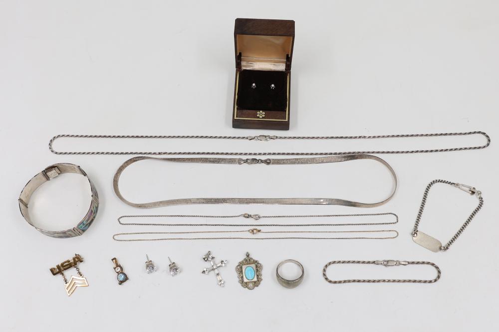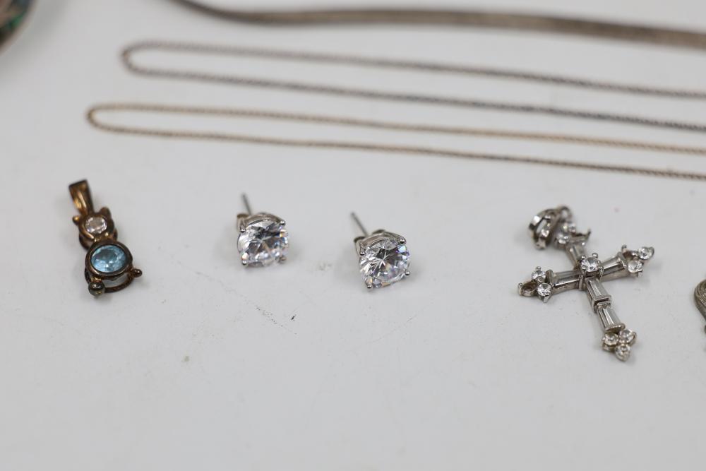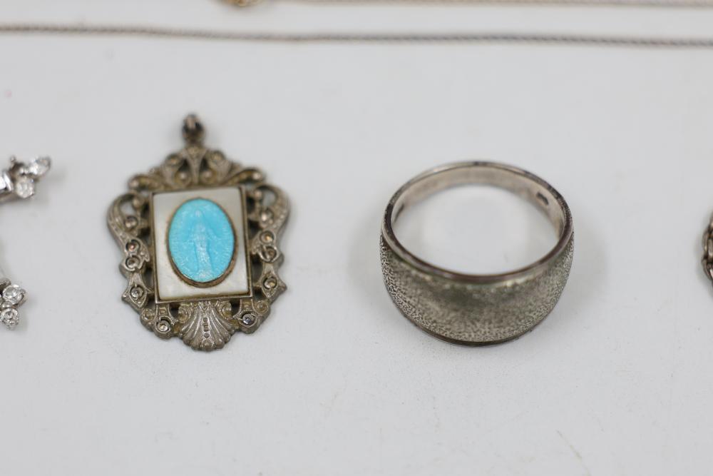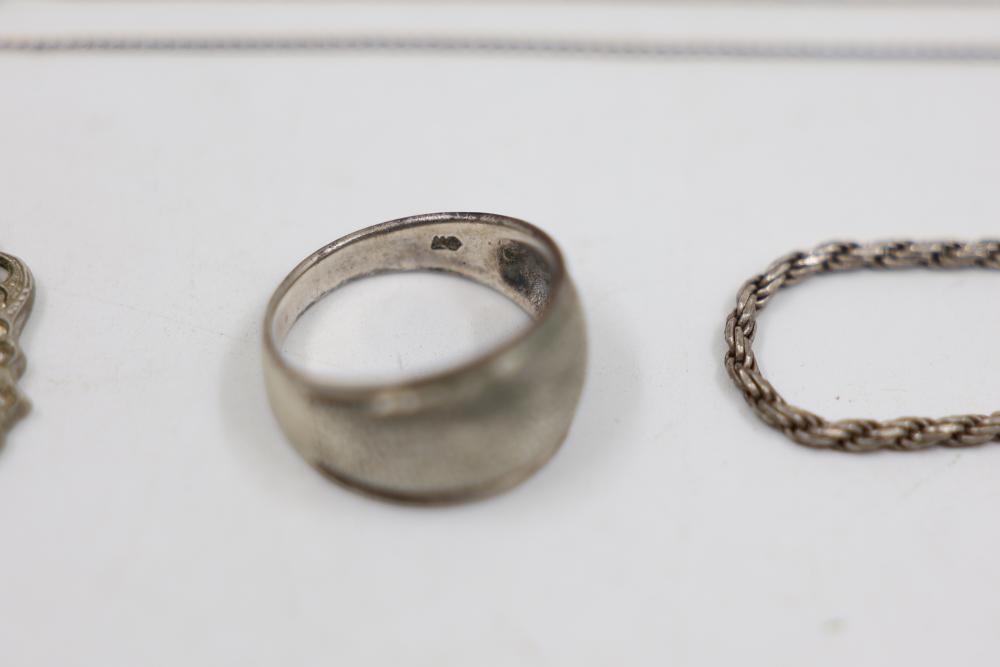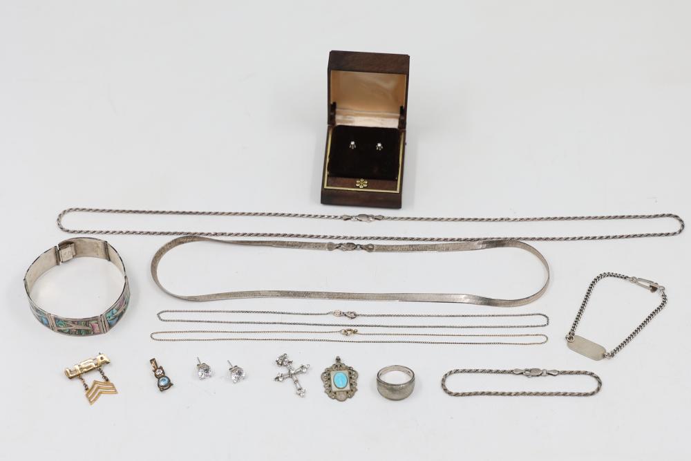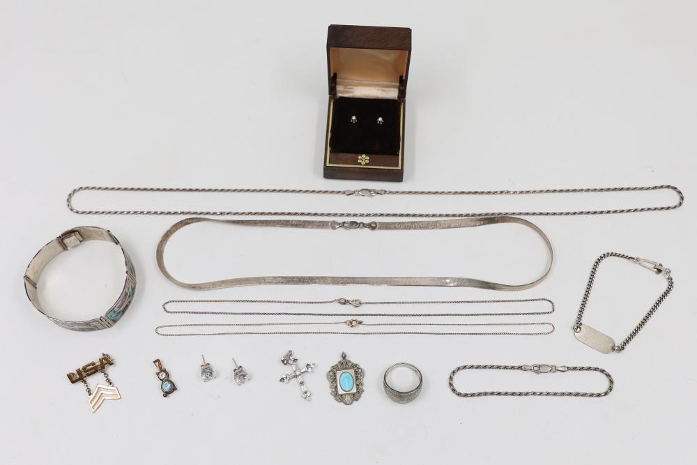 Sterling and .925 Stamped Jewelry Assortment. Includes necklaces, rings, earrings, a bracelet with abalone style inlay, and pendants. Sterling weight being 45 grams. Total weight being 77 grams.