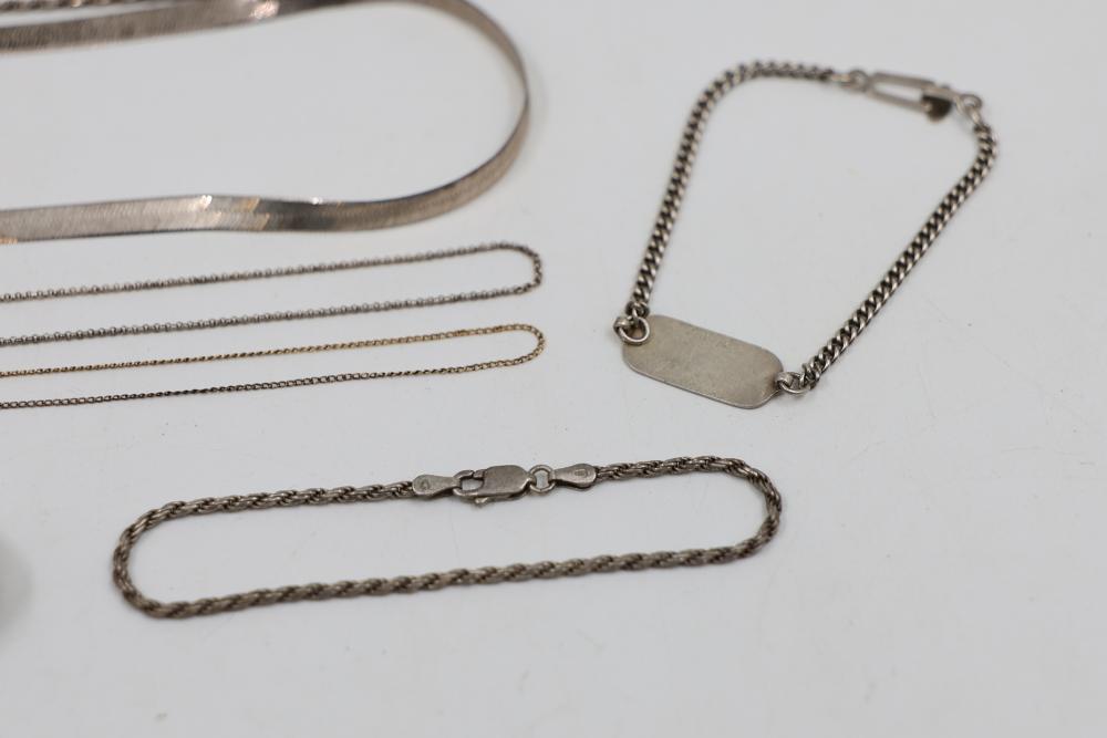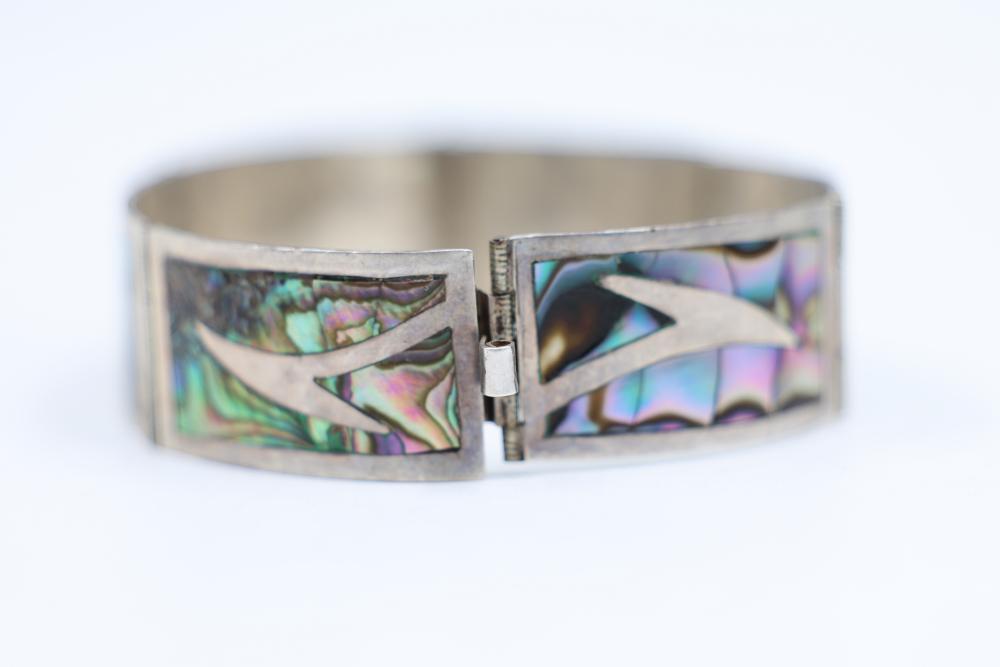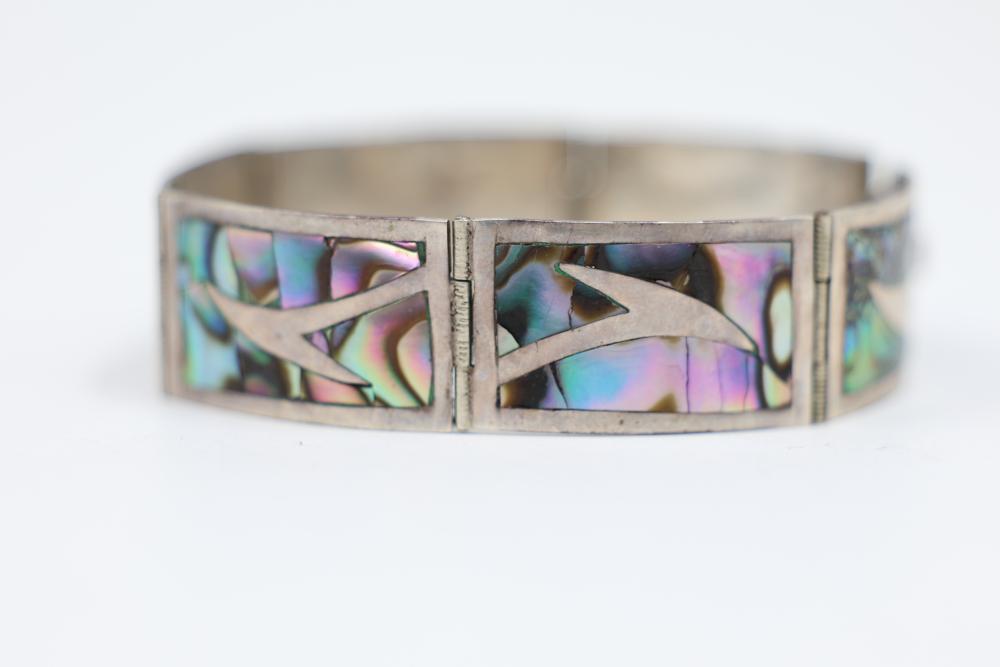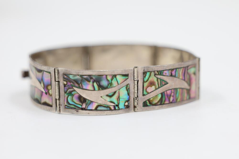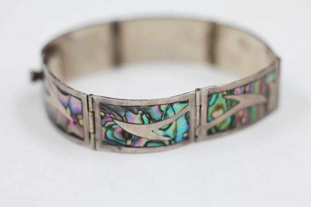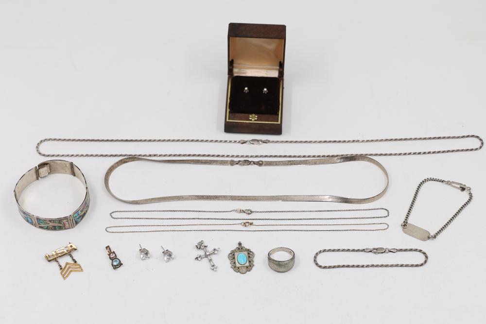 Sterling and .925 Stamped Jewelry Assortment. Includes necklaces, rings, earrings, a bracelet with abalone style inlay, and pendants. Sterling weight being 45 grams. Total weight being 77 grams.