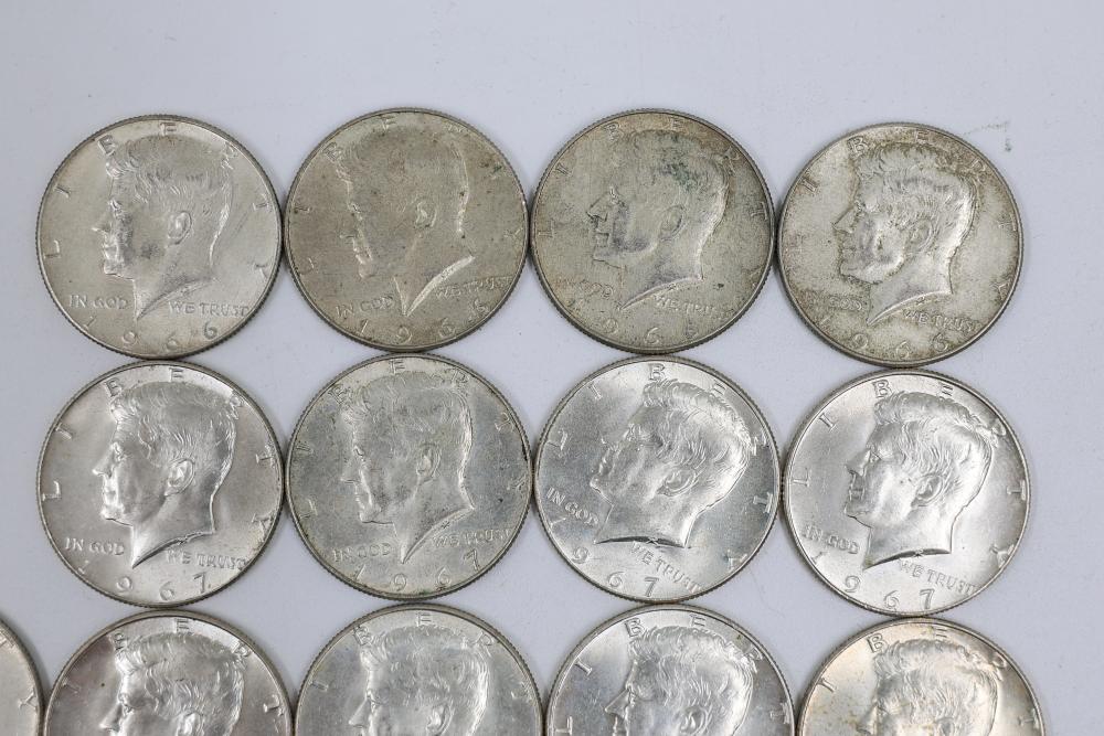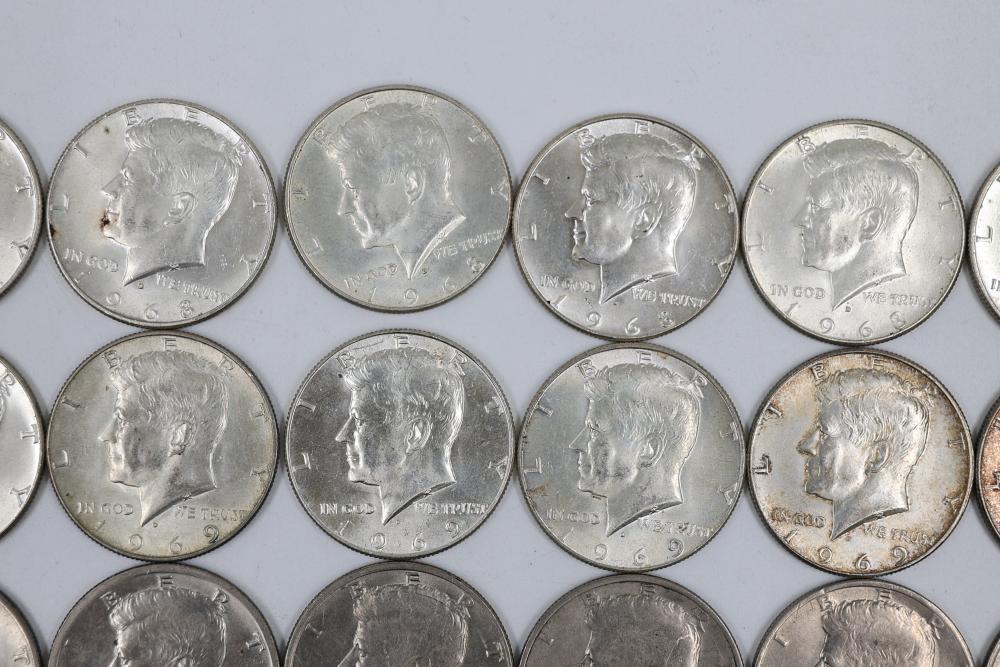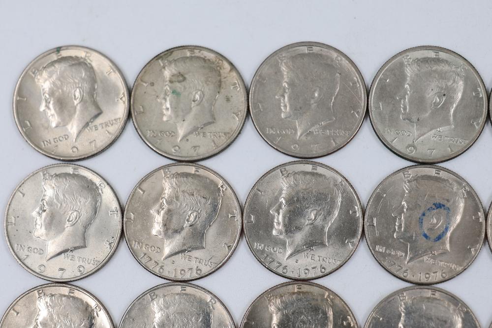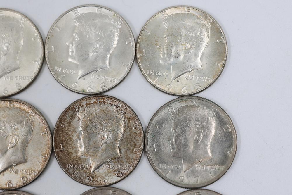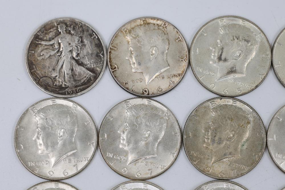 U.S. 50c Half Dollars with Walking Liberty and Kennedy Designs from the years 1936, 1964, 1965, 1966, 1967, 1968, 1969, 1971, 1972, 1974, 1976, 1979, 1986.