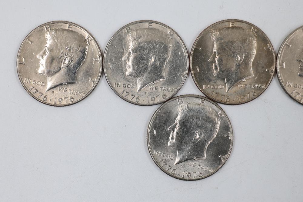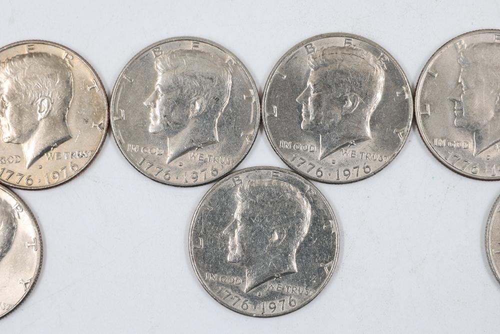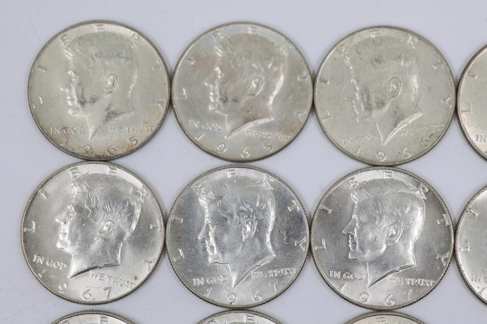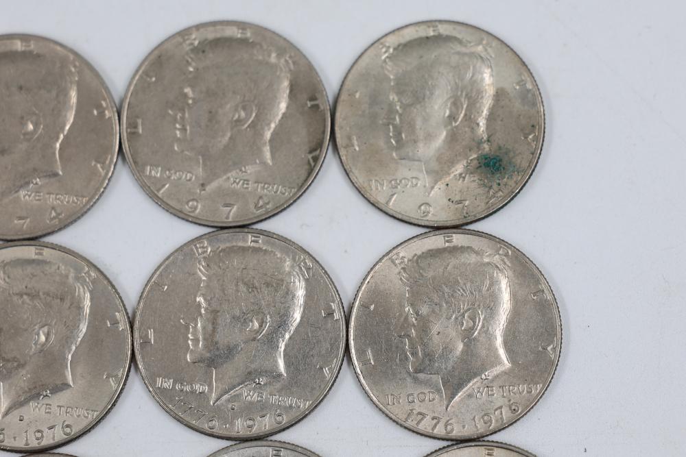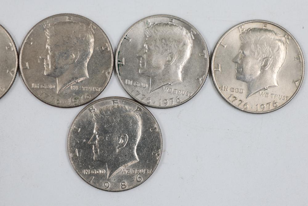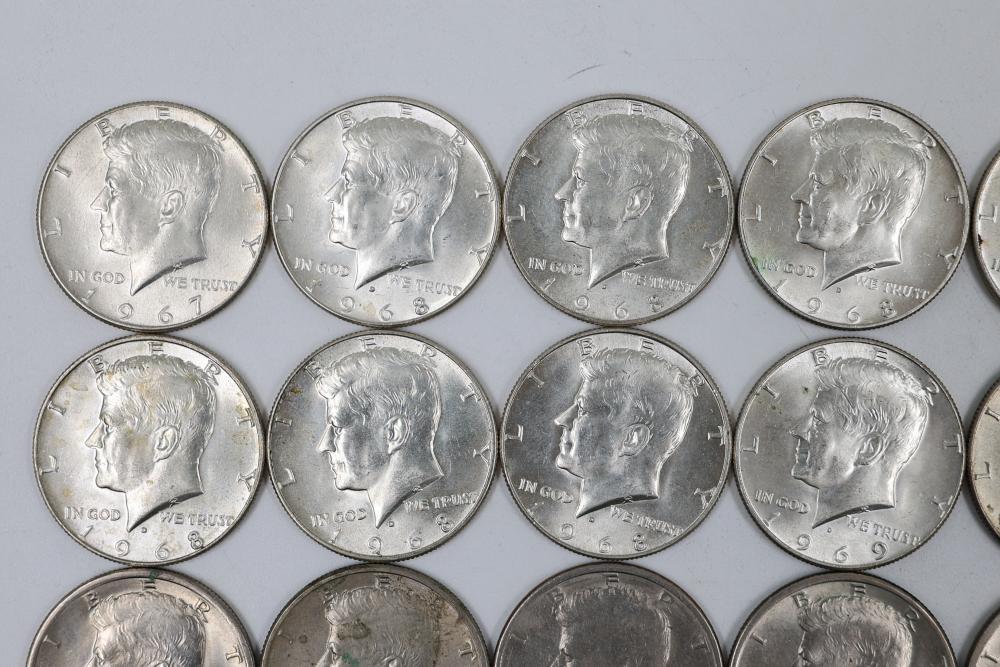 U.S. 50c Half Dollars with Walking Liberty and Kennedy Designs from the years 1936, 1964, 1965, 1966, 1967, 1968, 1969, 1971, 1972, 1974, 1976, 1979, 1986.