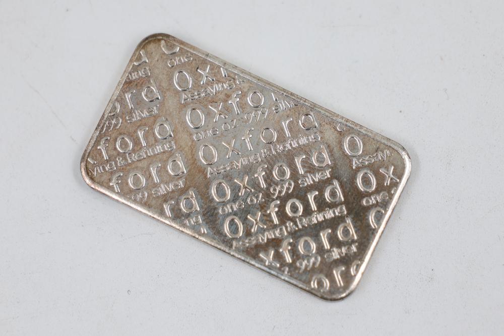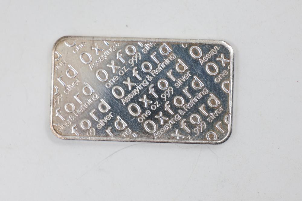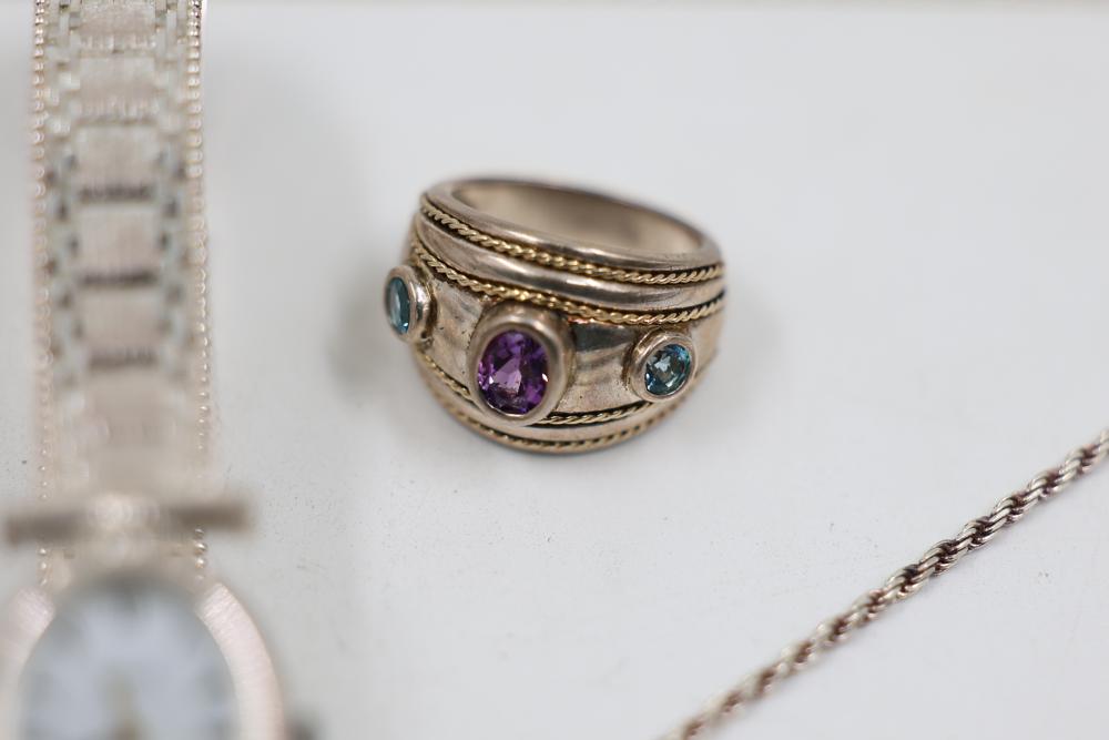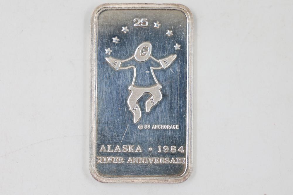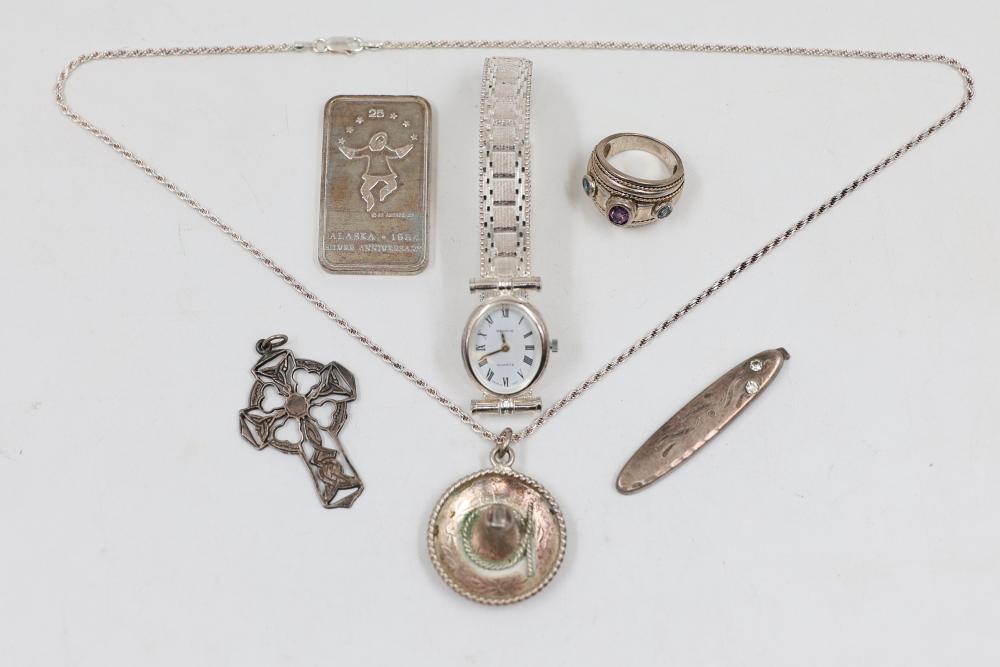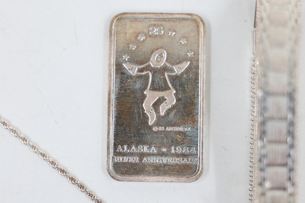 Sterling Silver Jewelry, 1984 Alaska Silver Bar, and 14k Stamped Ring. Includes a sterling silver Alaska 1984 25th Anniversary silver bar Stamped "Oxford", sterling stamped silver wristwatch, sterling silver chain necklace with pendant, sterling adn 14k stamped ring with purple and blue stones, and cross pendant. Sterling weight being 48 grams. Total weight being 103 grams.